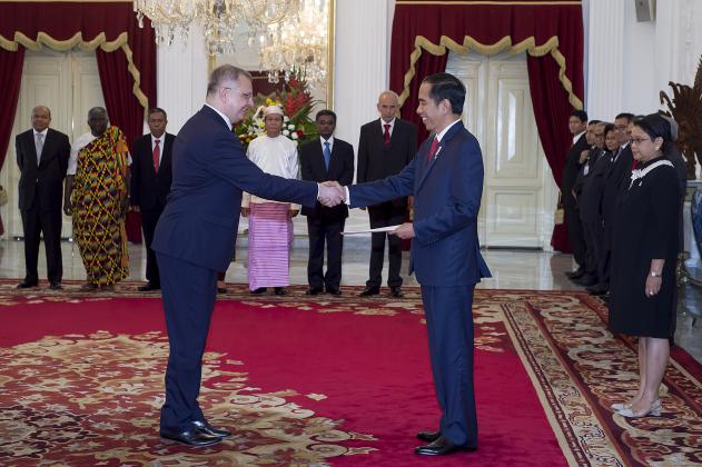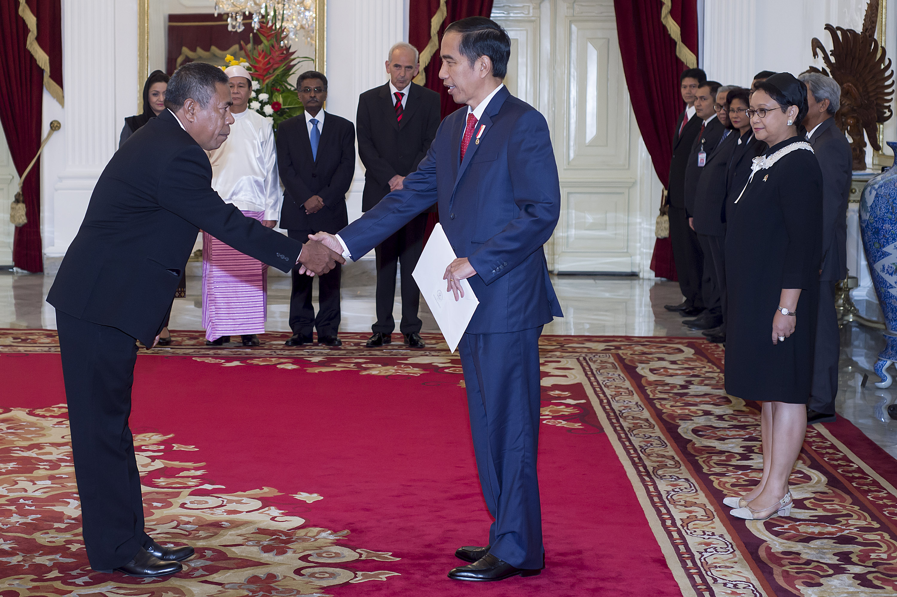 Presiden Joko Widodo (kedua kanan) didampingi Menlu Retno Marsudi (kanan) menerima Surat Kepercayaan dari Duta Besar Luar Biasa dan Berkuasa Penuh (LBBP) Timor Leste Alberto Xavier Pereira Carlos (kiri) di Istana Merdeka, Jakarta, Selasa (31/5). Presiden Joko Widodo juga menerima Surat Kepercayaan dari Dubes Serbia Slobodan Marinkovic, Dubes Ethiopia Arega Hailu Teffera, Dubes Myanmar Aung Htoo, Dubes Afghanistan Roya Rahmani, Dubes Ghana Benjamin Clement Eghan, Dubes Botswana Lapologang C. Lekoa dan Dubes Lithuania Egidijus Meilunas. ANTARA FOTO/Widodo S. Jusuf/aww/16.