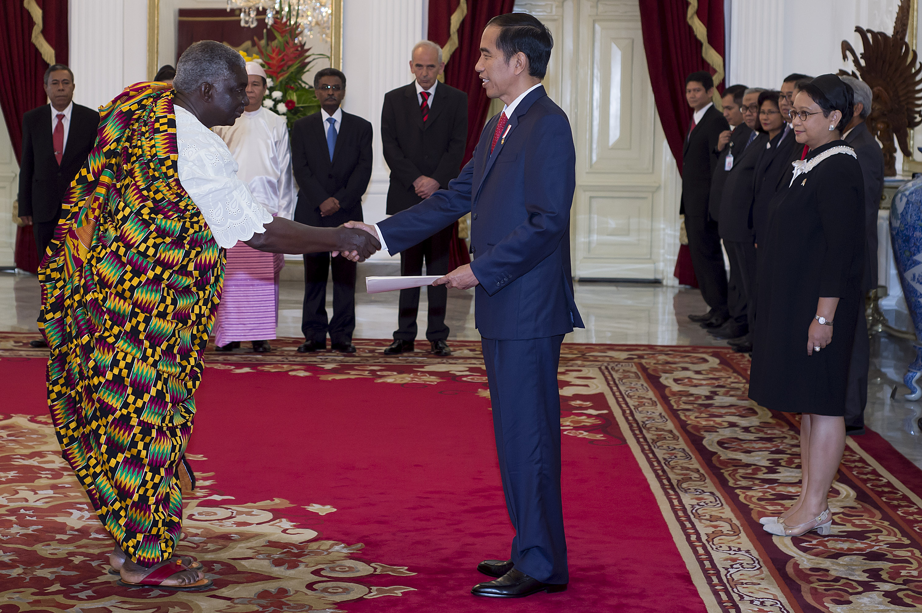 Presiden Joko Widodo (kedua kanan) didampingi Menlu Retno Marsudi (kanan) menerima Surat Kepercayaan dari Duta Besar Luar Biasa dan Berkuasa Penuh (LBBP) Ghana Benjamin Clement Eghan (kiri) di Istana Merdeka, Jakarta, Selasa (31/5). Presiden Joko Widodo juga menerima Surat Kepercayaan dari Dubes Serbia Slobodan Marinkovic, Dubes Ethiopia Arega Hailu Teffera, Dubes Myanmar Aung Htoo, Dubes Afghanistan Roya Rahmani, Dubes Timor Leste Alberto Xavier Pereira Carlos, Dubes Botswana Lapologang C. Lekoa dan Dubes Lithuania Egidijus Meilunas. ANTARA FOTO/Widodo S. Jusuf/aww/16.