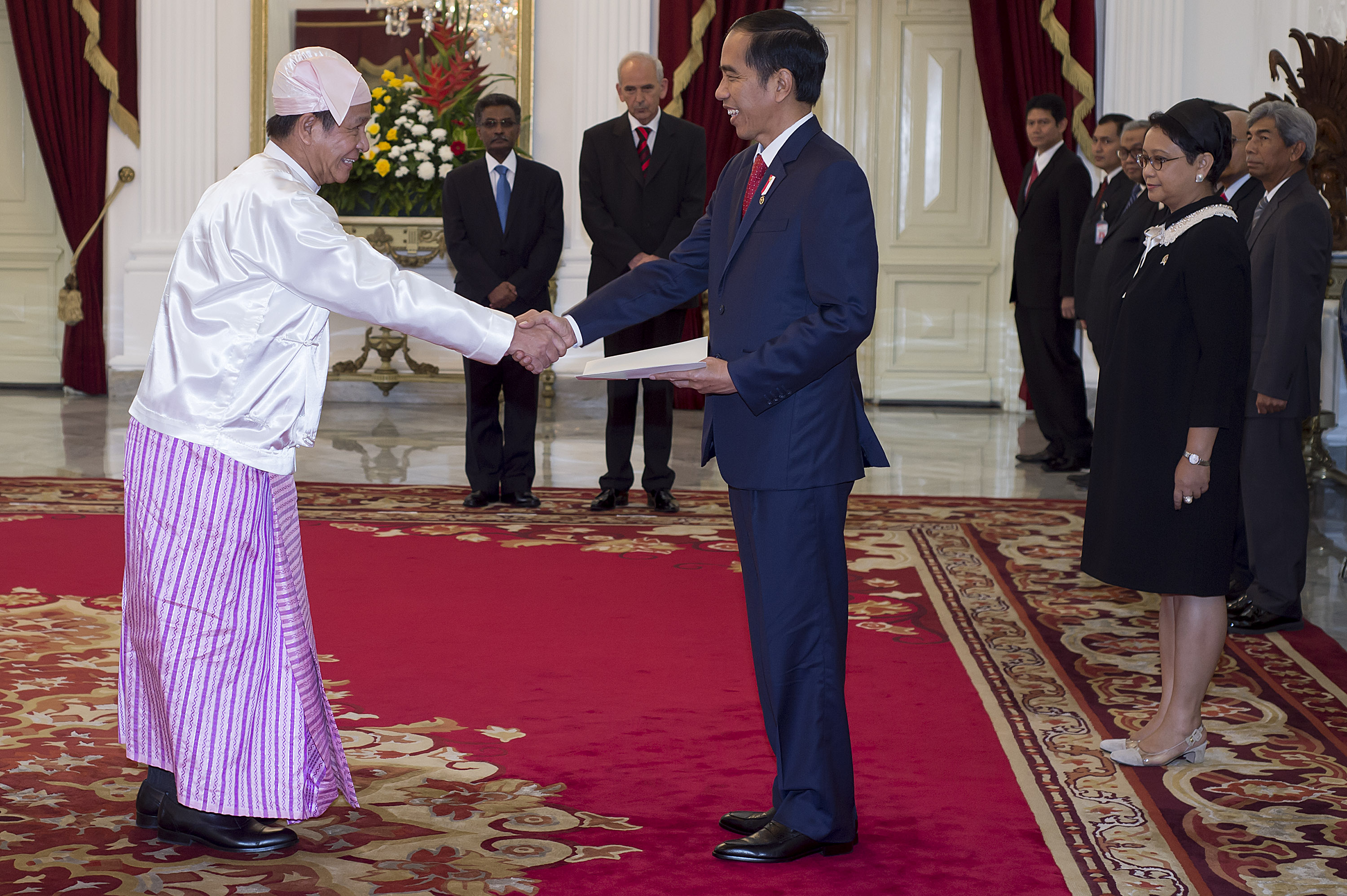 Presiden Joko Widodo (kedua kanan) didampingi Menlu Retno Marsudi (kanan) menerima Surat Kepercayaan dari Duta Besar Luar Biasa dan Berkuasa Penuh (LBBP) Myanmar Aung Htoo (kiri) di Istana Merdeka, Jakarta, Selasa (31/5). Presiden Joko Widodo juga menerima Surat Kepercayaan dari Dubes Serbia Slobodan Marinkovic, Dubes Ethiopia Arega Hailu Teffera, Dubes Afghanistan Roya Rahmani, Dubes Timor Leste Alberto Xavier Pereira Carlos, Dubes Ghana Benjamin Clement Eghan, Dubes Botswana Lapologang C. Lekoa dan Dubes Lithuania Egidijus Meilunas. ANTARA FOTO/Widodo S. Jusuf/aww/16.