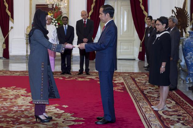 Presiden Joko Widodo (kedua kanan) didampingi Menlu Retno Marsudi (kanan) menerima Surat Kepercayaan dari Duta Besar Luar Biasa dan Berkuasa Penuh (LBBP) Afghanistan Roya Rahmani (kiri) di Istana Merdeka, Jakarta, Selasa (31/5). Presiden Joko Widodo juga menerima Surat Kepercayaan dari Dubes Serbia Slobodan Marinkovic, Dubes Ethiopia Arega Hailu Teffera, Dubes Myanmar Aung Htoo, Dubes Timor Leste Alberto Xavier Pereira Carlos, Dubes Ghana Benjamin Clement Eghan, Dubes Botswana Lapologang C. Lekoa dan Dubes Lithuania Egidijus Meilunas. ANTARA FOTO/Widodo S. Jusuf/aww/16.