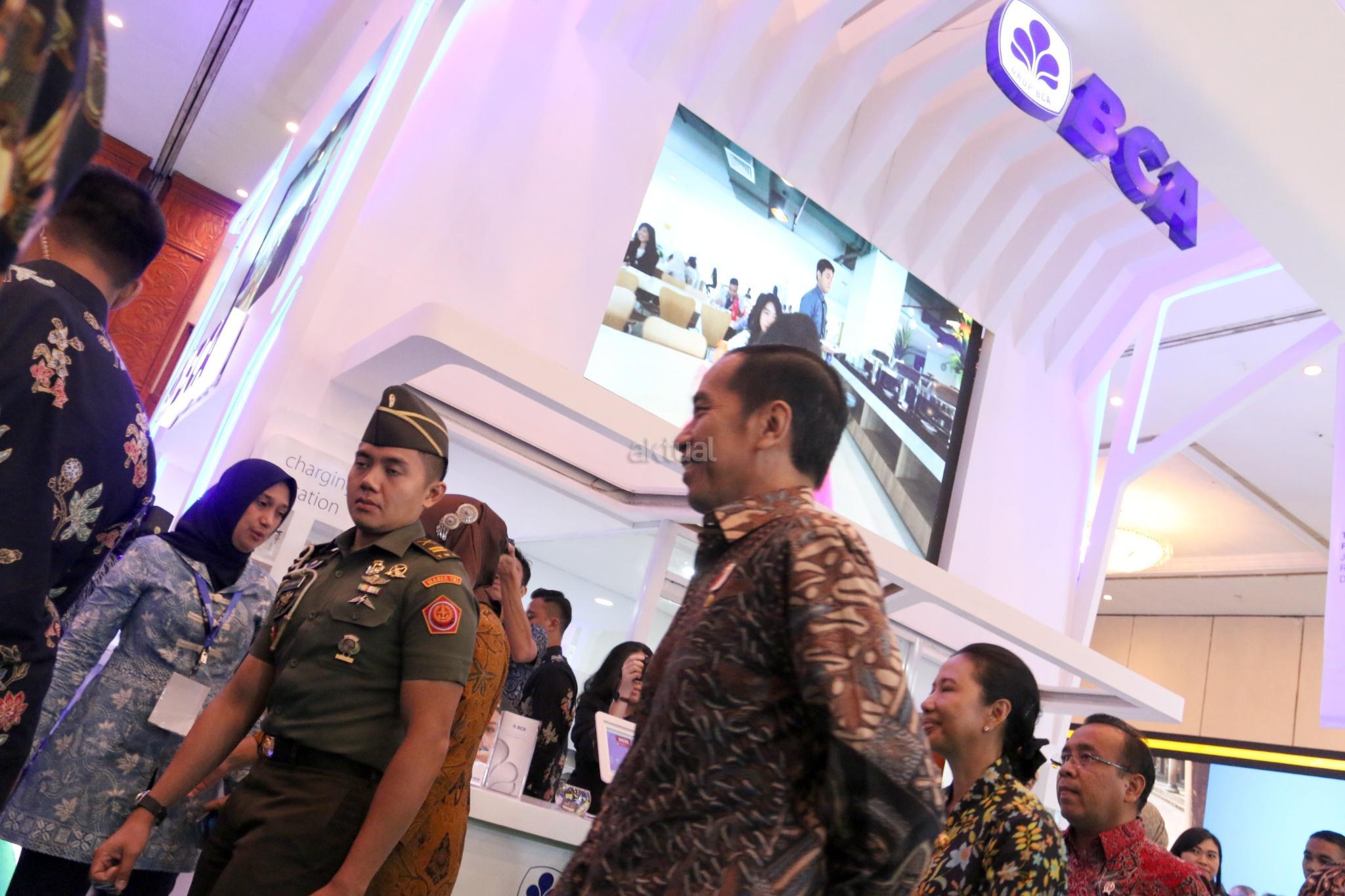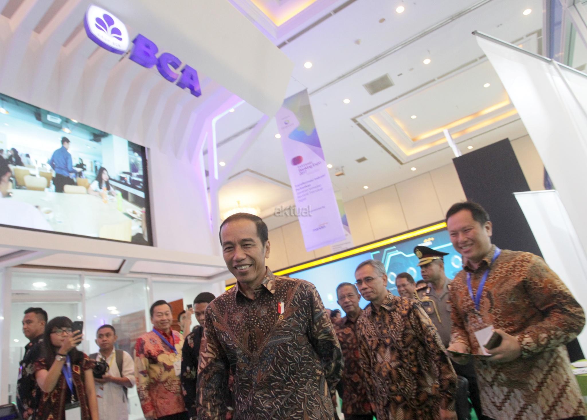 Presiden Republik Indonesia Joko Widodo usai mengunjungi booth disambut oleh Direktur PT Bank Central Asia Tbk (BCA) Santoso dalam acara Indonesia Banking Expo 2017 di Jakarta Convention Center, Rabu (20/9). Mengangkat tema “Transformasi Industri Perbankan Jawaban Terhadap Revolusi Teknologi Digital”, IBEX 2017 digelar selama dua hari pada tanggal 19 dan 20 September sebagai wujud komitmen pelaku perbankan Indonesia, bersama-sama dengan pelaku usaha dari berbagai bidang, untuk mengusung inovasi teknologi sistem pembayaran yang sesuai dengan perubahan perilaku konsumen ke arah digitalisasi. AKTUAL/Eko S Hilman