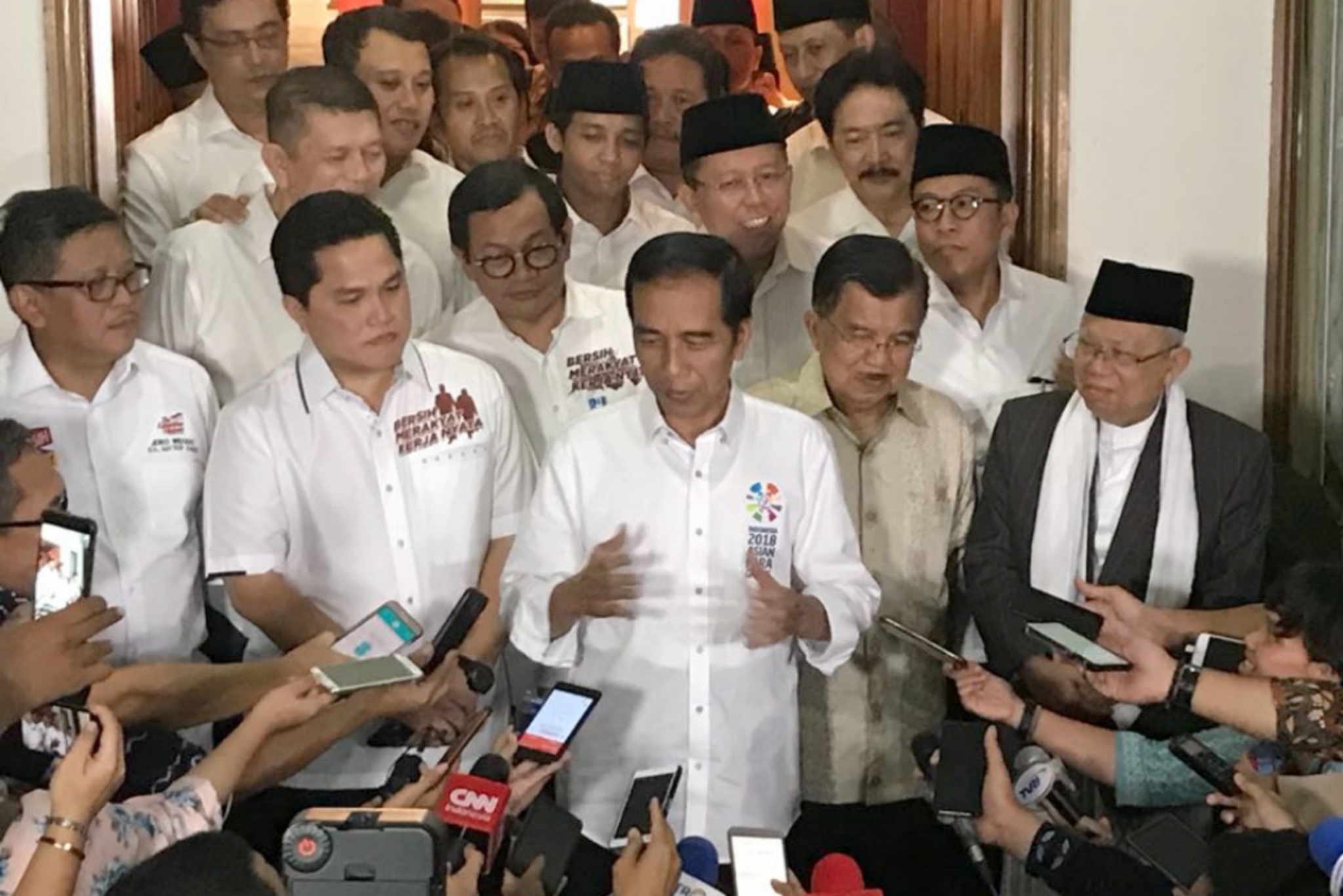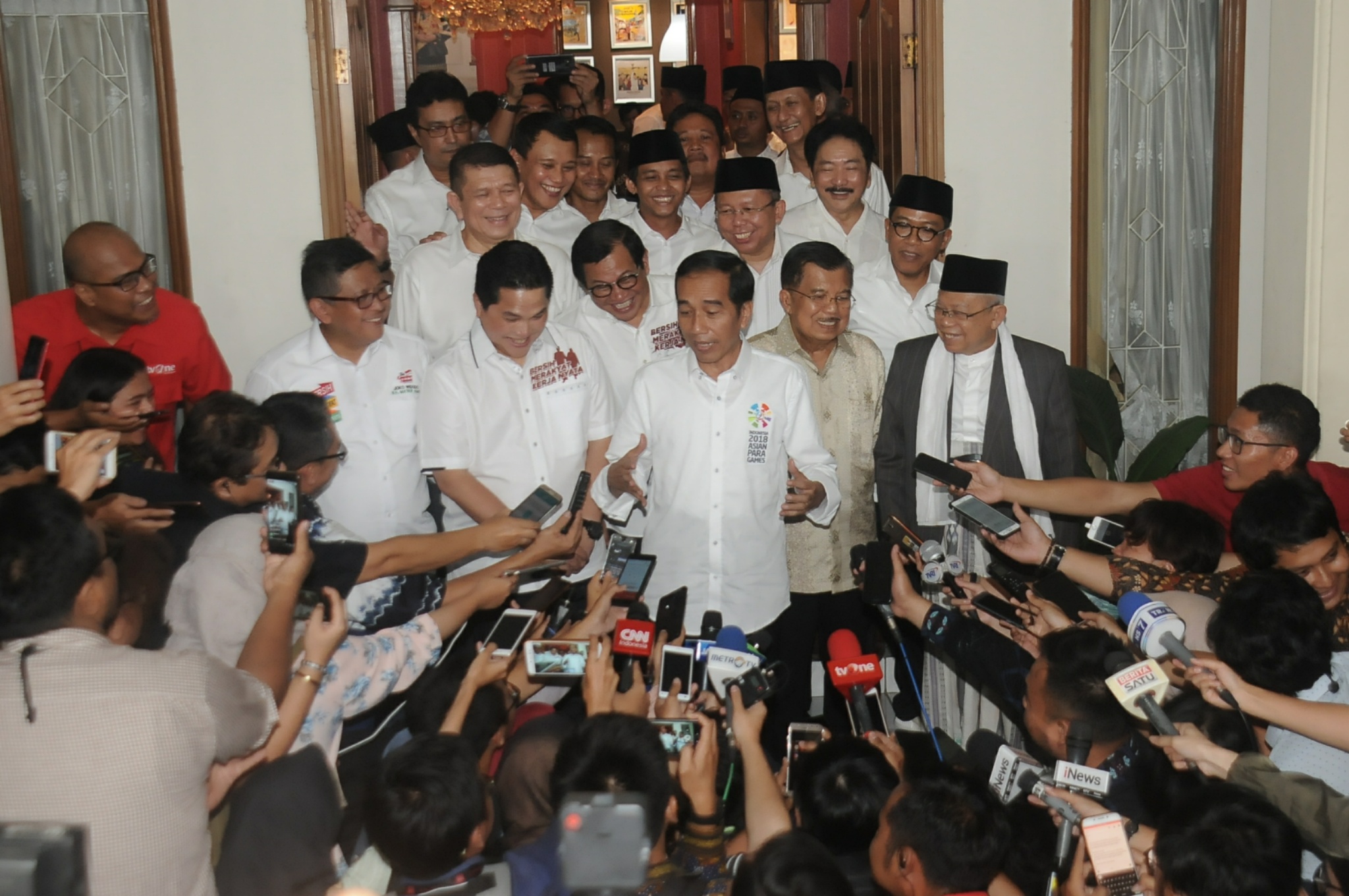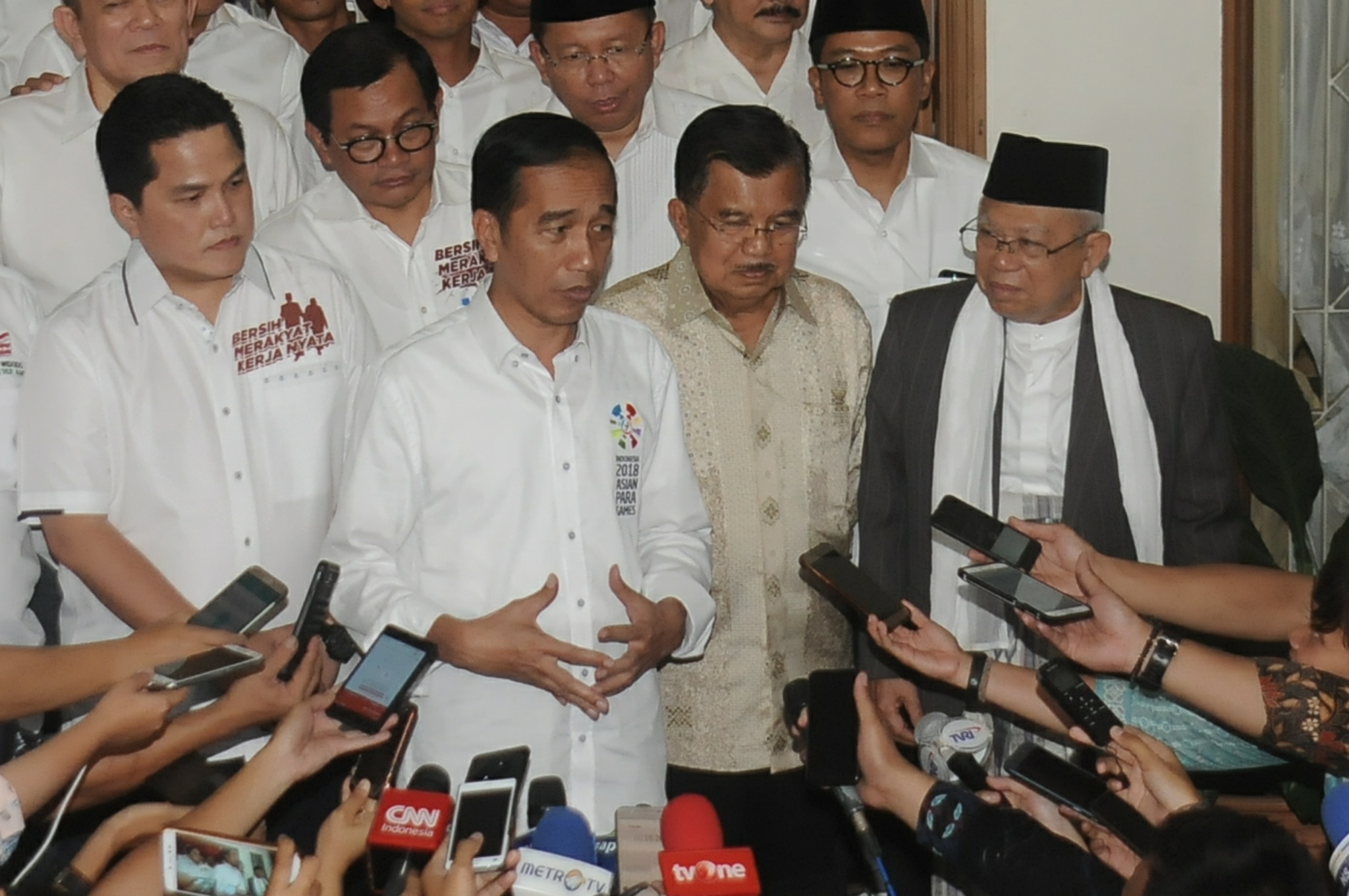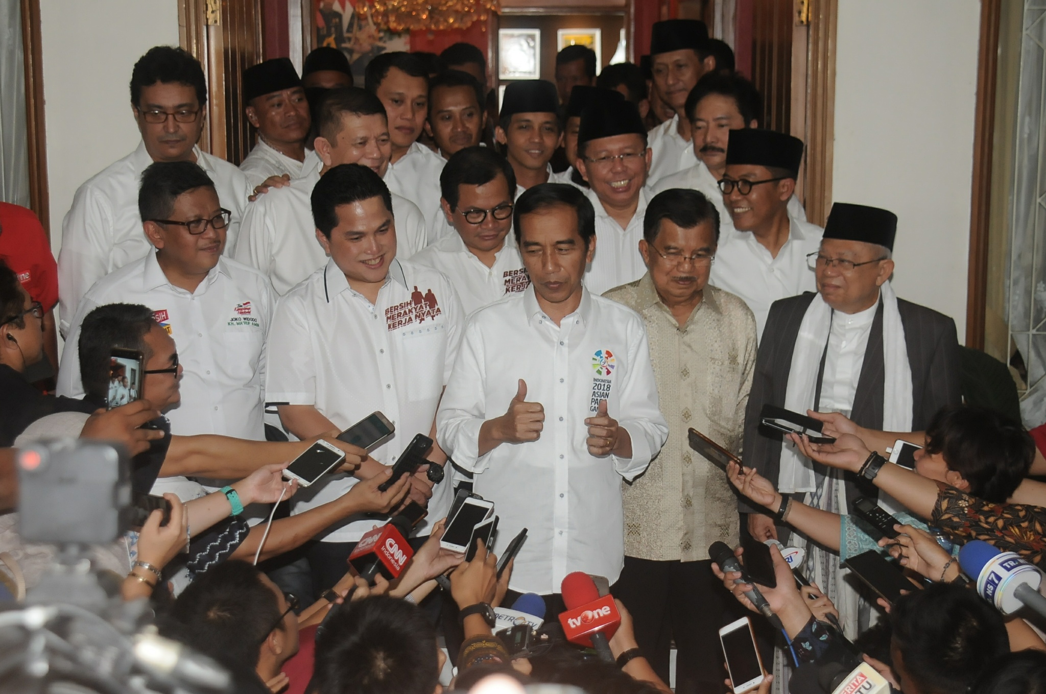 Bakal Capres Joko Widodo didampingi Bakal Cawapres Ma'ruf Amin bersama Ketua Tim Pemenangan Jokowi Erick Thohir dan Ketua Dewan Pengarah Jusuf Kalla menjawab pertanyaan wartawan usai mengumumkan struktur tim pemenangan di rumah pemenangan, Jalan Cemara, Jakarta Pusat, Jumat (7/9/2018). Erick Thohir hadir langsung saat pengumuman bersama sekjen partai pengusung dan pendukung Jokowi-Ma'ruf yang tergabung dalam Koalisi Indonesia Kerja (KIK). AKTUAL/Tino Oktaviano