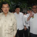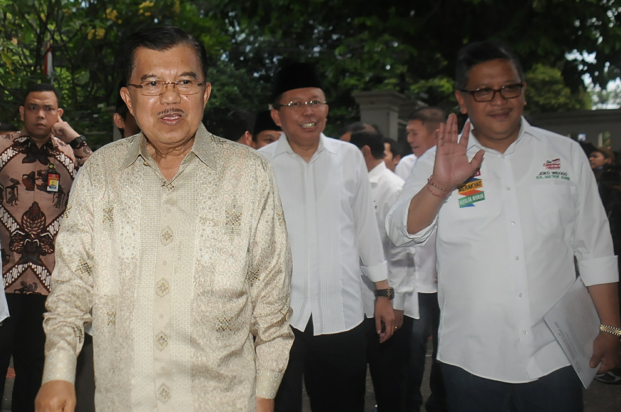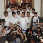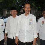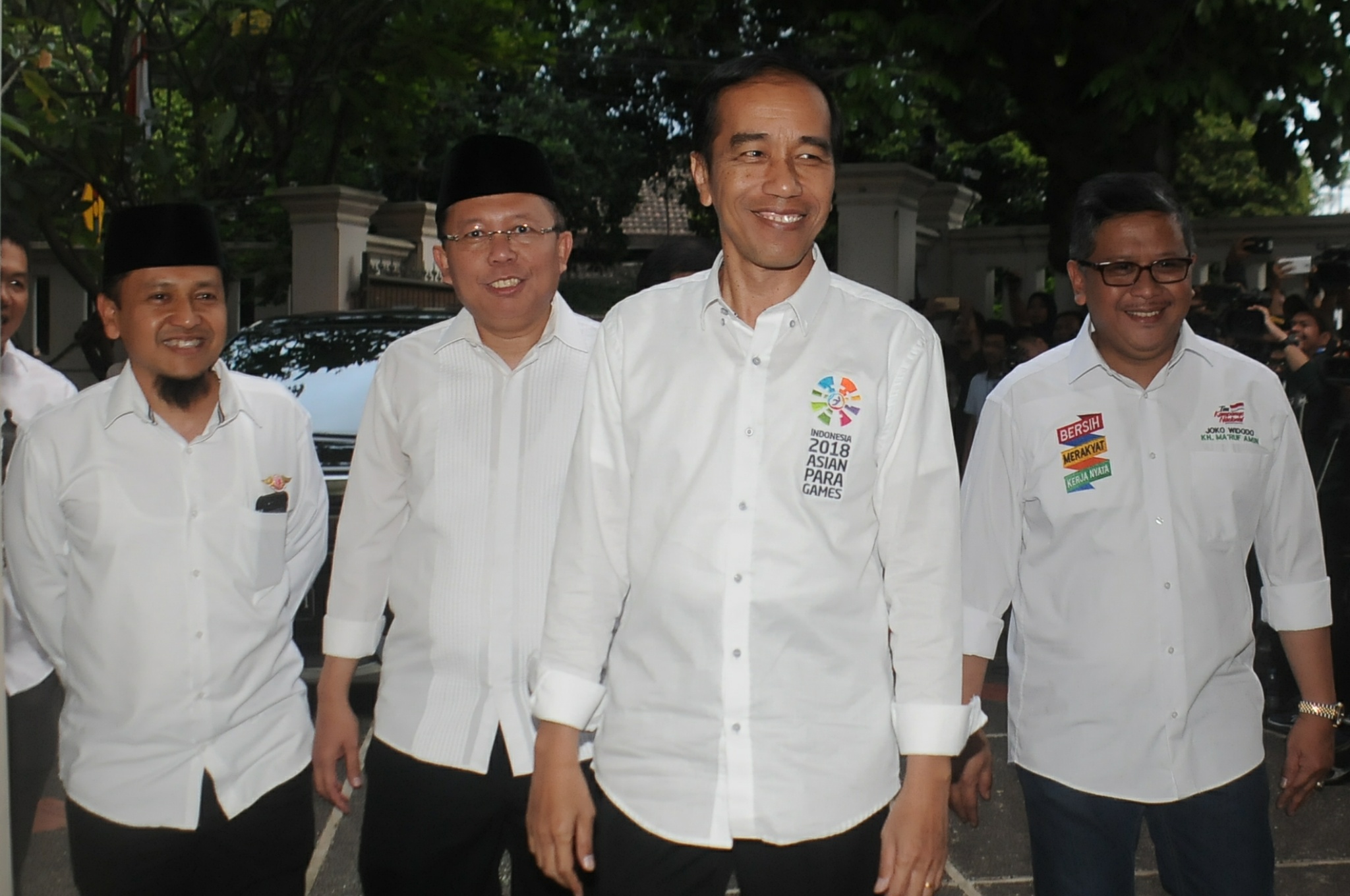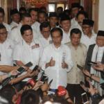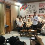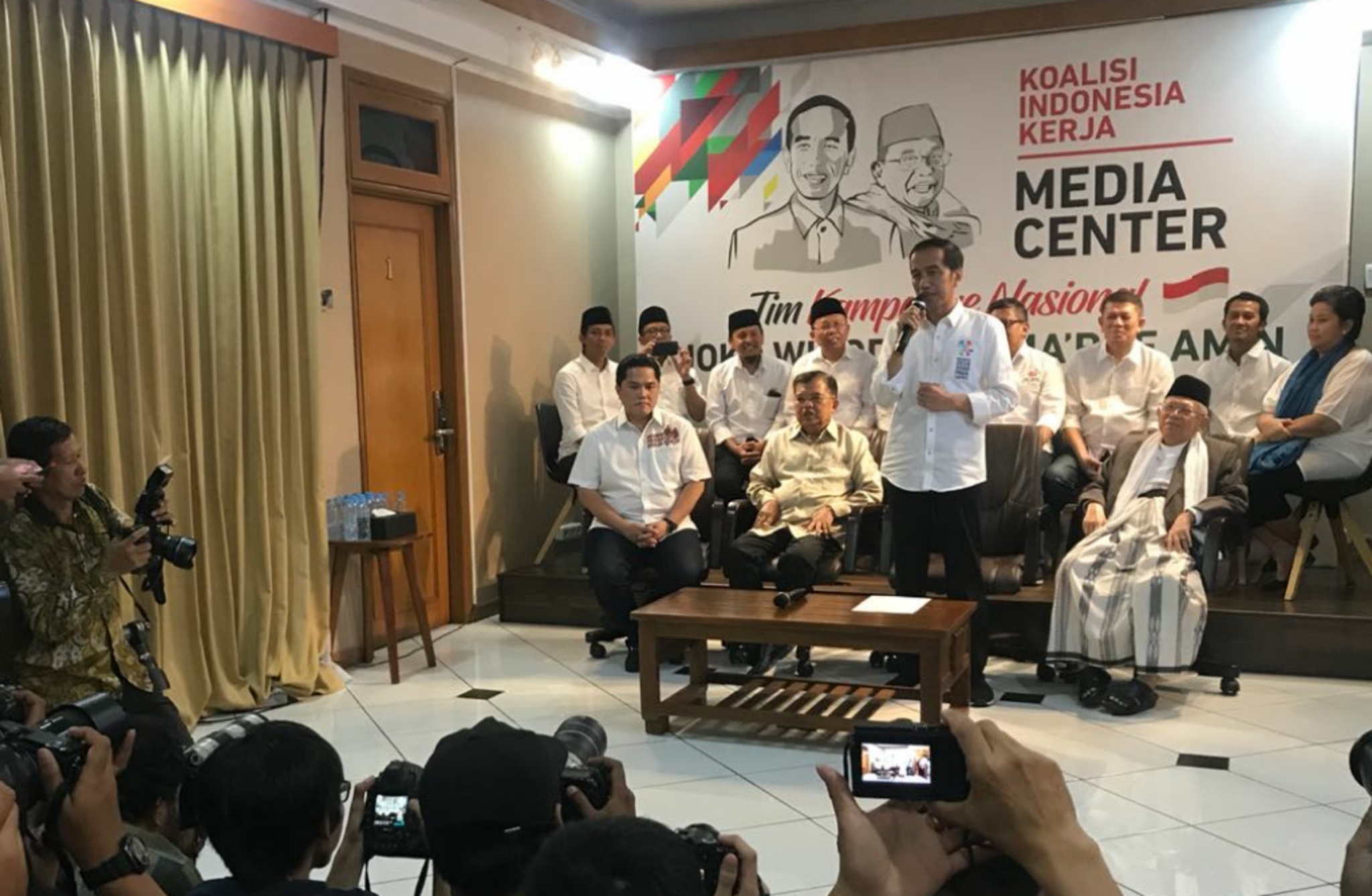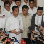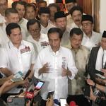 Bakal Capres Joko Widodo didampingi Bakal Cawapres Ma'ruf Amin bersama Ketua Tim Pemenangan Jokowi Erick Thohir dan Ketua Dewan Pengarah Jusuf Kalla menjawab pertanyaan wartawan usai mengumumkan struktur tim pemenangan di rumah pemenangan, Jalan Cemara, Jakarta Pusat, Jumat (7/9/2018). Erick Thohir hadir langsung saat pengumuman bersama sekjen partai pengusung dan pendukung Jokowi-Ma'ruf yang tergabung dalam Koalisi Indonesia Kerja (KIK). AKTUAL/Tino Oktaviano