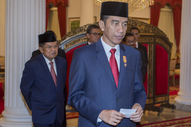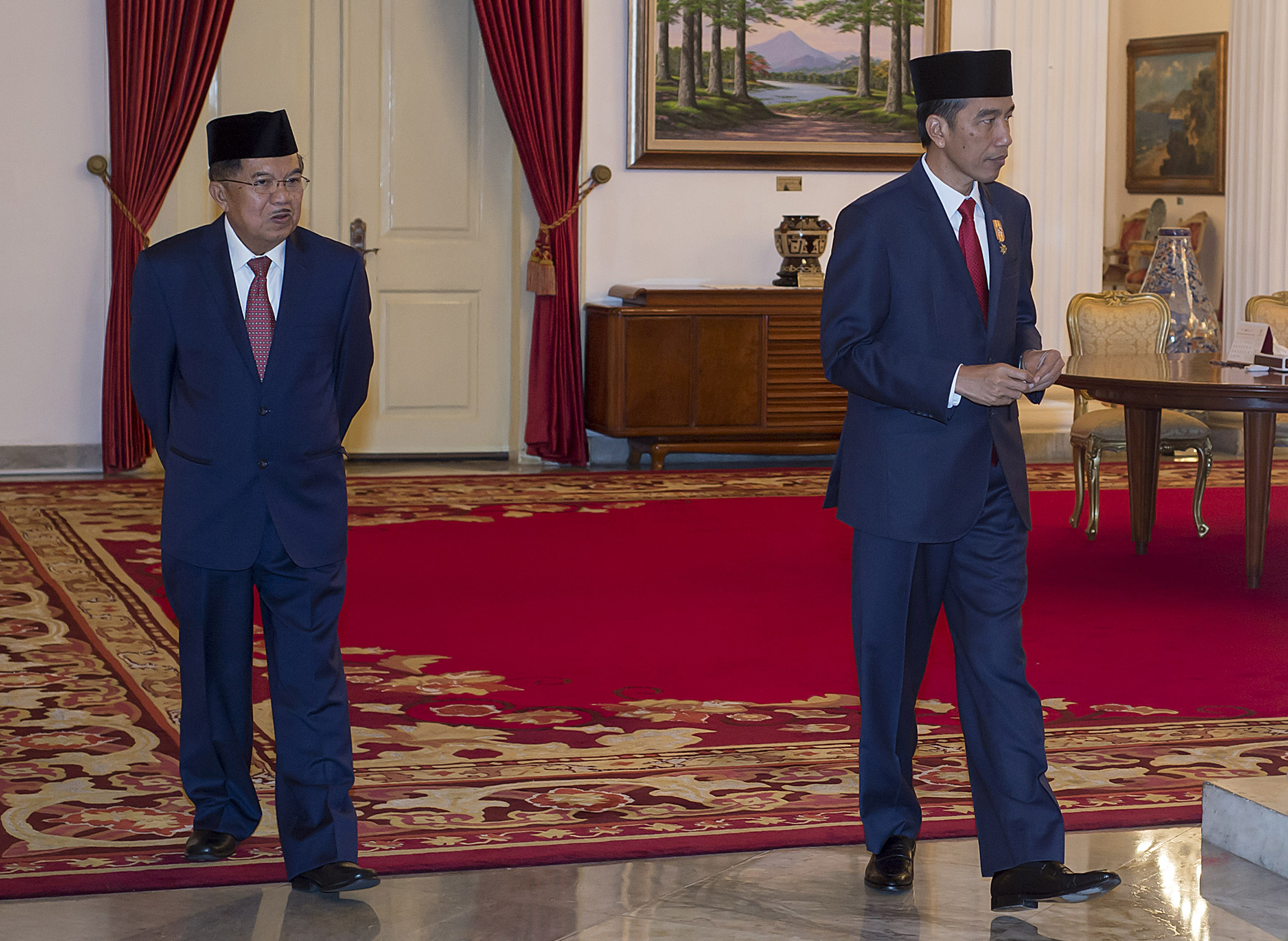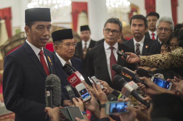 Presiden Joko Widodo (kanan) didampingi Wakil Presiden Jusuf Kalla (kiri) bersiap memberikan keterangan pers di Istana Negara, Jakarta, Kamis (16/6). Presiden Joko Widodo telah mengajukan Kepala BNPT Komjen Pol Tito Karnavian sebagai calon tunggal Kapolri kepada DPR untuk menggantikan Jenderal Pol Badrodin Haiti yang akan segera memasuki masa pensiun. ANTARA FOTO/Widodo S. Jusuf/aww/16.