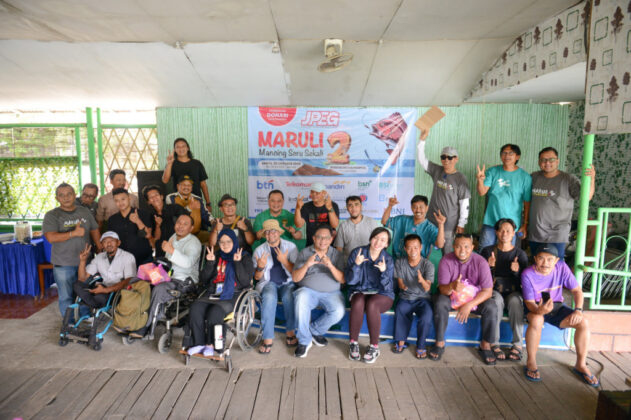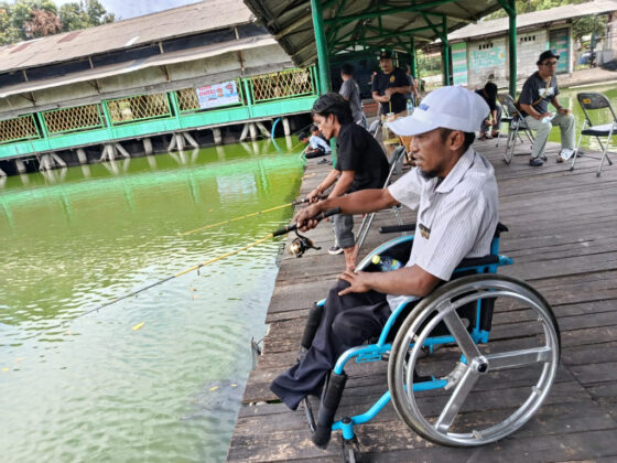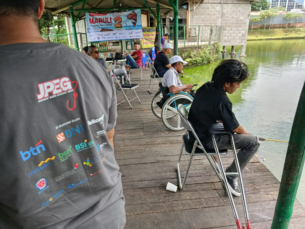 External Communications Telkomsel Anisa Molyna bersama Corporate Secretary PT Bekasi Fajar Industrial Estate Tbk Herdian, berbincang dengan penyandang disabilitas dalam rangka turnamen mancing bersama Journalist Photo Economic Group (JPEG), di Jakarta, Sabtu (25/10/2025).