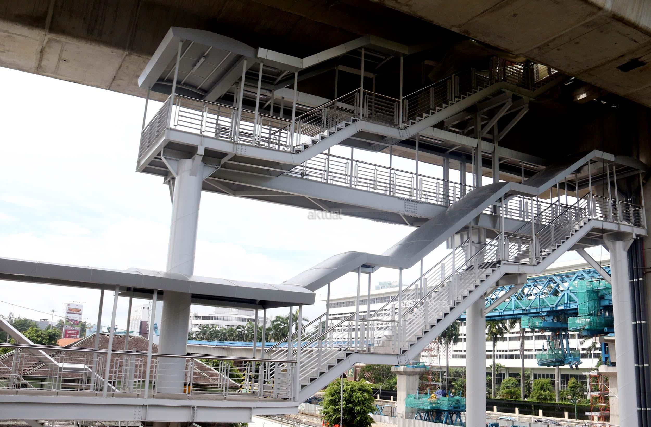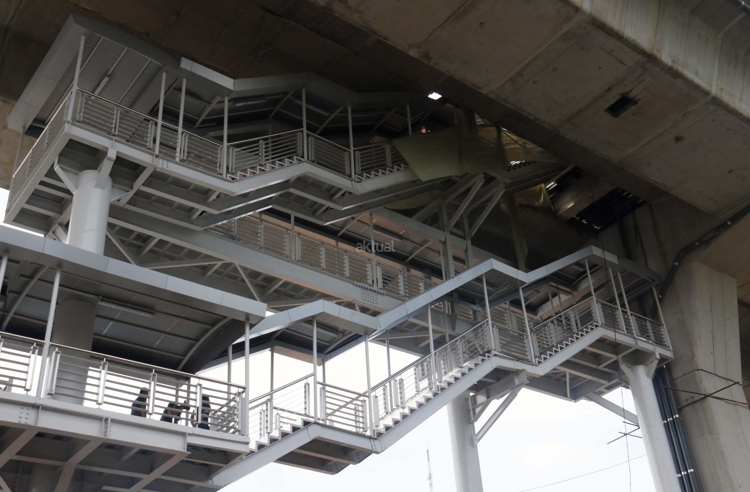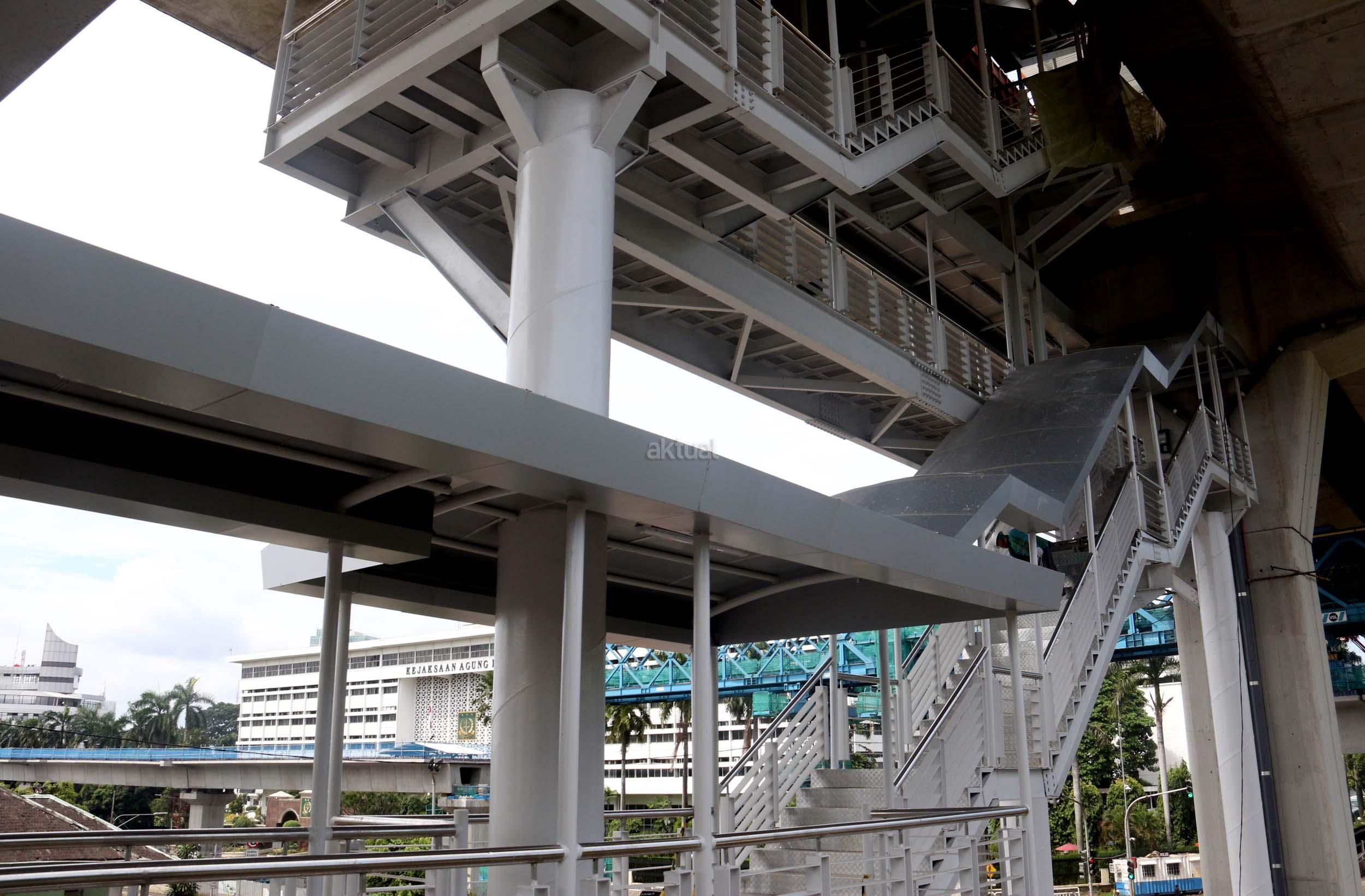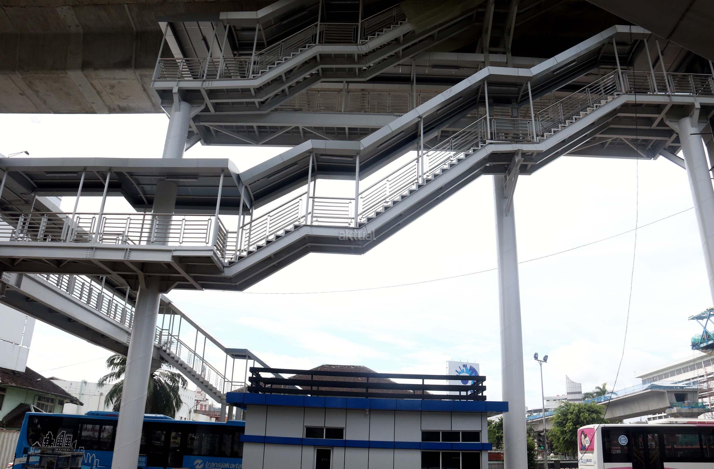 Suasana pembangunan Jembatan Penyeberangan Orang (JPO) halte layangTransjakarta CSW di Kebayoran Baru, Jakarta, Kamis (12/1/2017). Untuk mencapai halte tersebut, calon penumpang bus Trans-Jakarta harus melewati 130 anak tangga. AKTUAL/Munzir