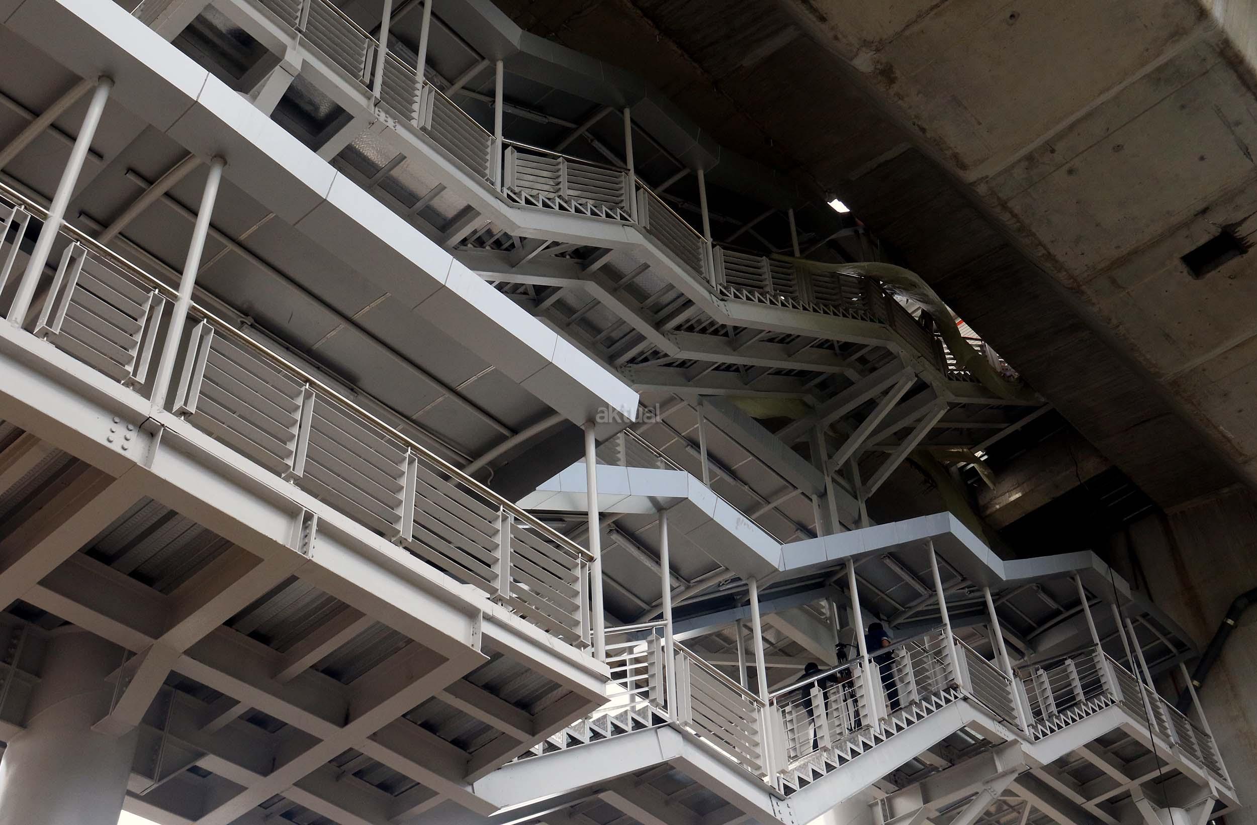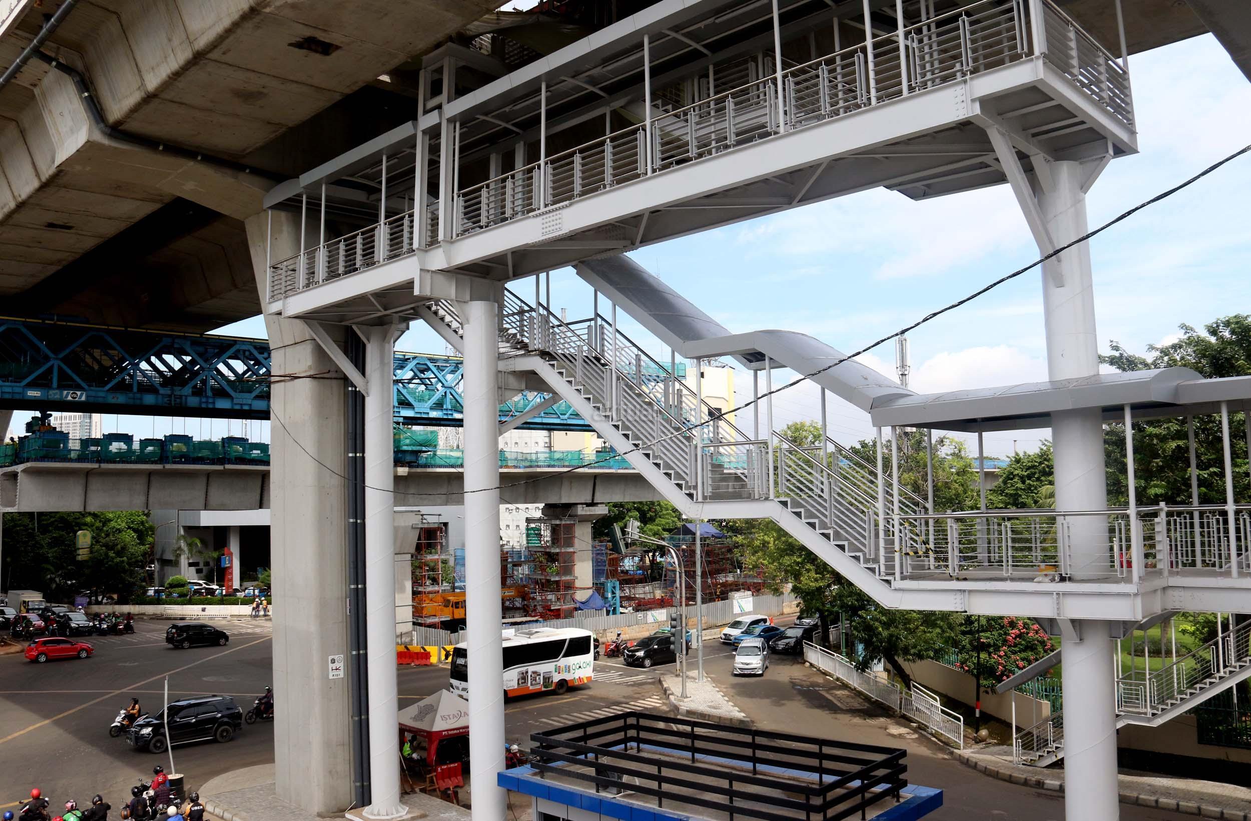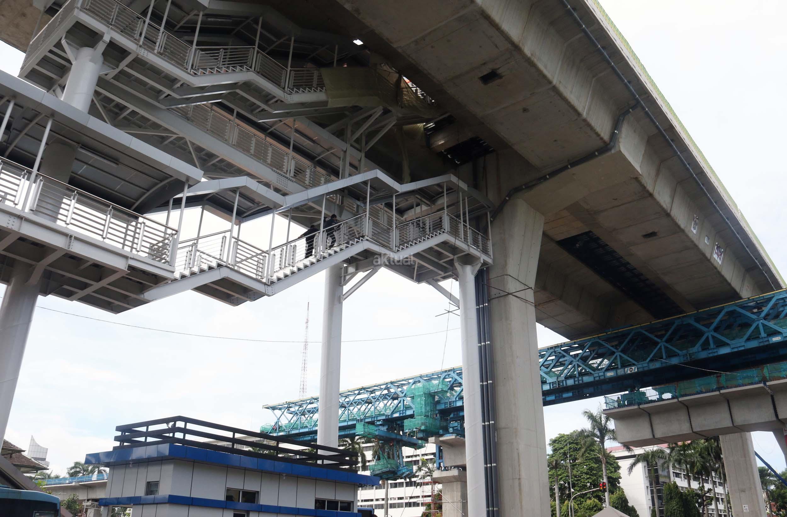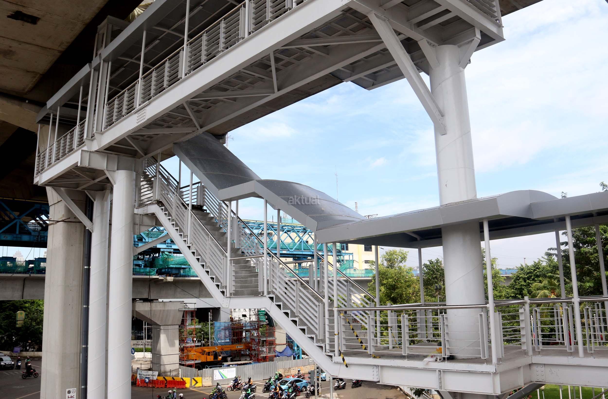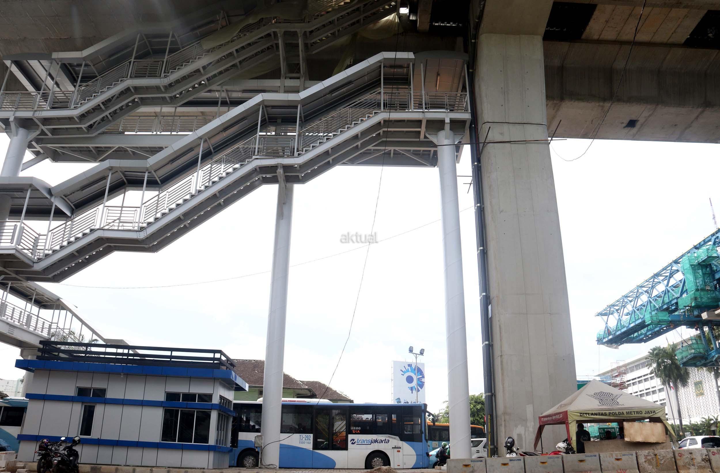 Suasana pembangunan Jembatan Penyeberangan Orang (JPO) halte layangTransjakarta CSW di Kebayoran Baru, Jakarta, Kamis (12/1/2017). Untuk mencapai halte tersebut, calon penumpang bus Trans-Jakarta harus melewati 130 anak tangga. AKTUAL/Munzir