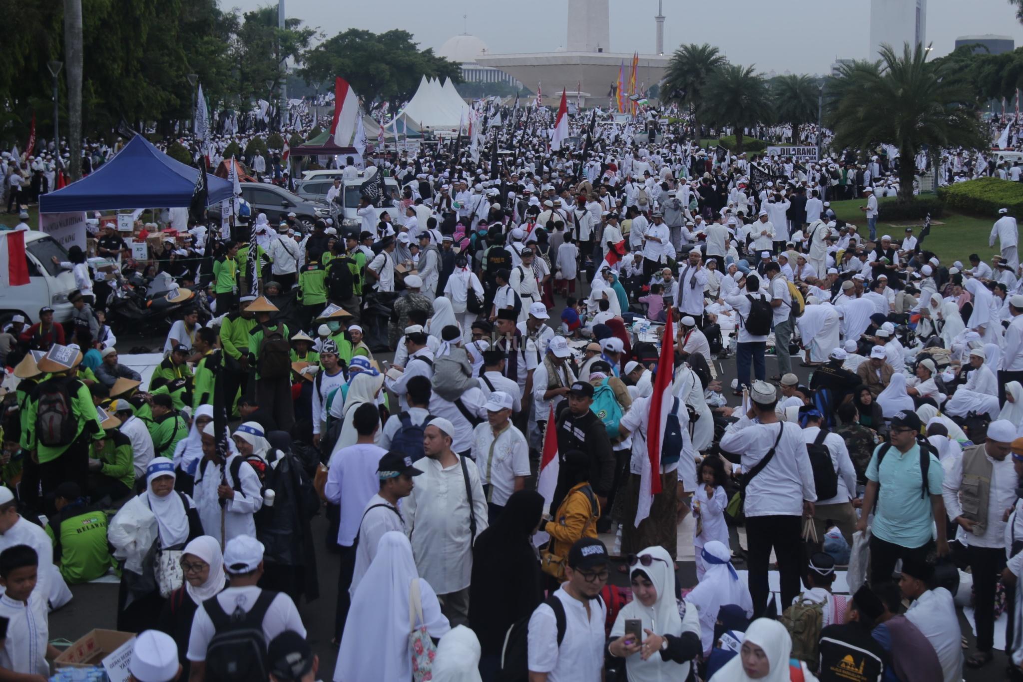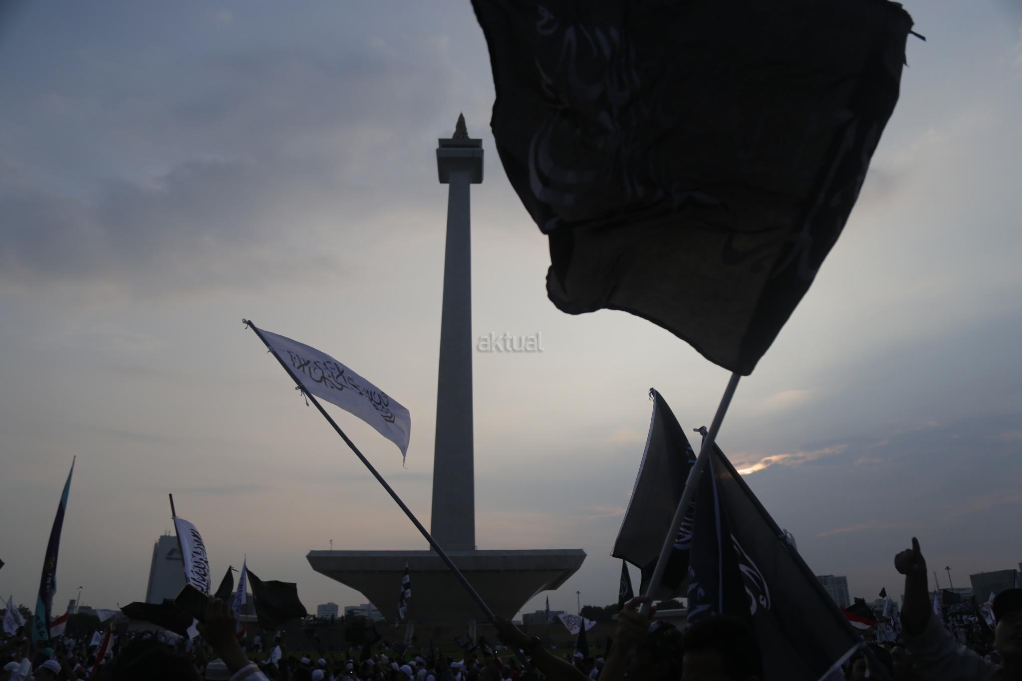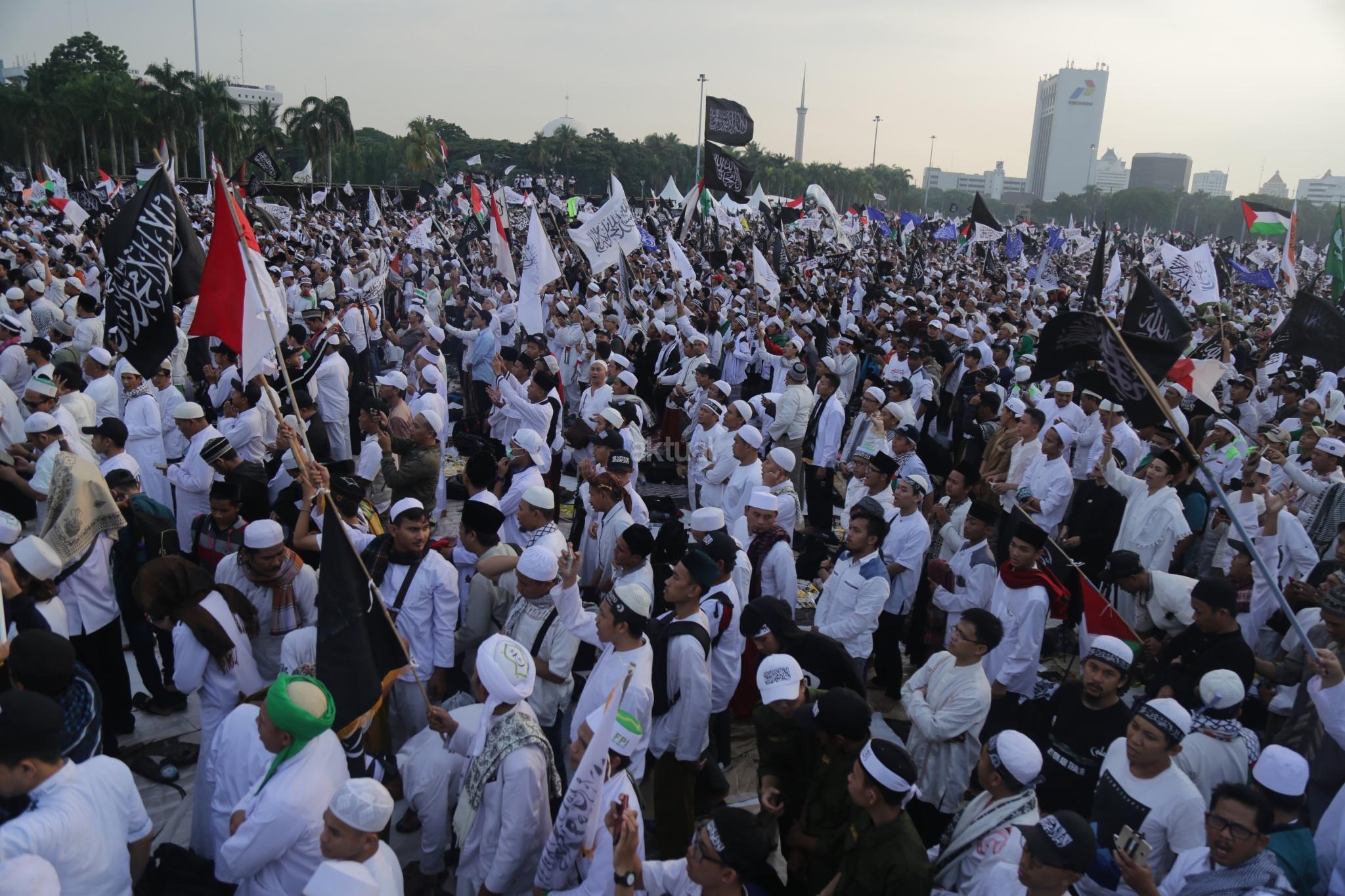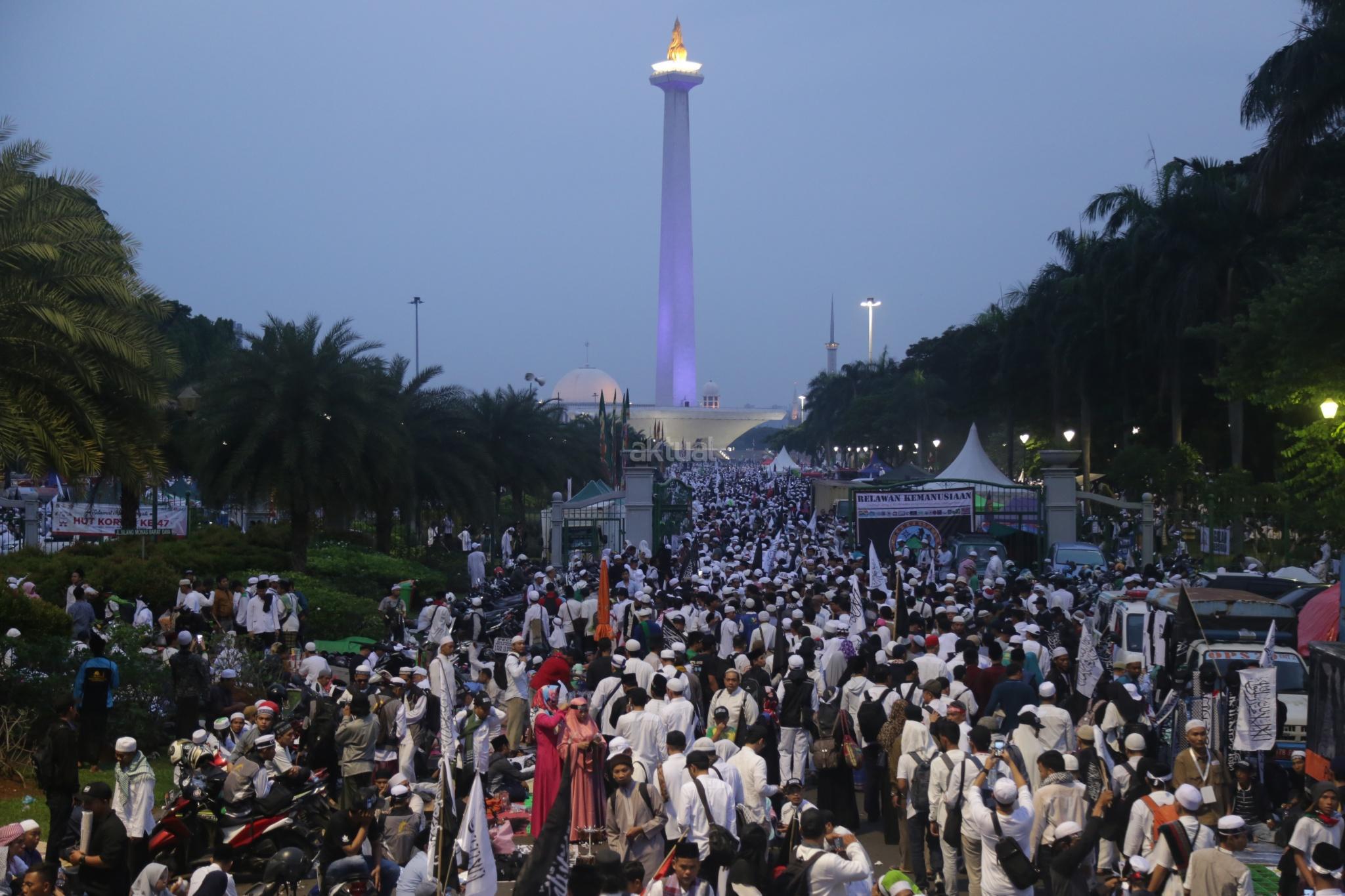 Jutaan umat muslim melaksanakan Reuni 212 memadati Kawasan Monas, Jakarta Pusat, Minggu (2/12/2018). Tidak hanya membawa bendera tauhid, para jamaah juga selalu meneriakan takbir “Allahuakbar”, dan melantunkan beberapa salawatan bersama. AKTUAL/Tino Oktaviano
