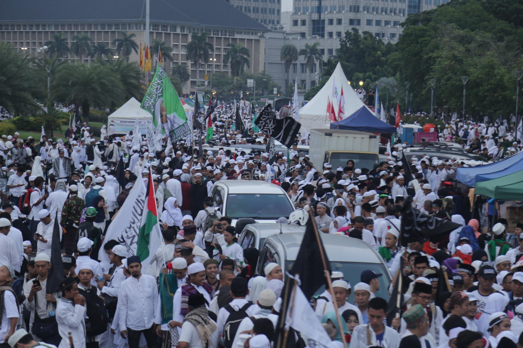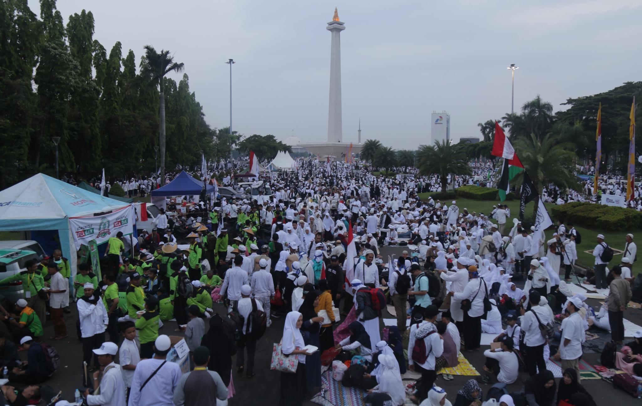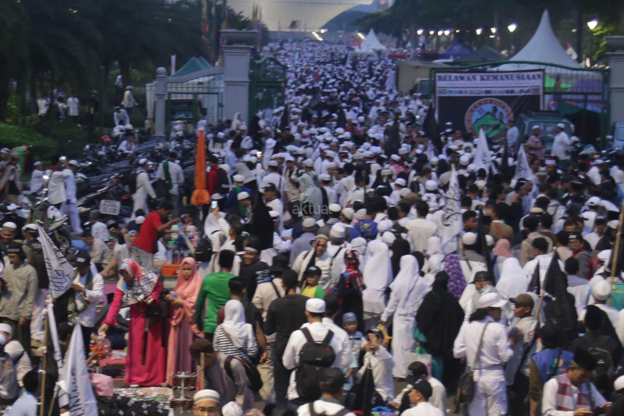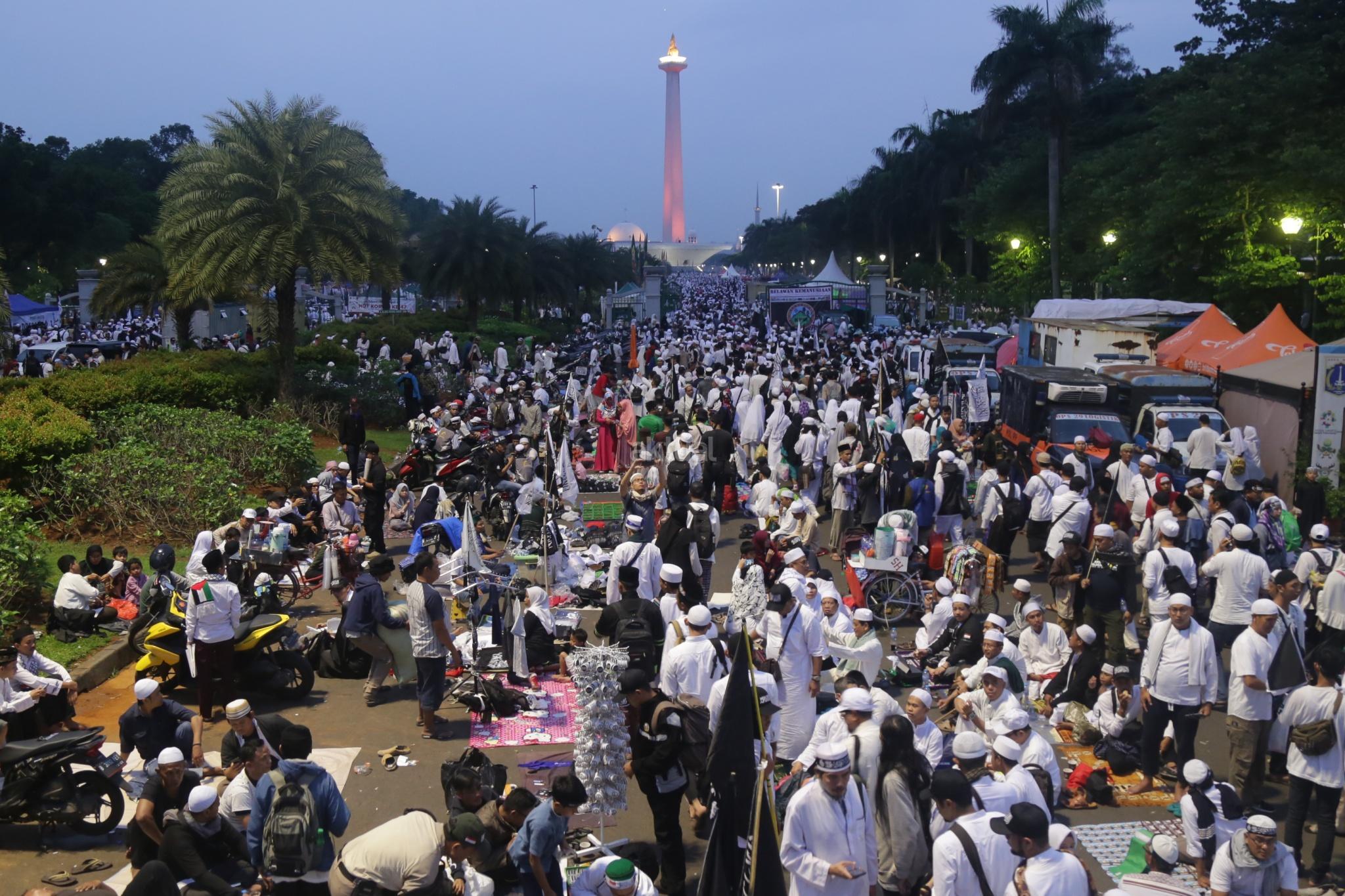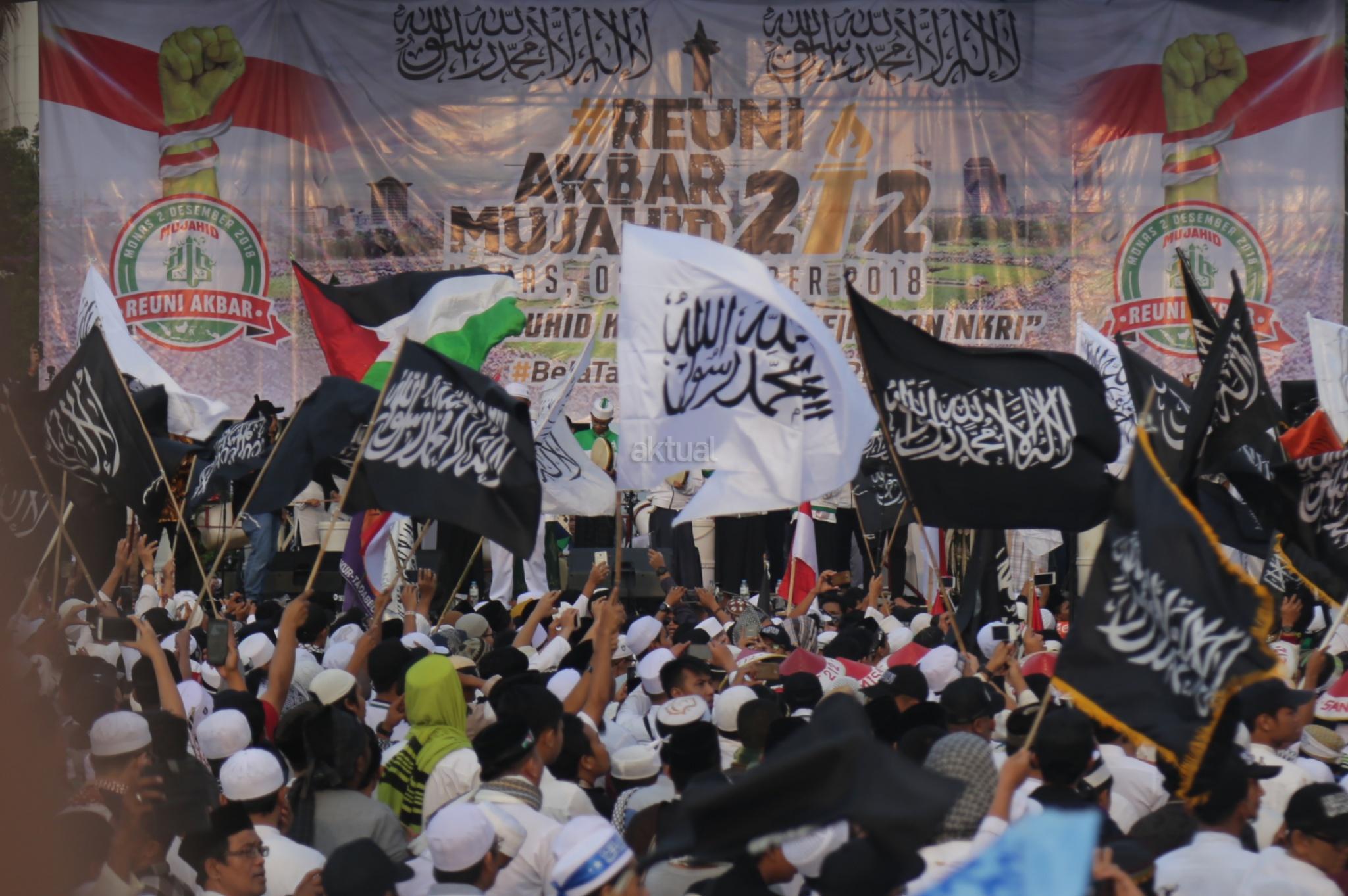 Jutaan umat muslim melaksanakan Reuni 212 memadati Kawasan Monas, Jakarta Pusat, Minggu (2/12/2018). Tidak hanya membawa bendera tauhid, para jamaah juga selalu meneriakan takbir “Allahuakbar”, dan melantunkan beberapa salawatan bersama. AKTUAL/Tino Oktaviano