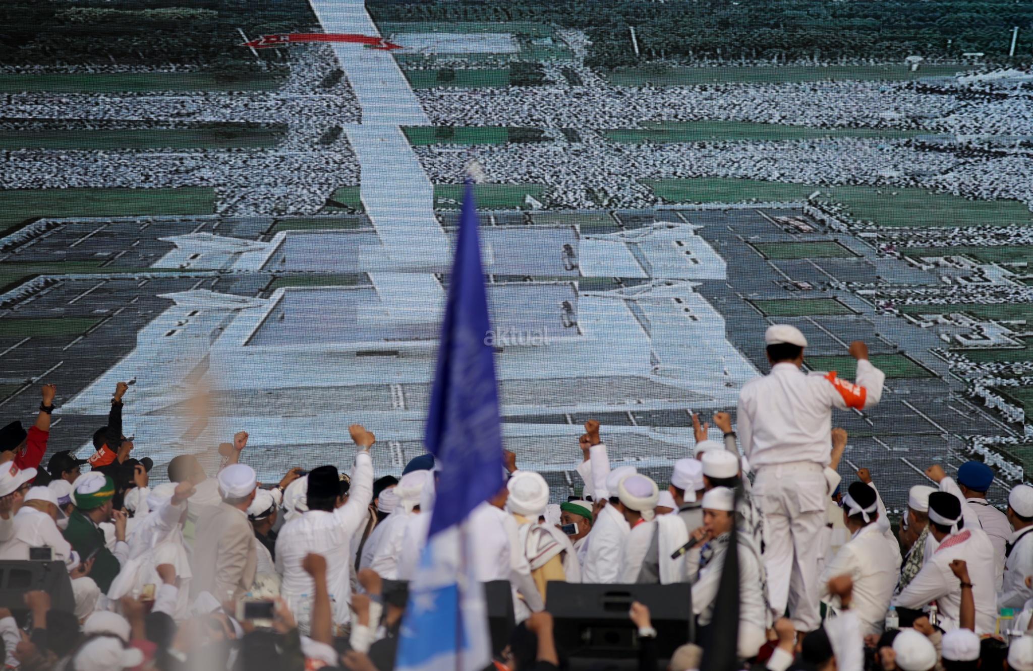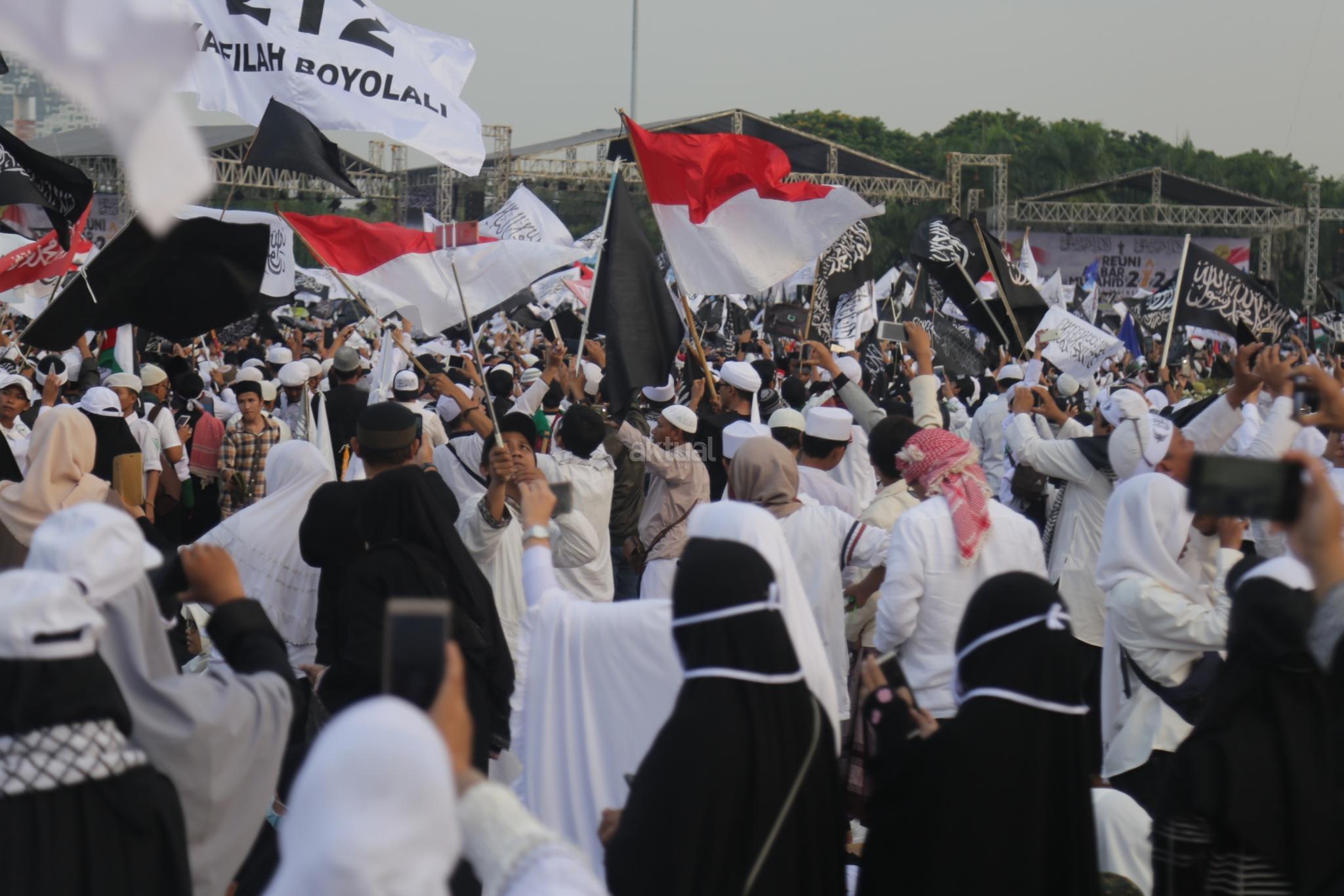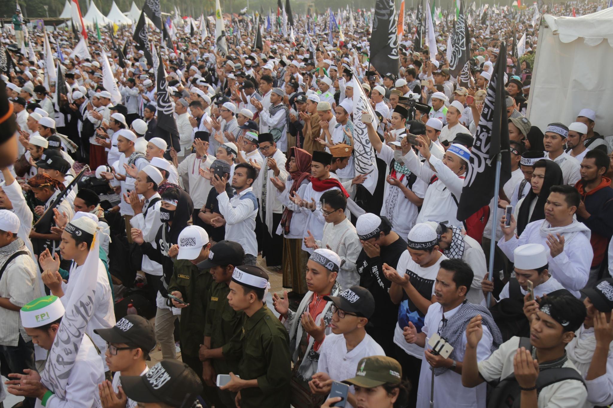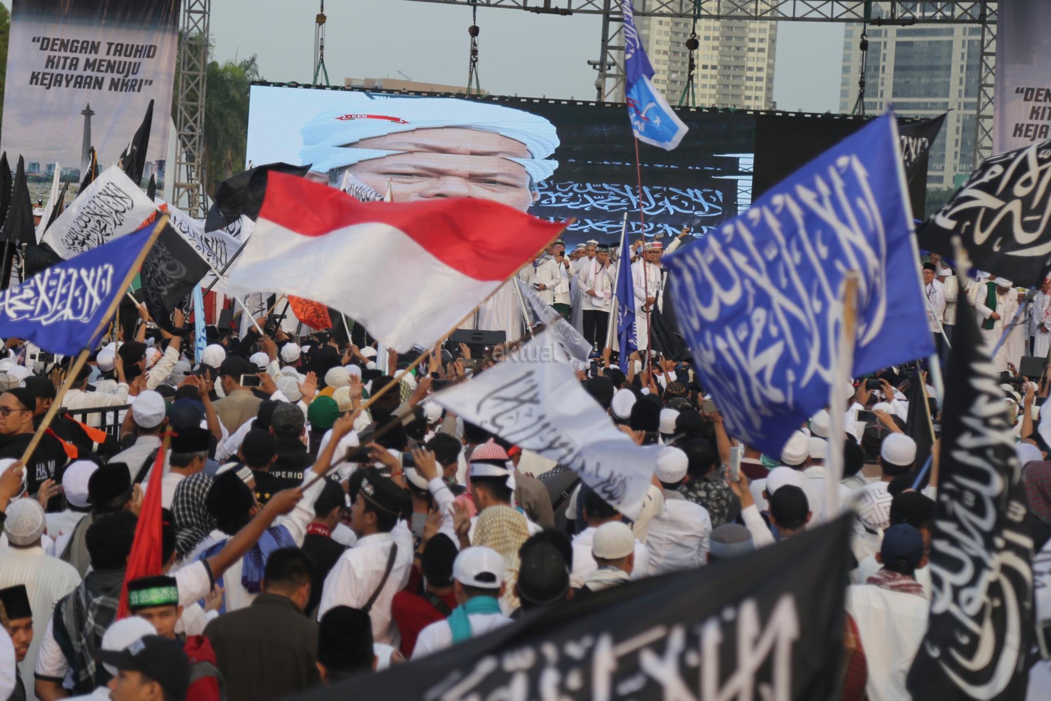Jutaan umat muslim melaksanakan Reuni 212 memadati Kawasan Monas, Jakarta Pusat, Minggu (2/12/2018). Tidak hanya membawa bendera tauhid, para jamaah juga selalu meneriakan takbir “Allahuakbar”, dan melantunkan beberapa salawatan bersama. AKTUAL/Tino Oktaviano