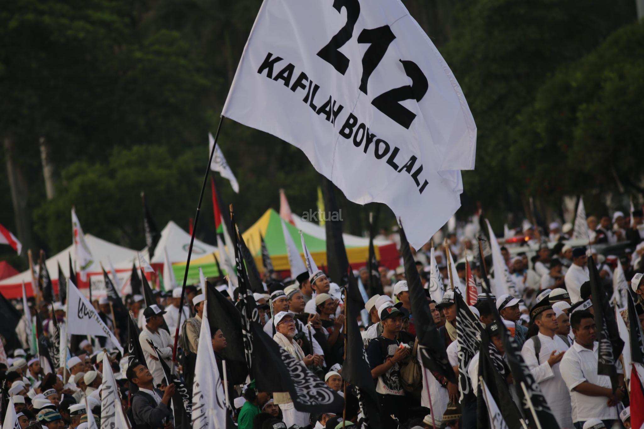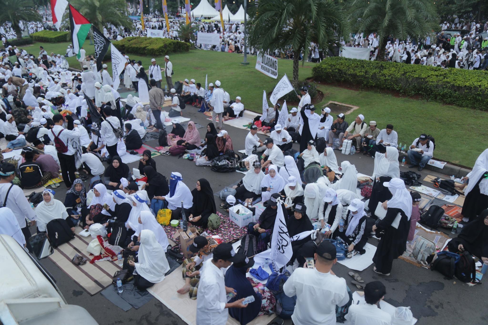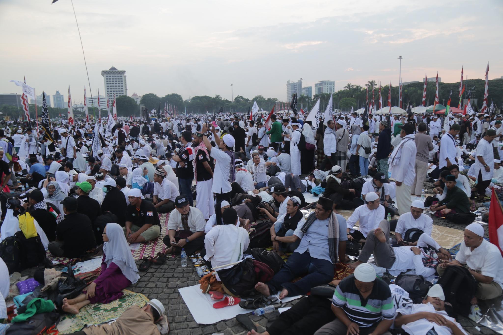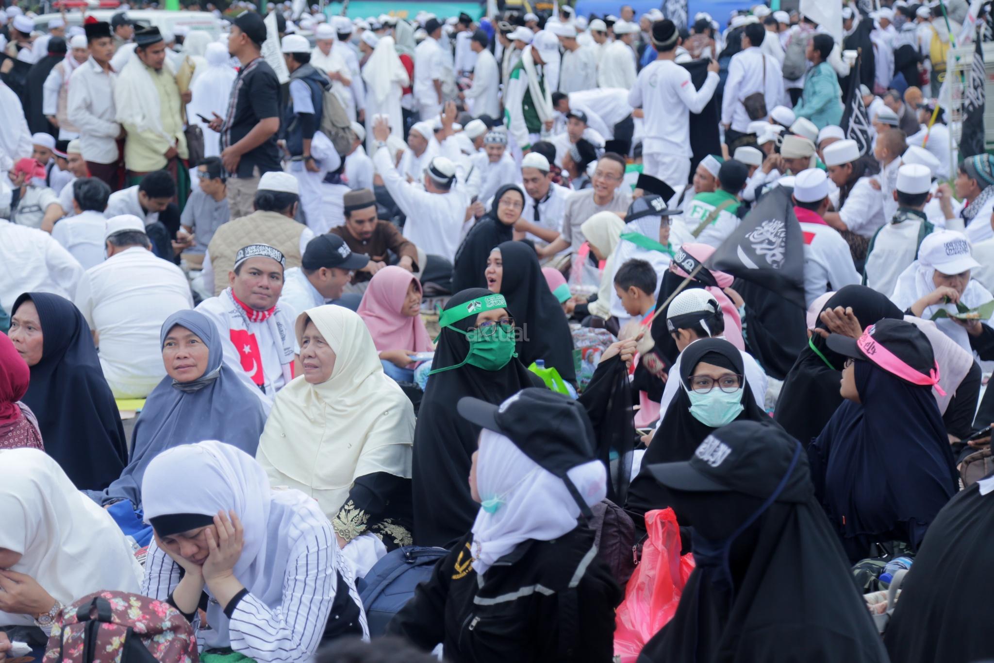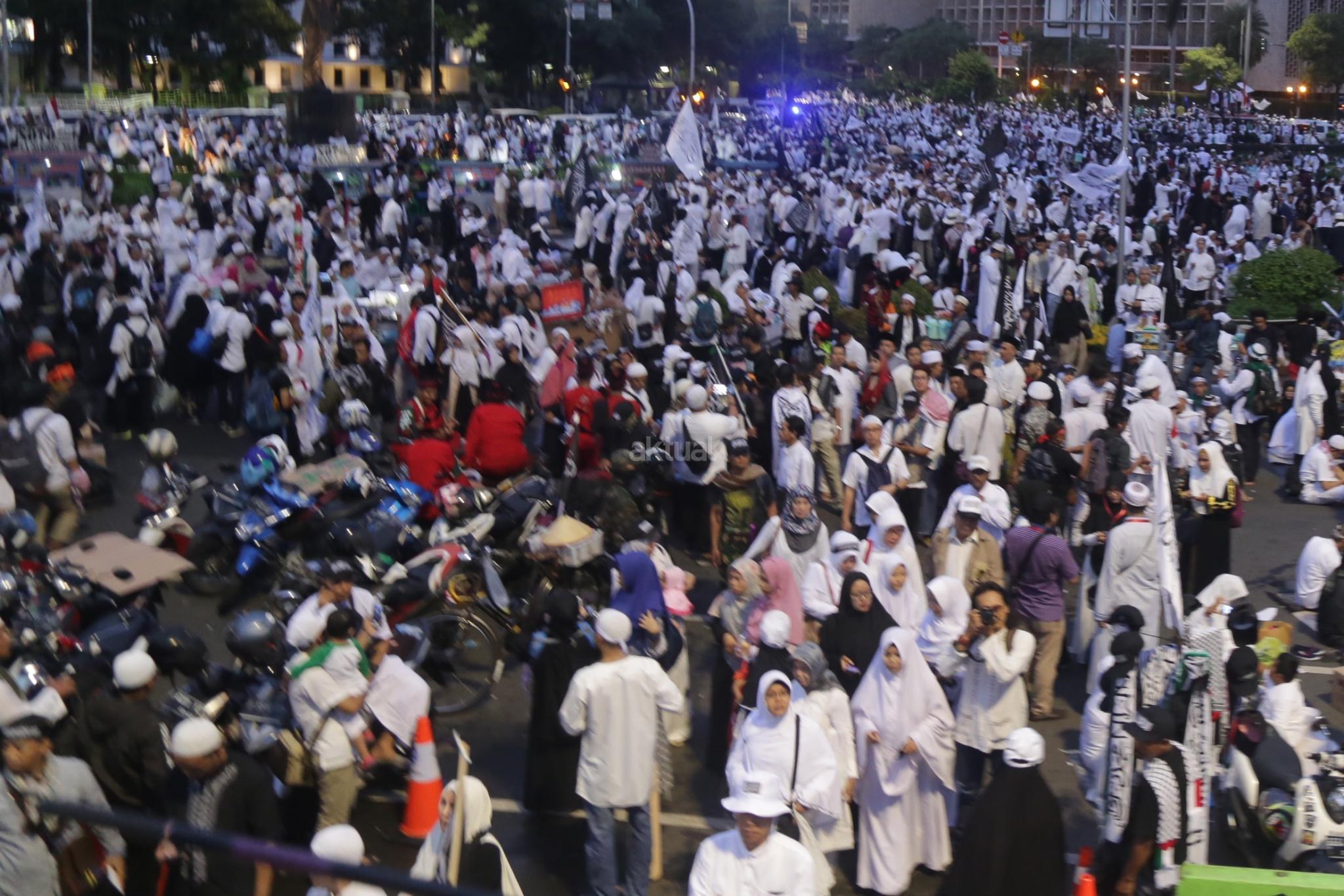 Jutaan umat muslim melaksanakan Reuni 212 memadati Kawasan Monas, Jakarta Pusat, Minggu (2/12/2018). Tidak hanya membawa bendera tauhid, para jamaah juga selalu meneriakan takbir “Allahuakbar”, dan melantunkan beberapa salawatan bersama. AKTUAL/Tino Oktaviano