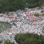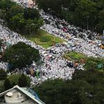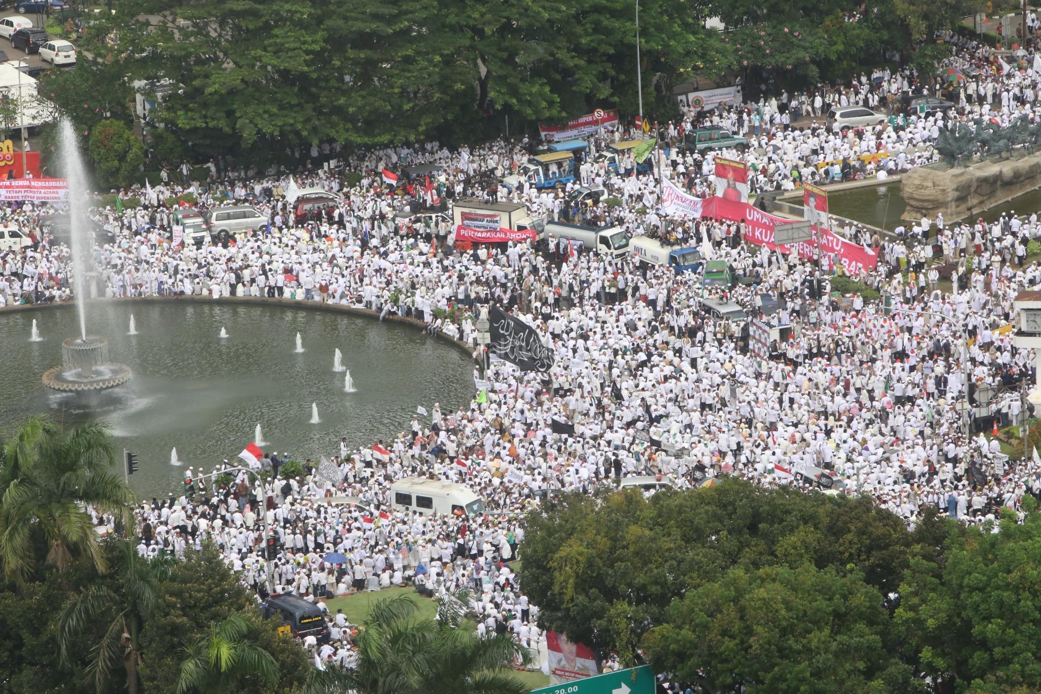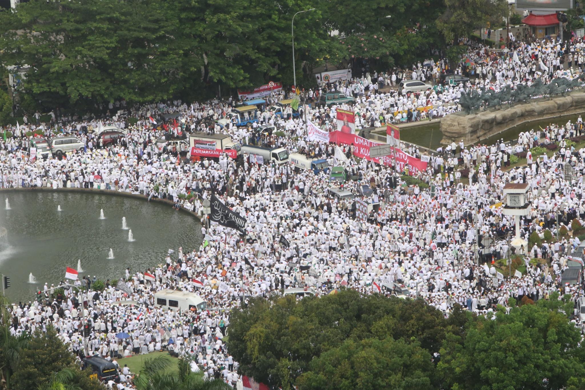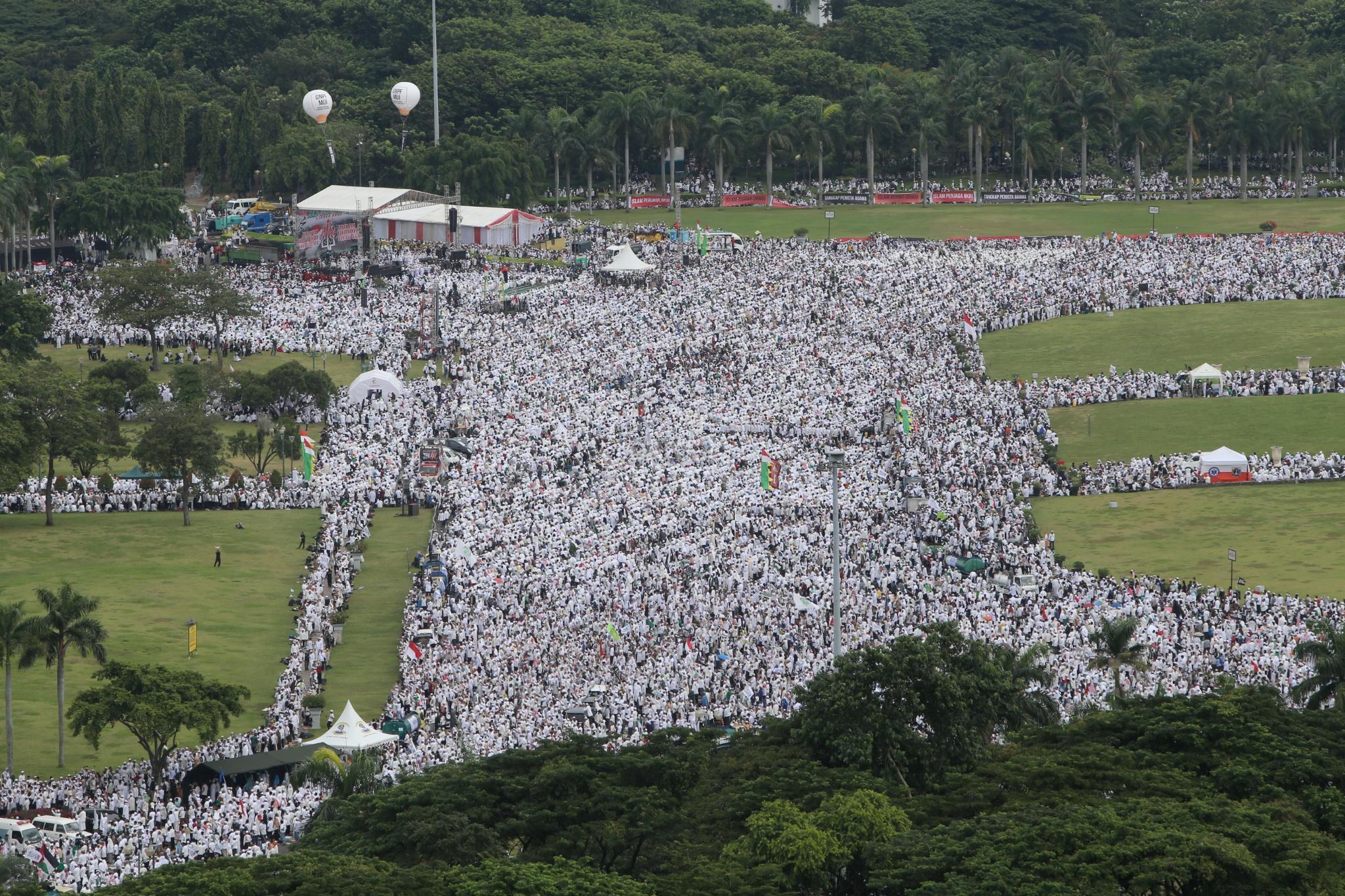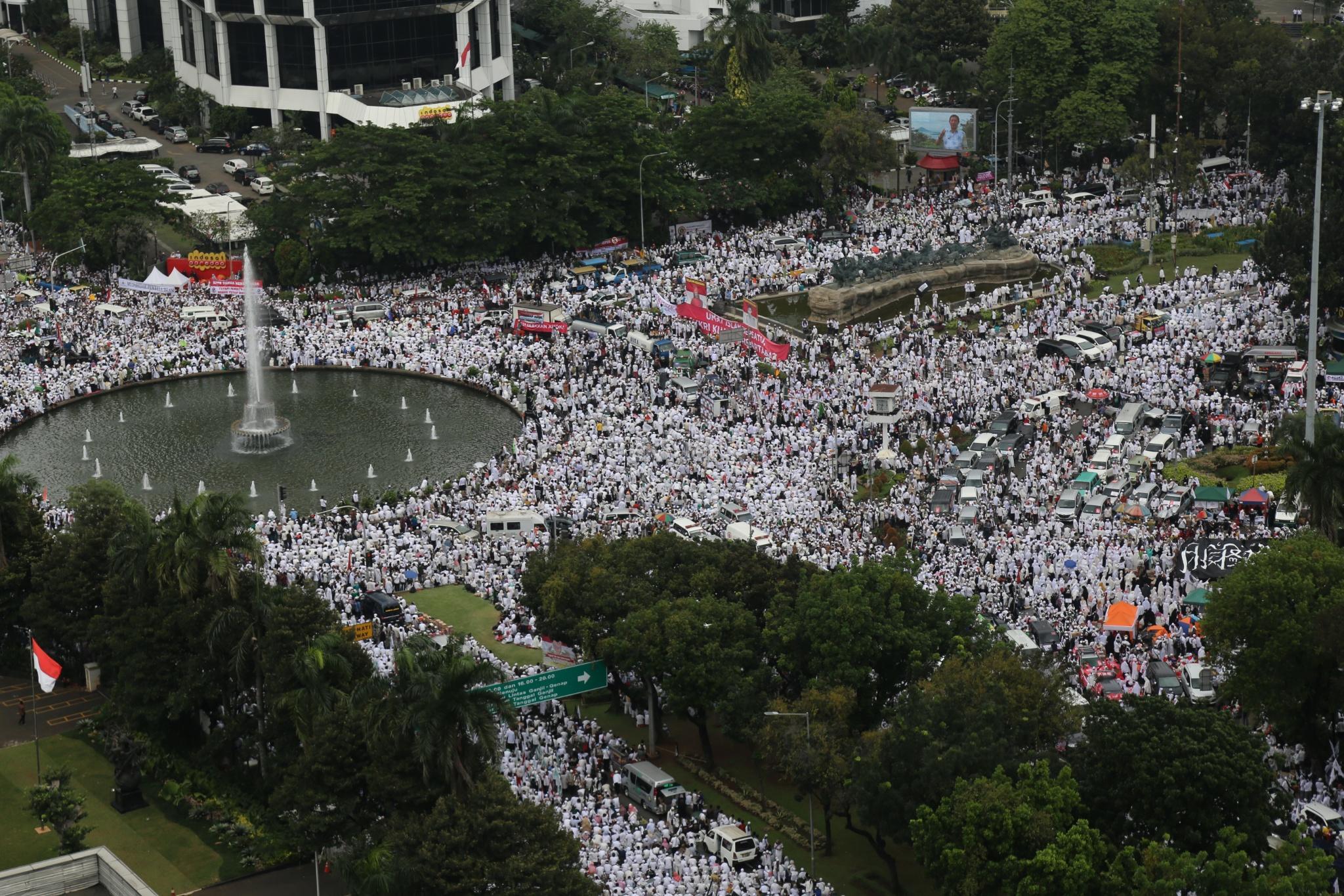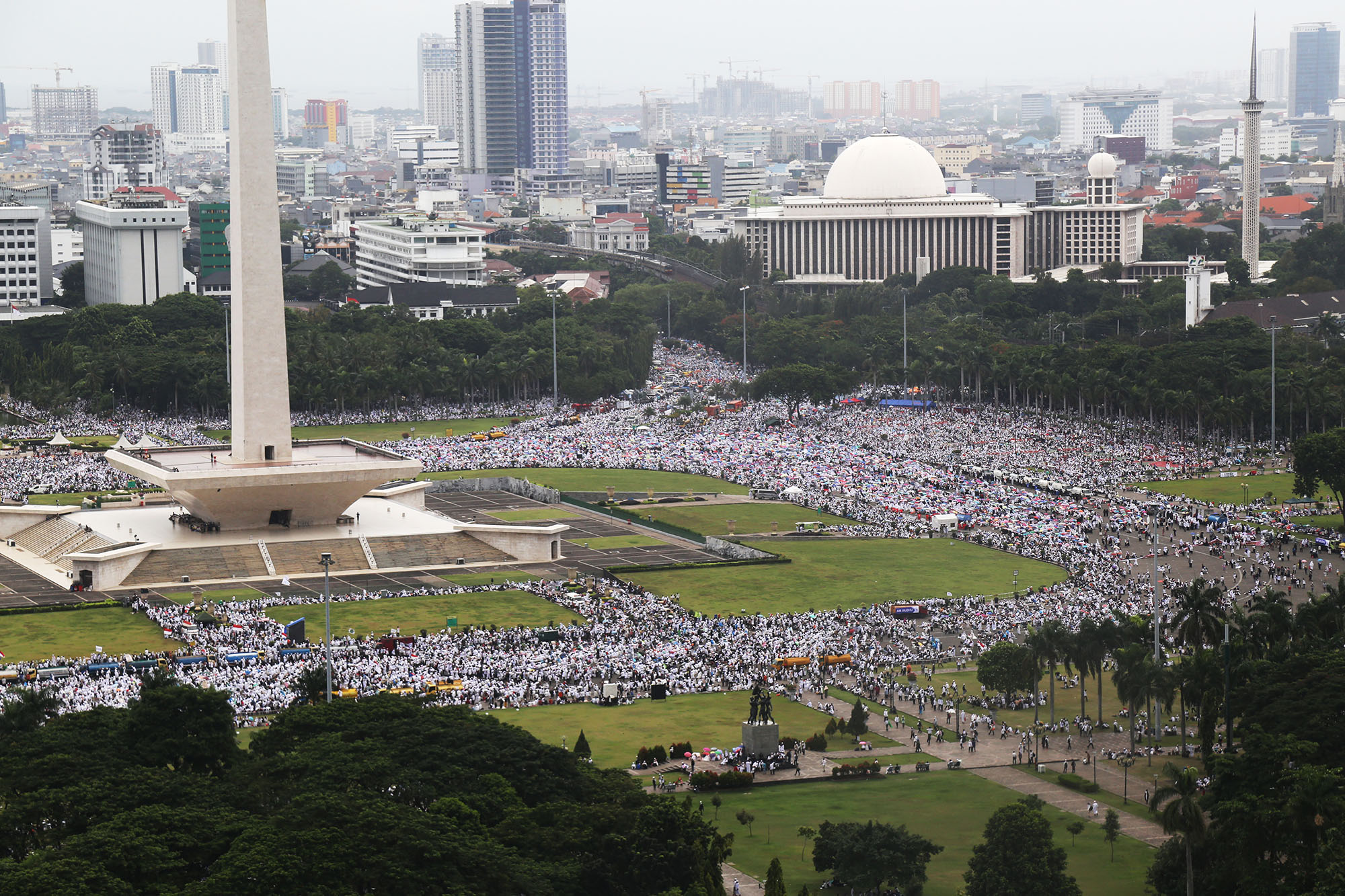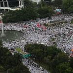 Jutaan umat muslim memenuhi lapangan Monumen Nasional saat melakukan aksi bela islam III di kawasan Monas, Jakarta Pusat, Jumat (2/12/2016). Jutaan pendemo berbondong-bondong berjalan menuju lapangan silang Monas untuk melakukan doa dan salat Jumat bersama dengan mengusung tema “Tangkap Ahok Si Penista Al Quran. AKTUAL/Tino Oktaviano
