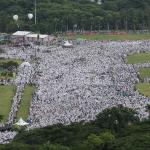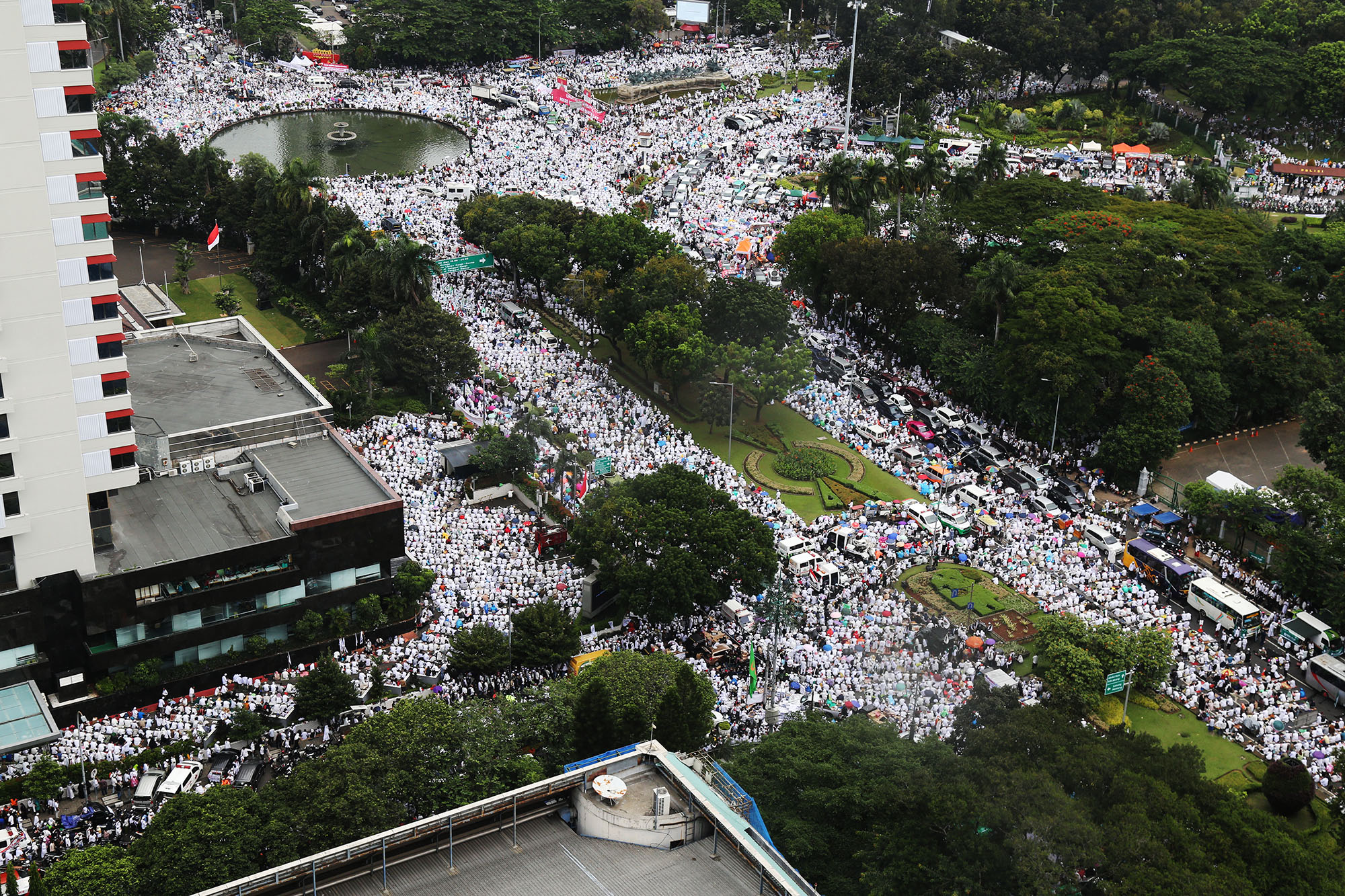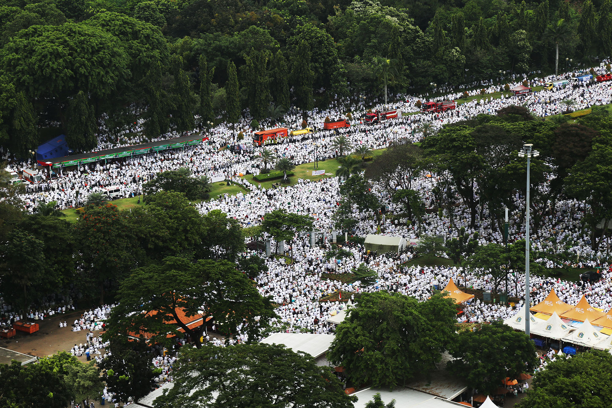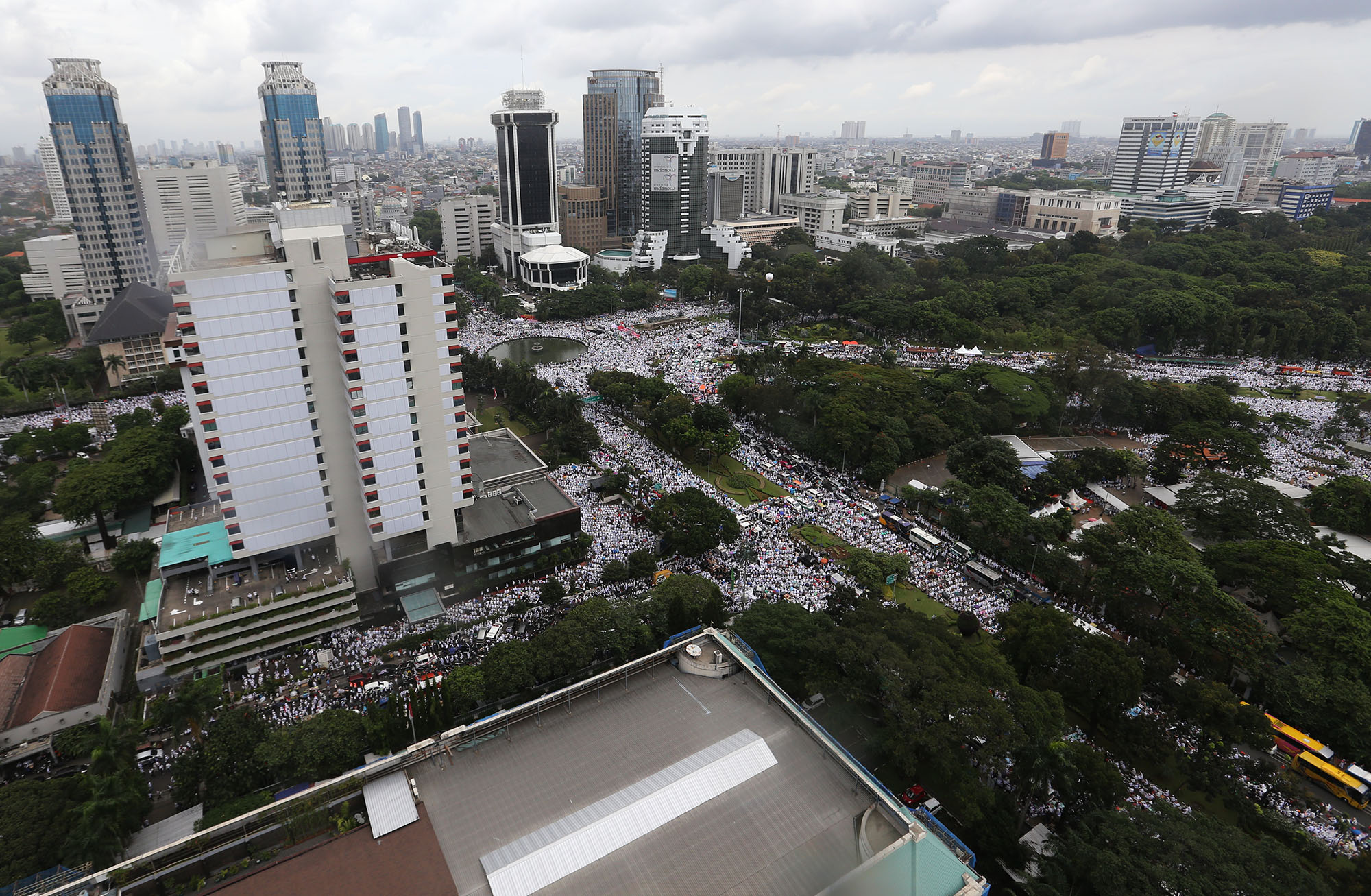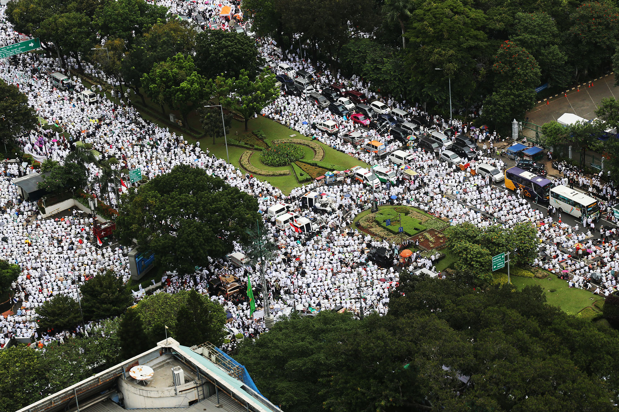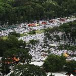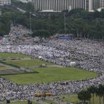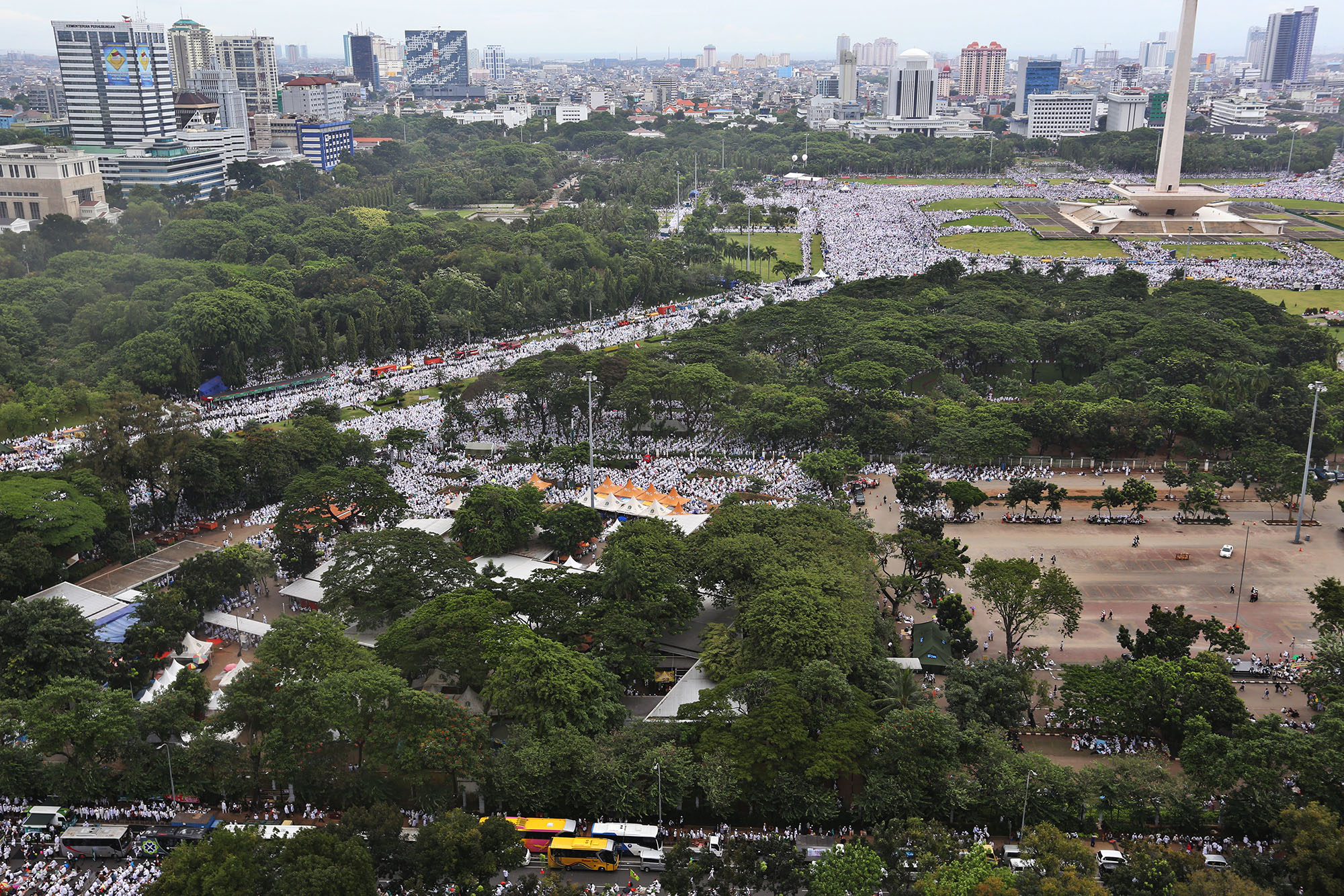 Jutaan umat muslim memenuhi lapangan Monumen Nasional saat melakukan aksi bela islam III di kawasan Monas, Jakarta Pusat, Jumat (2/12/2016). Jutaan pendemo berbondong-bondong berjalan menuju lapangan silang Monas untuk melakukan doa dan salat Jumat bersama dengan mengusung tema “Tangkap Ahok Si Penista Al Quran. AKTUAL/Tino Oktaviano