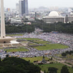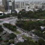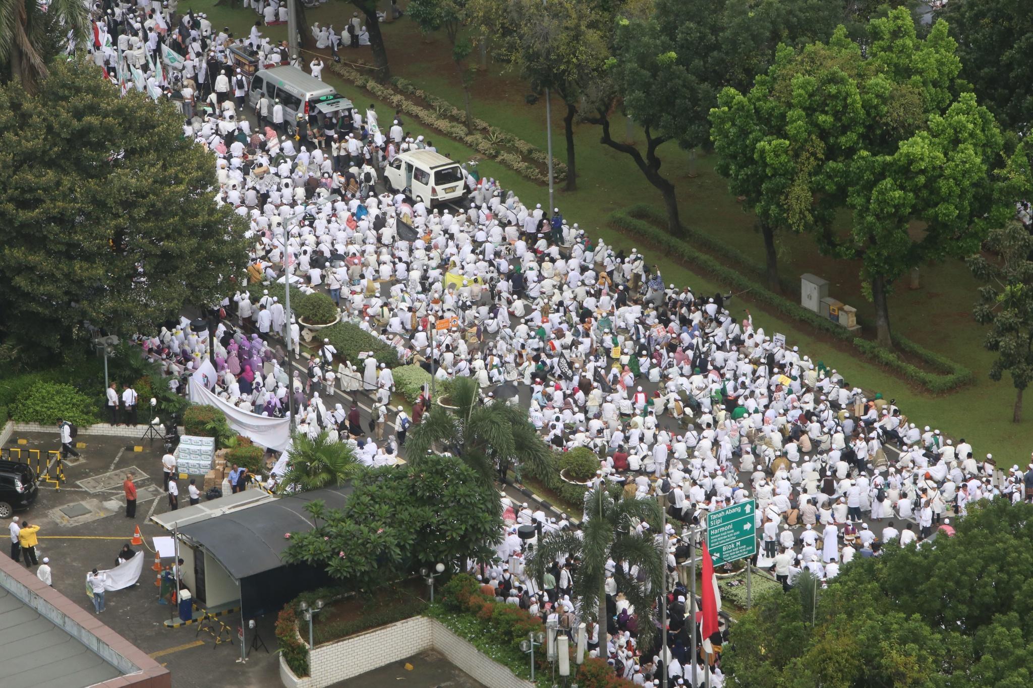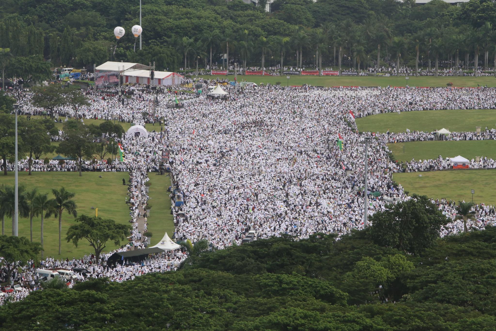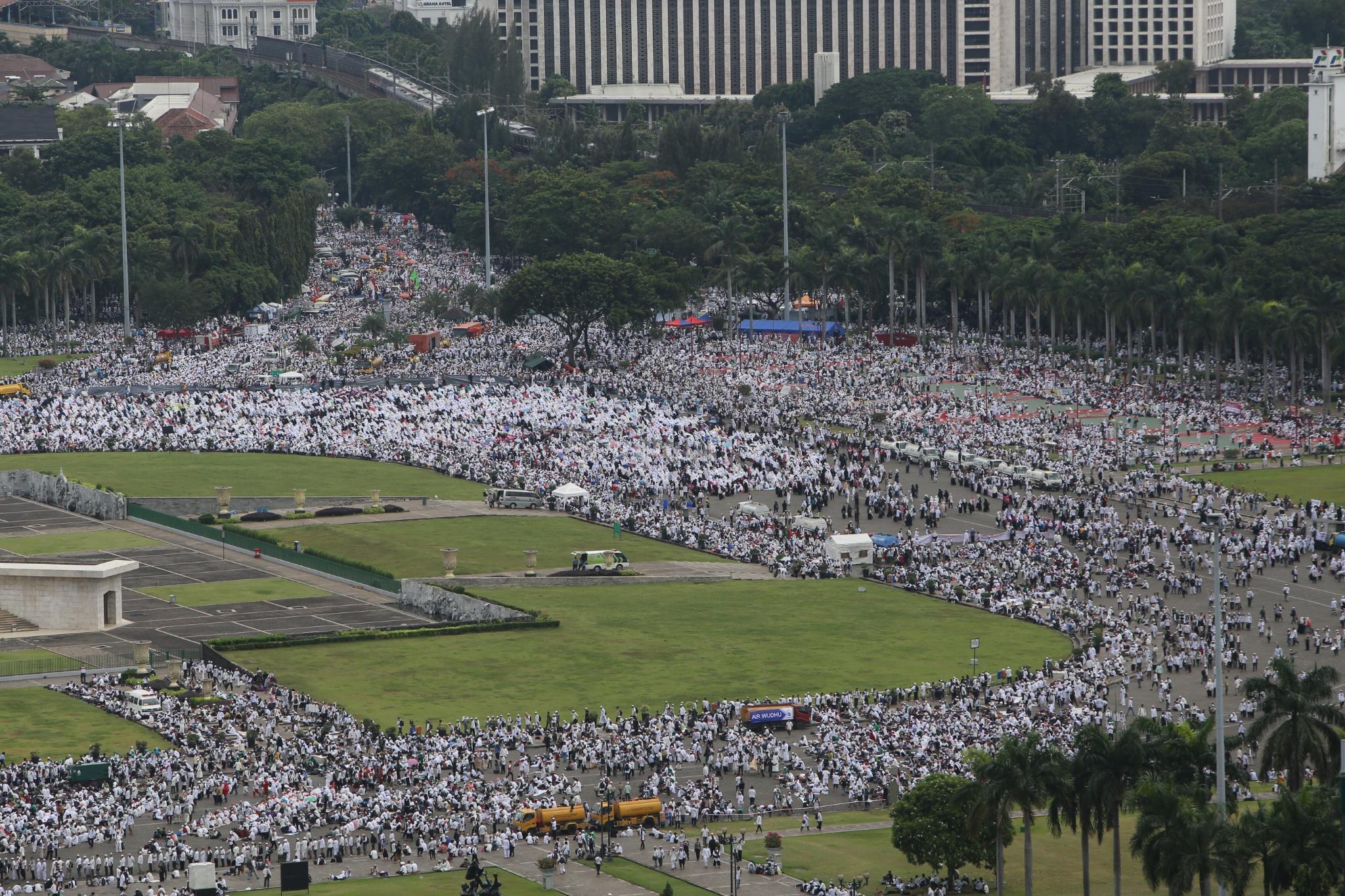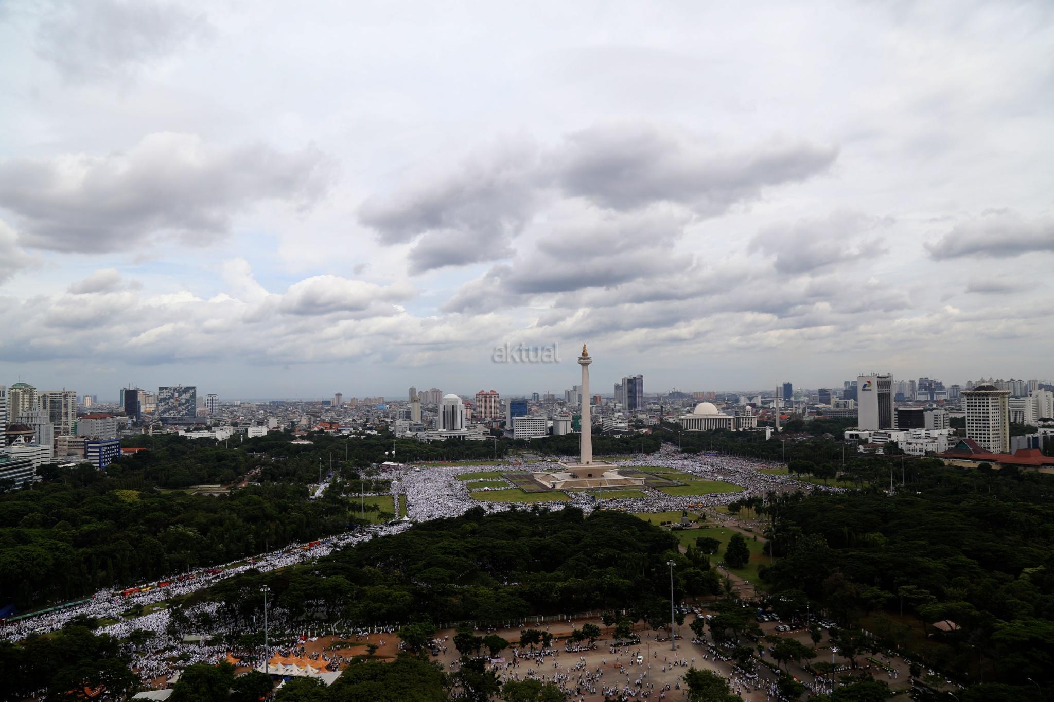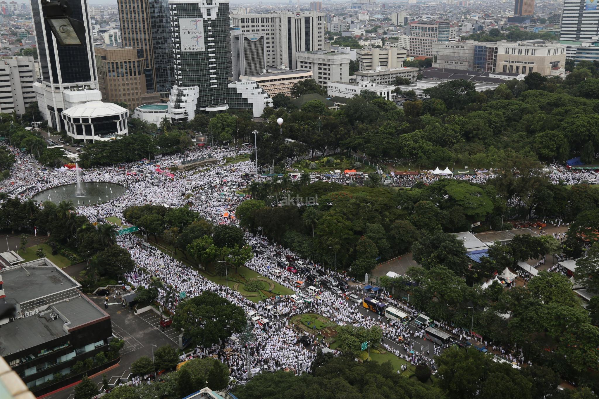 Juataan umat muslim memenuhi lapangan Monumen Nasional saat melakukan aksi bela islam III di kawasan Monas, Jakarta Pusat, Jumat (2/12/2016). Jutaan pendemo berbondong-bondong berjalan menuju lapangan silang Monas untuk melakukan doa dan salat Jumat bersama dengan mengusung tema “Tangkap Ahok Si Penista Al Quran. AKTUAL/Tino Oktaviano