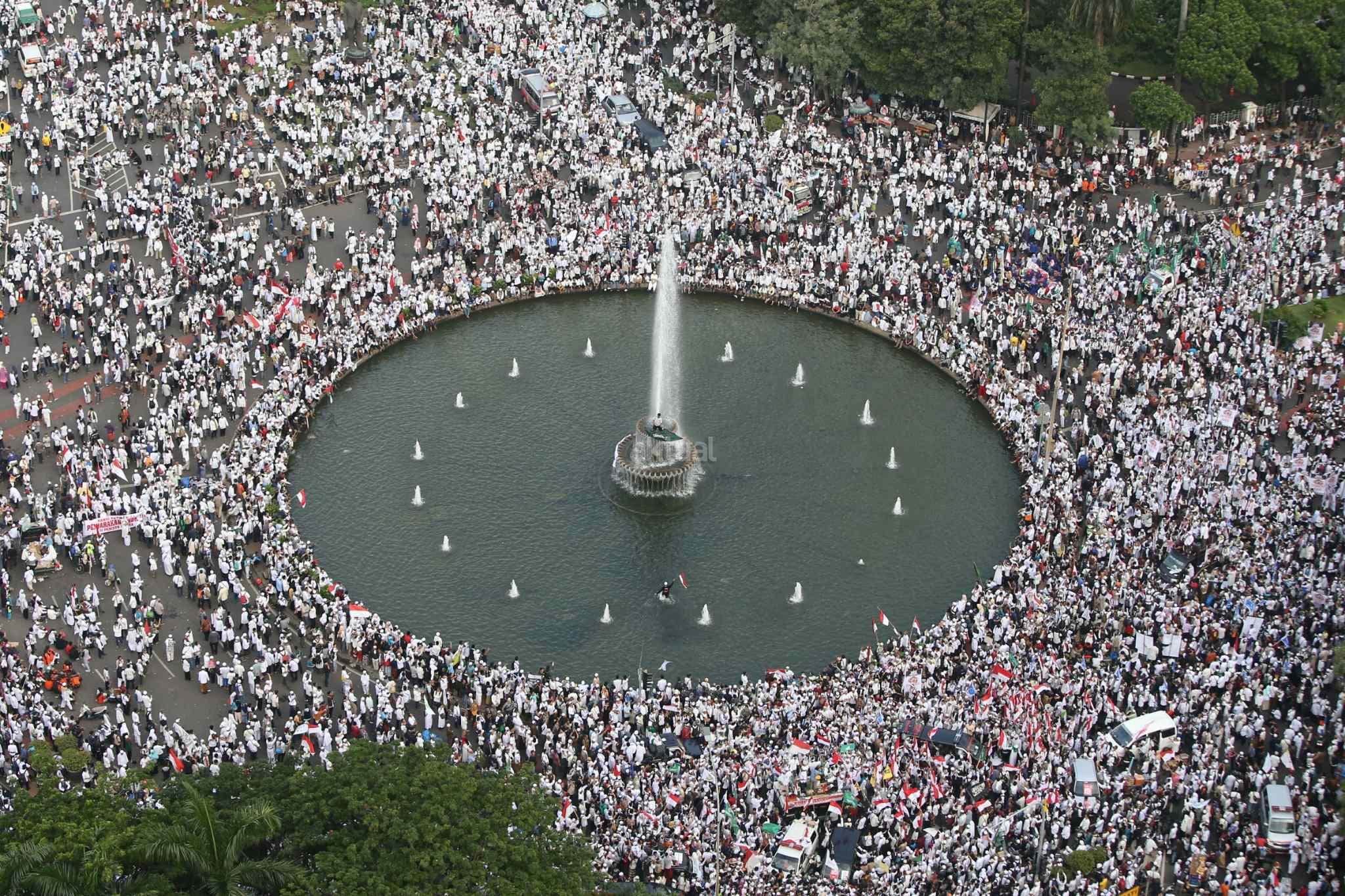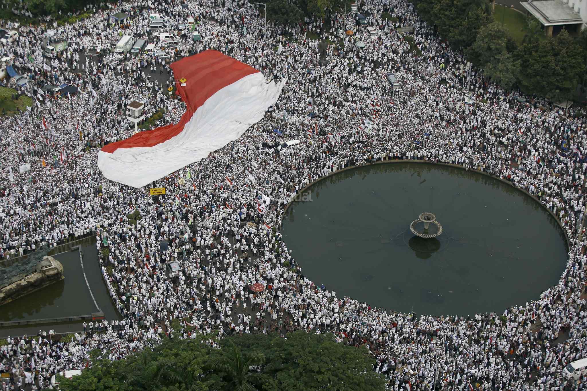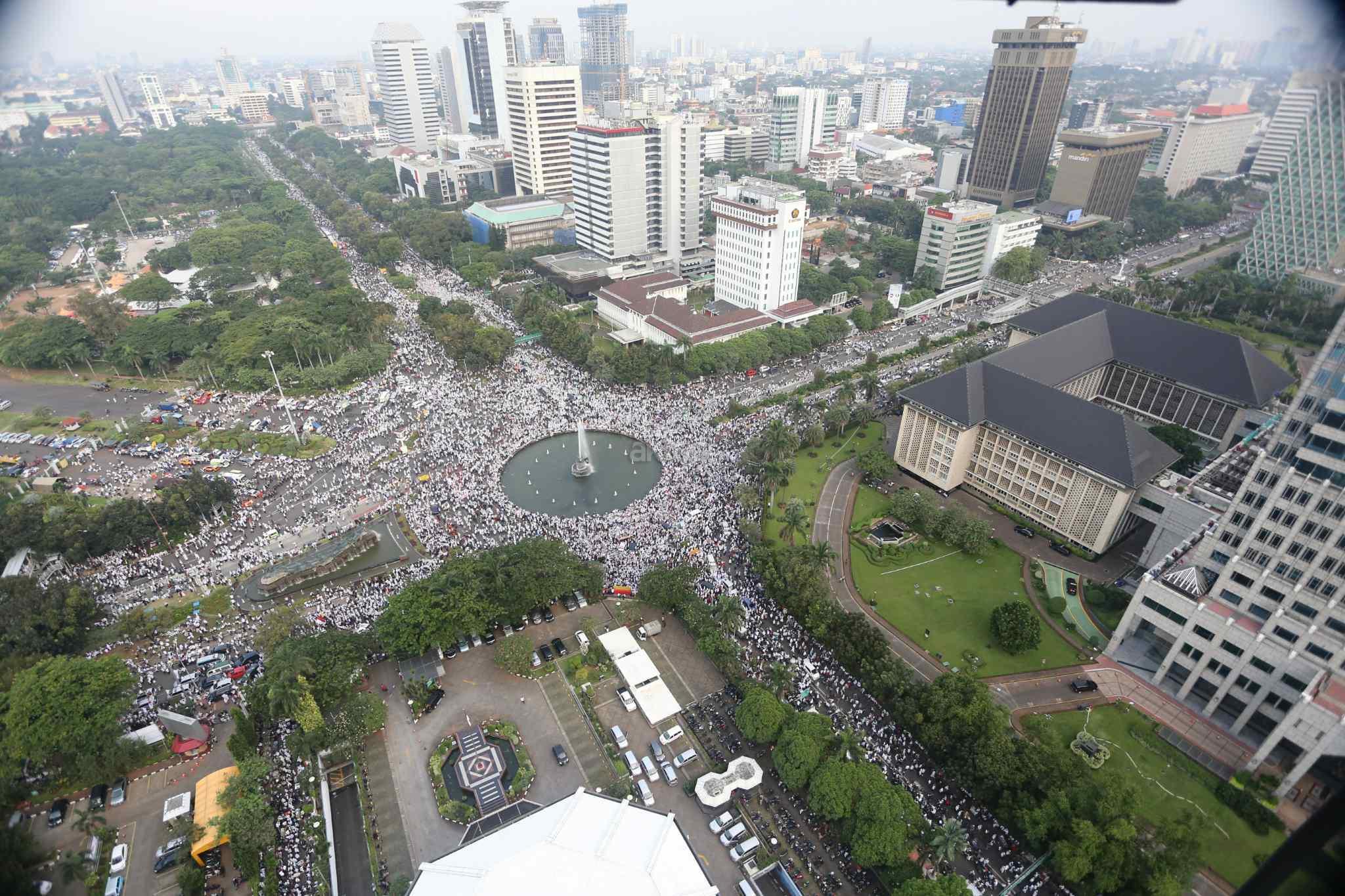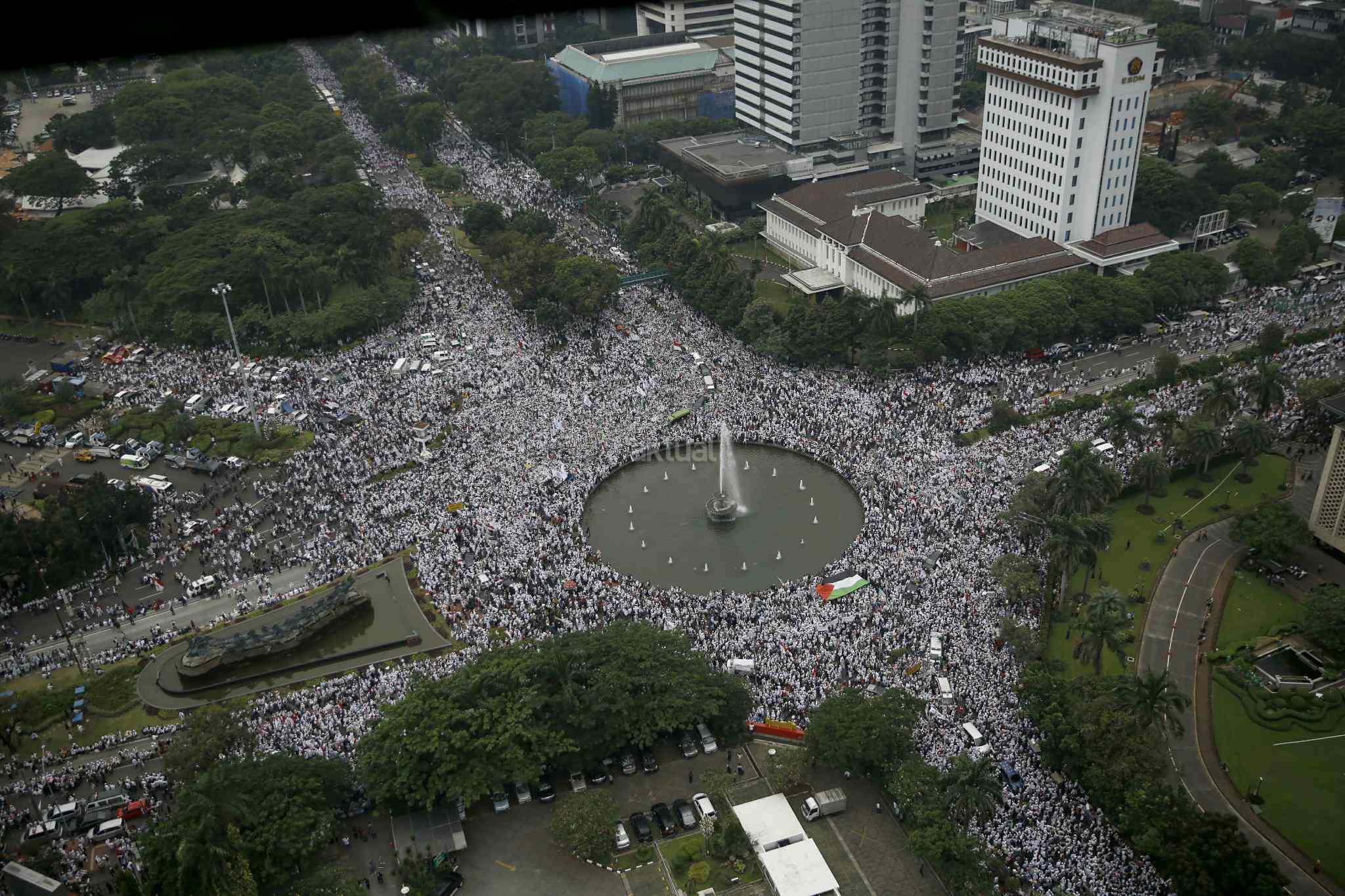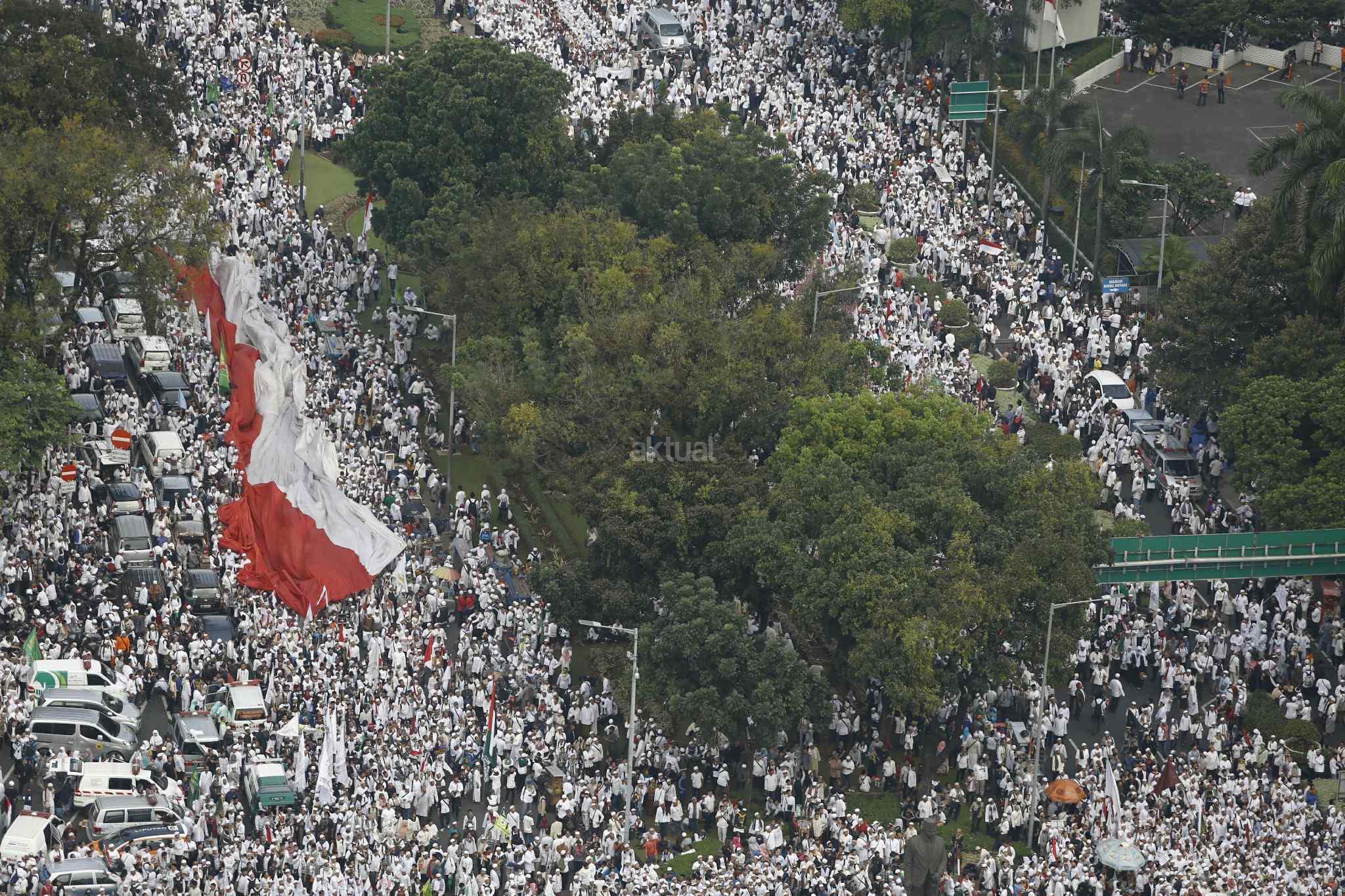 Jutaan Massa yang terdiri dari berbagai elemen melakukan aksi unjuk rasa di Bundaran Patung Kuda, Jakarta, Jumat (4/11). Dalam aksinya mereka menuntut penutasan kasus dugaan penistaan agama yang dilakukan Basuki Tjahaja Purnama. AKTUAL/Tino Oktaviano