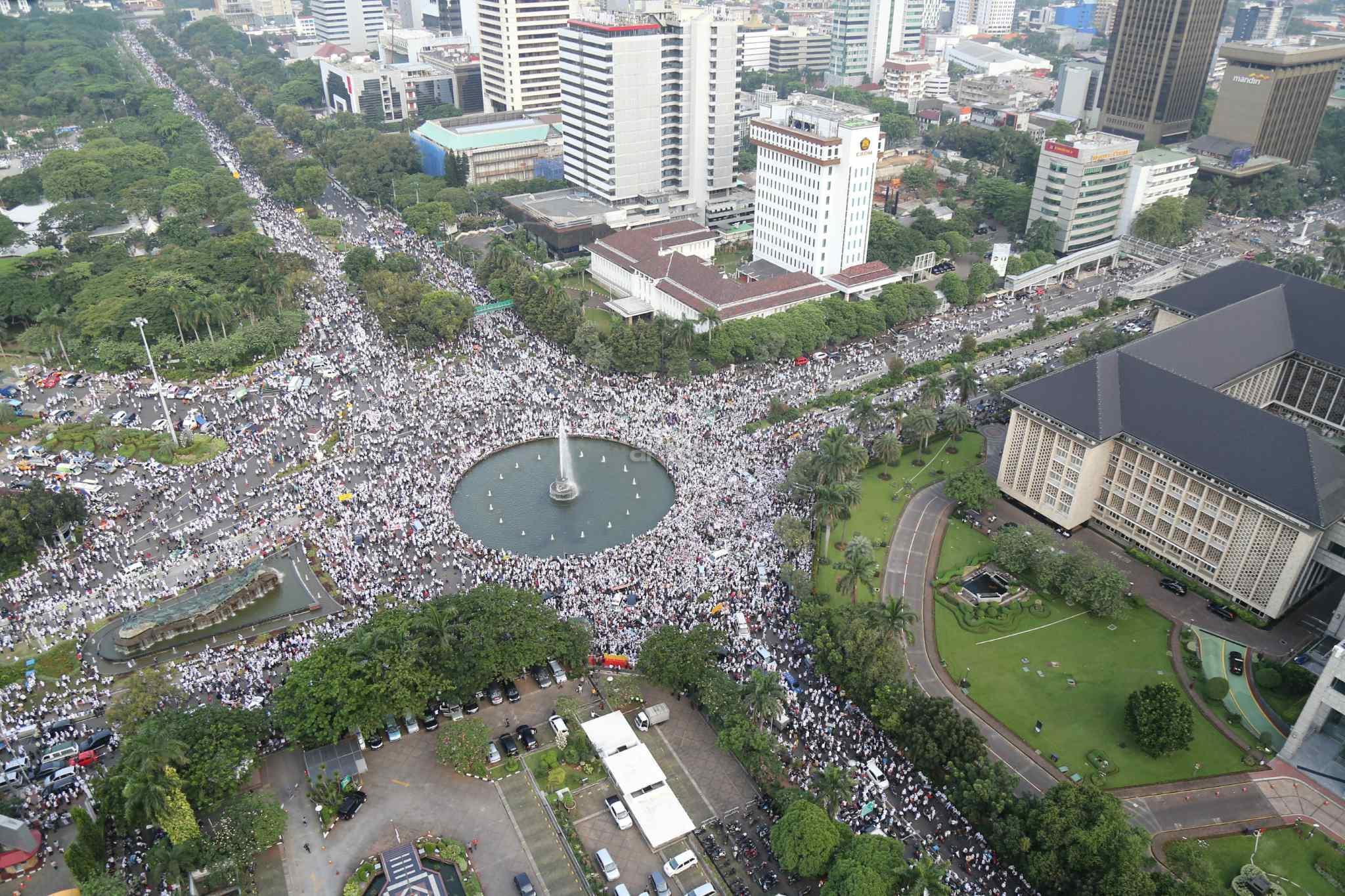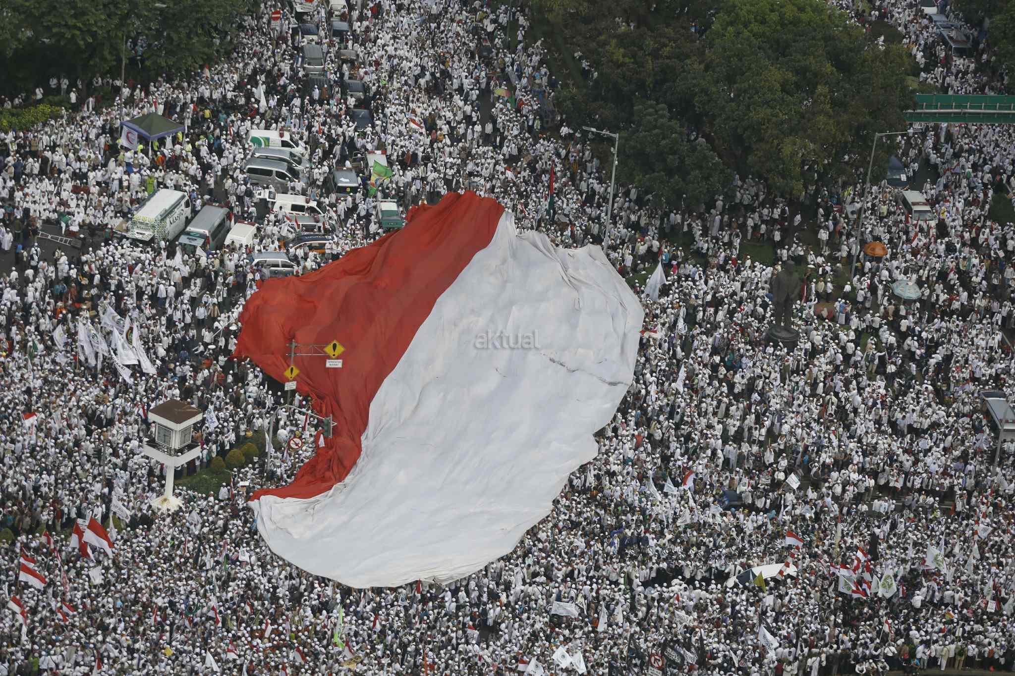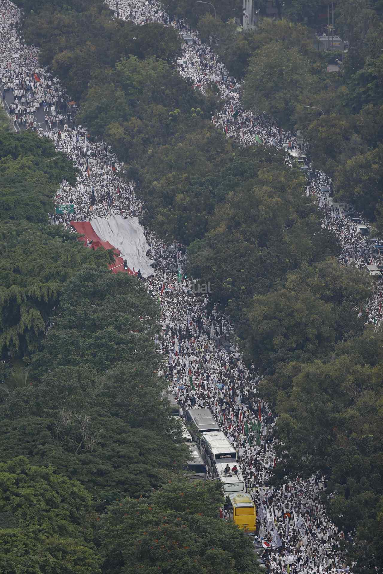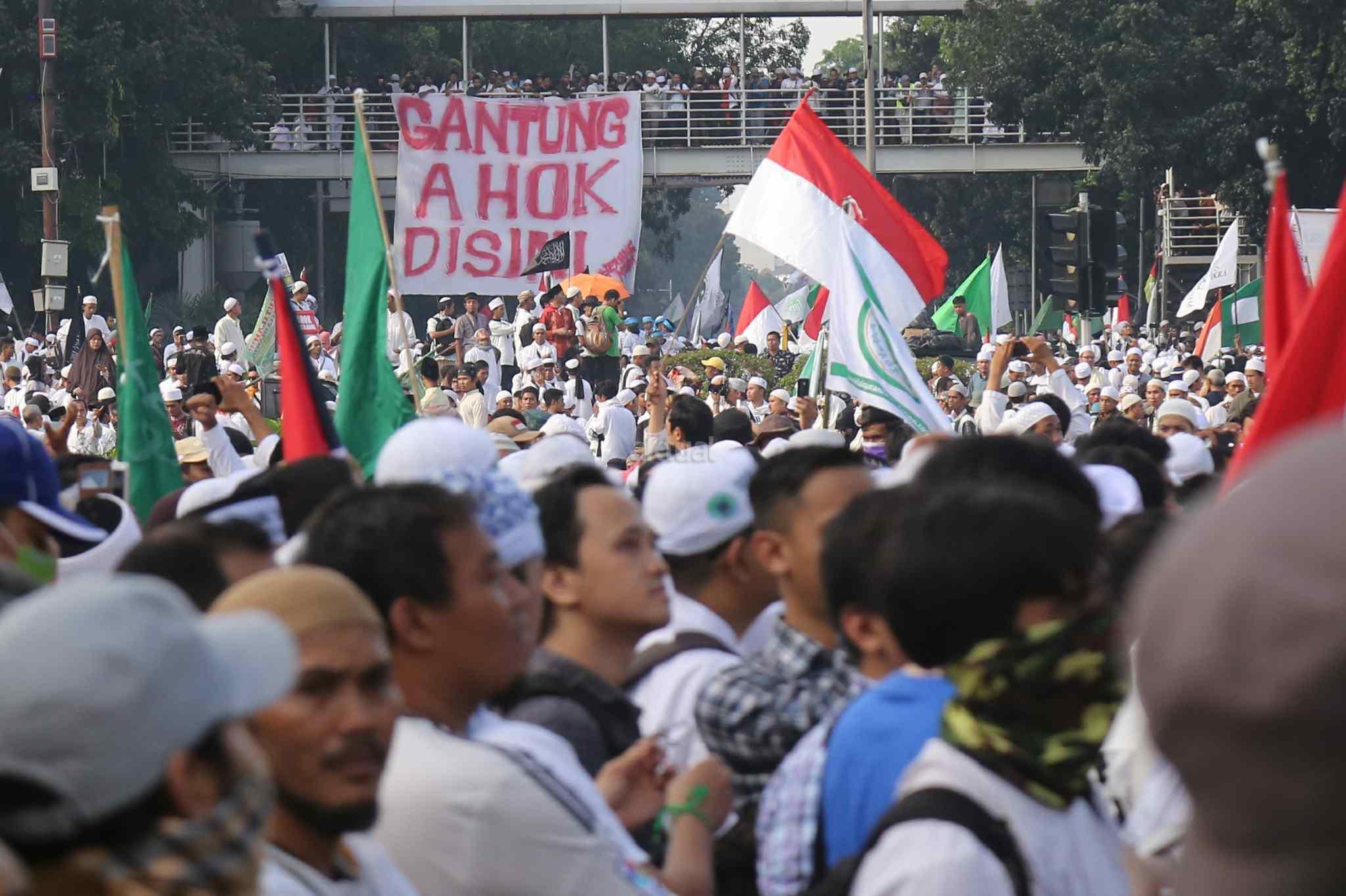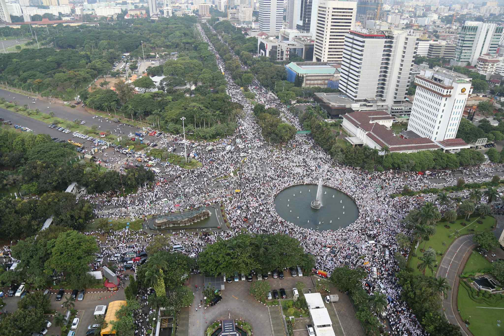 Jutaan Massa yang terdiri dari berbagai elemen melakukan aksi unjuk rasa di Bundaran Patung Kuda, Jakarta, Jumat (4/11). Dalam aksinya mereka menuntut penutasan kasus dugaan penistaan agama yang dilakukan Basuki Tjahaja Purnama. AKTUAL/Tino Oktaviano