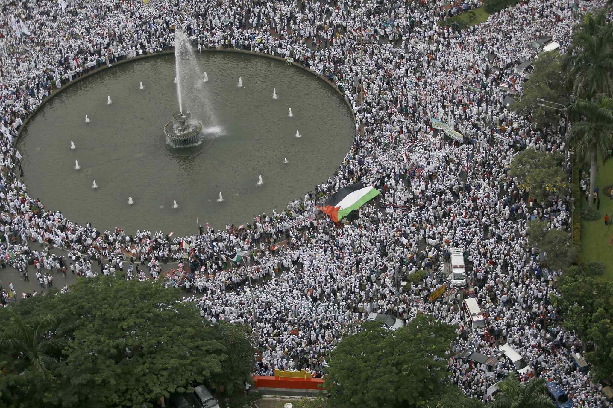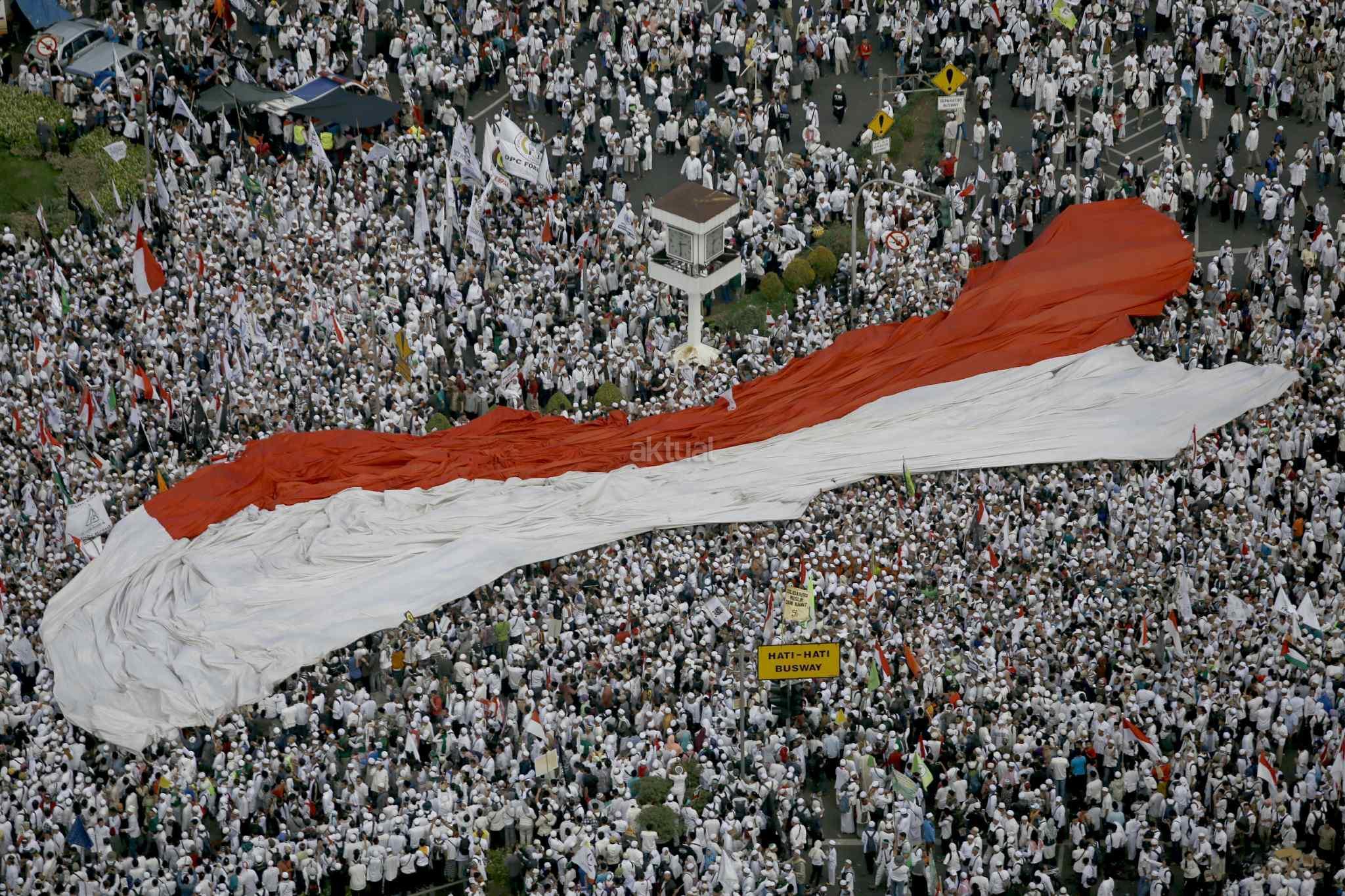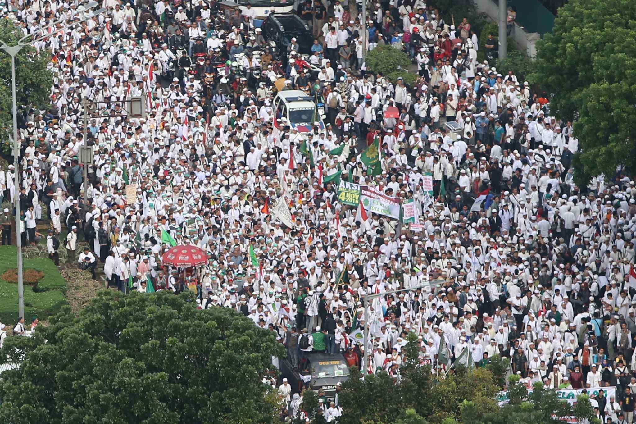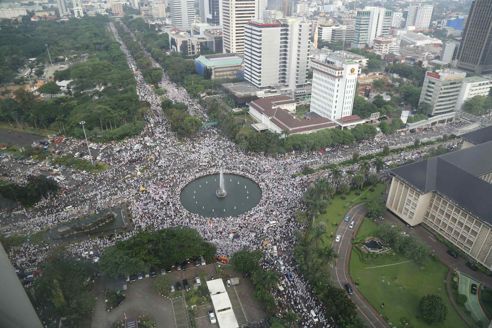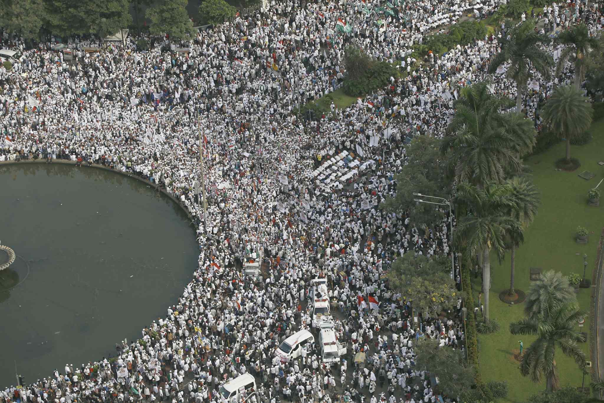 Jutaan Massa yang terdiri dari berbagai elemen melakukan aksi unjuk rasa di Bundaran Patung Kuda, Jakarta, Jumat (4/11). Dalam aksinya mereka menuntut penutasan kasus dugaan penistaan agama yang dilakukan Basuki Tjahaja Purnama. AKTUAL/Tino Oktaviano