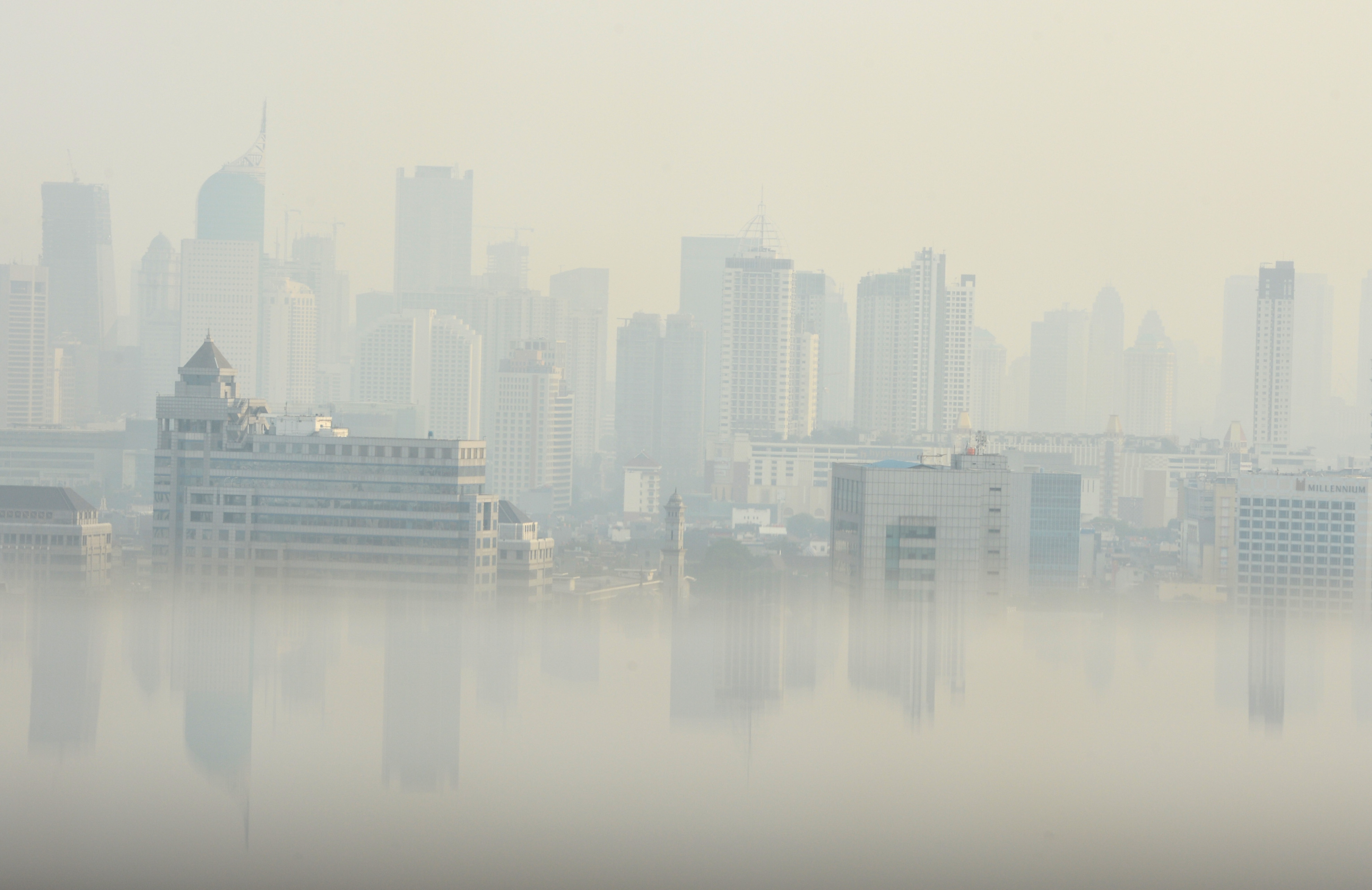 Kabut asap tipis menyelimuti salah satu sudut kota Jakarta, Senin (26/10). Badan Nasional Penanggulangan Bencana (BNPB) menyatakan sebaran kabut asap kebakaran hutan di Sumatera dan Kalimantan ke wilayah DKI Jakarta terjadi akibat arah angin sejak Jumat (23/10), namun demikian warga DKI Jakarta tidak perlu khawatir karena bersifat sementara dan belum berbahaya. ANTARA FOTO/Prasetyo Utomo/pd/15