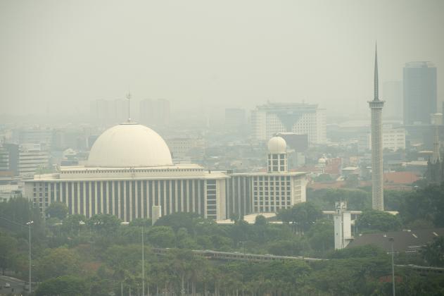 Kabut asap tipis menyelimuti kawasan Masjid Istiqlal di Jakarta, Senin (26/10). Badan Nasional Penanggulangan Bencana (BNPB) menyatakan sebaran kabut asap kebakaran hutan di Sumatera dan Kalimantan ke wilayah DKI Jakarta terjadi akibat arah angin sejak Jumat (23/10), namun demikian warga DKI Jakarta tidak perlu khawatir karena bersifat sementara dan belum berbahaya. ANTARA FOTO/Widodo S. Jusuf/ama/15.