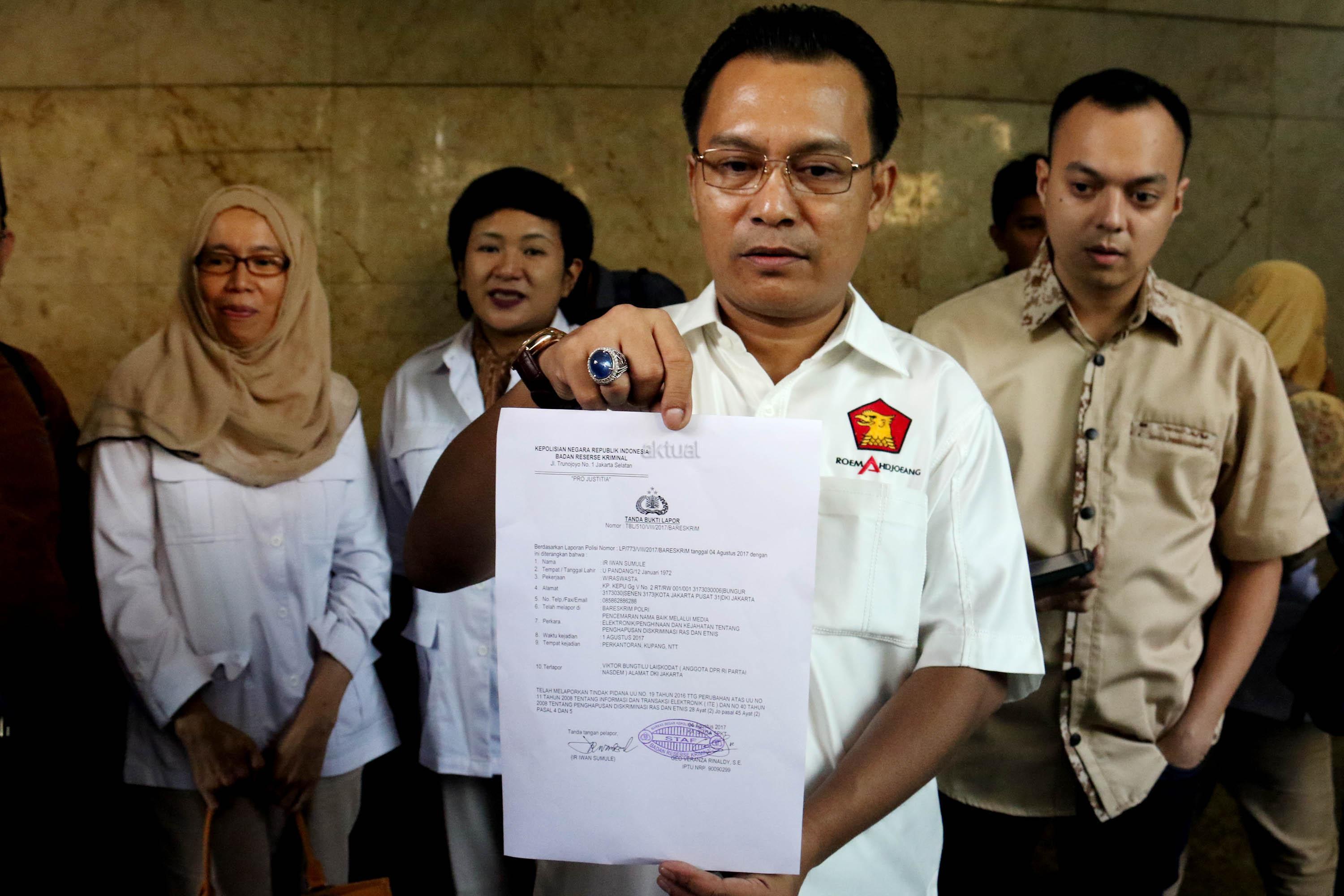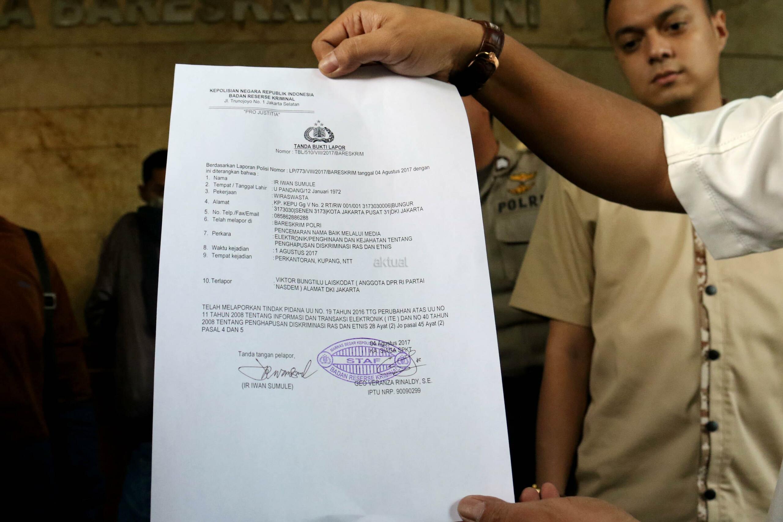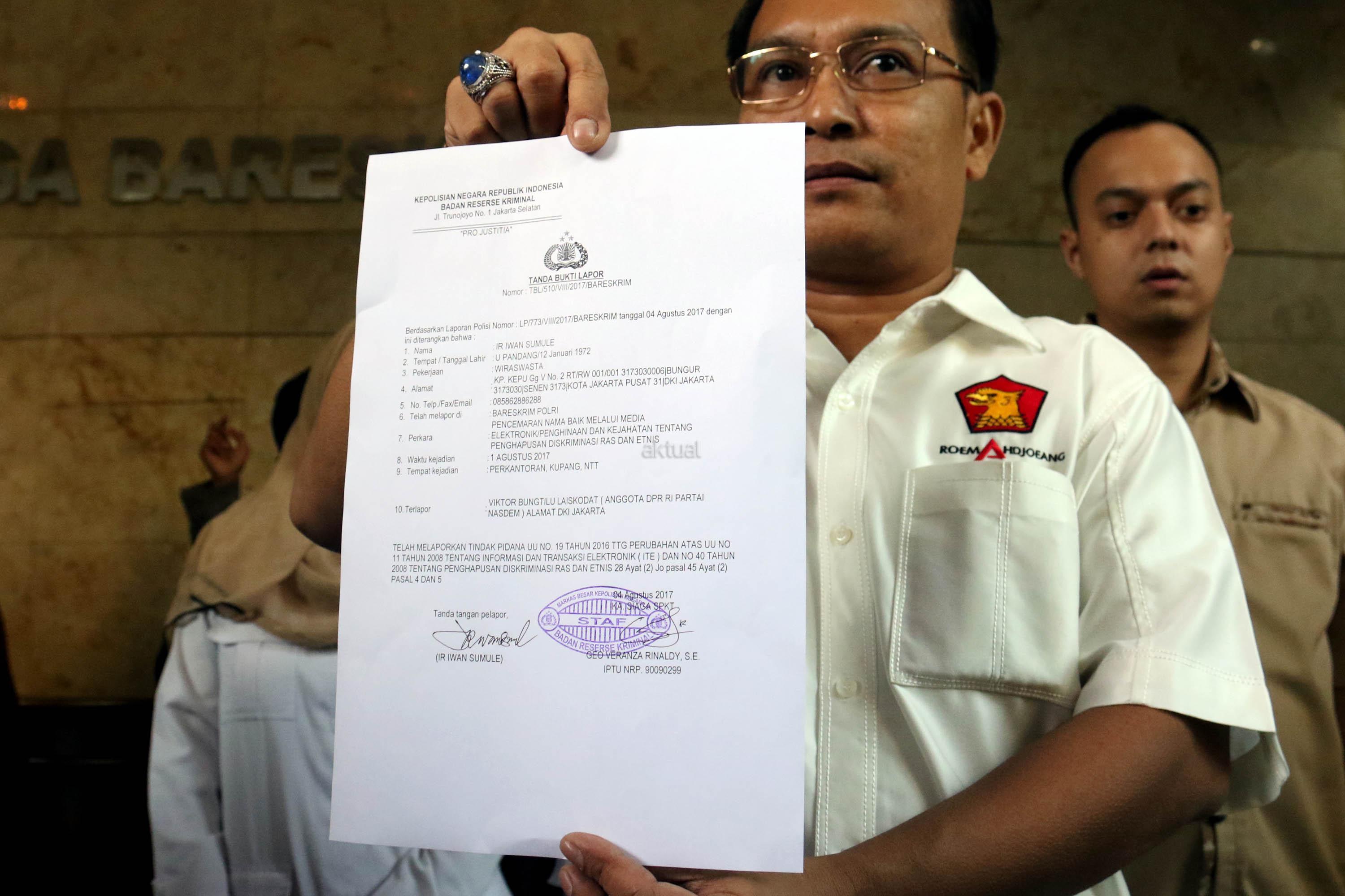 Ketua DPP Partai Gerindra Bidang Hubungan Industrial dan Jaminan Sosial Ketenagakerjaan Iwan Sumule menunjukan surat laporan terhadap Ketua Fraksi Partai Nasdem di DPR Viktor Bungtilu Laiskodat, di Badan Reserse Kriminal Polri, Jakarta, Jumat (4/8/2017). Viktor Laiskodat dilaporkan ke polisi dengan tuduhan telah melakukan tindak pidana pencemaran nama baik melalui media elektronik atau penghinaan dan kejahatan tentang penghapusan diskriminasi ras dan etnis. AKTUAL/Munzir