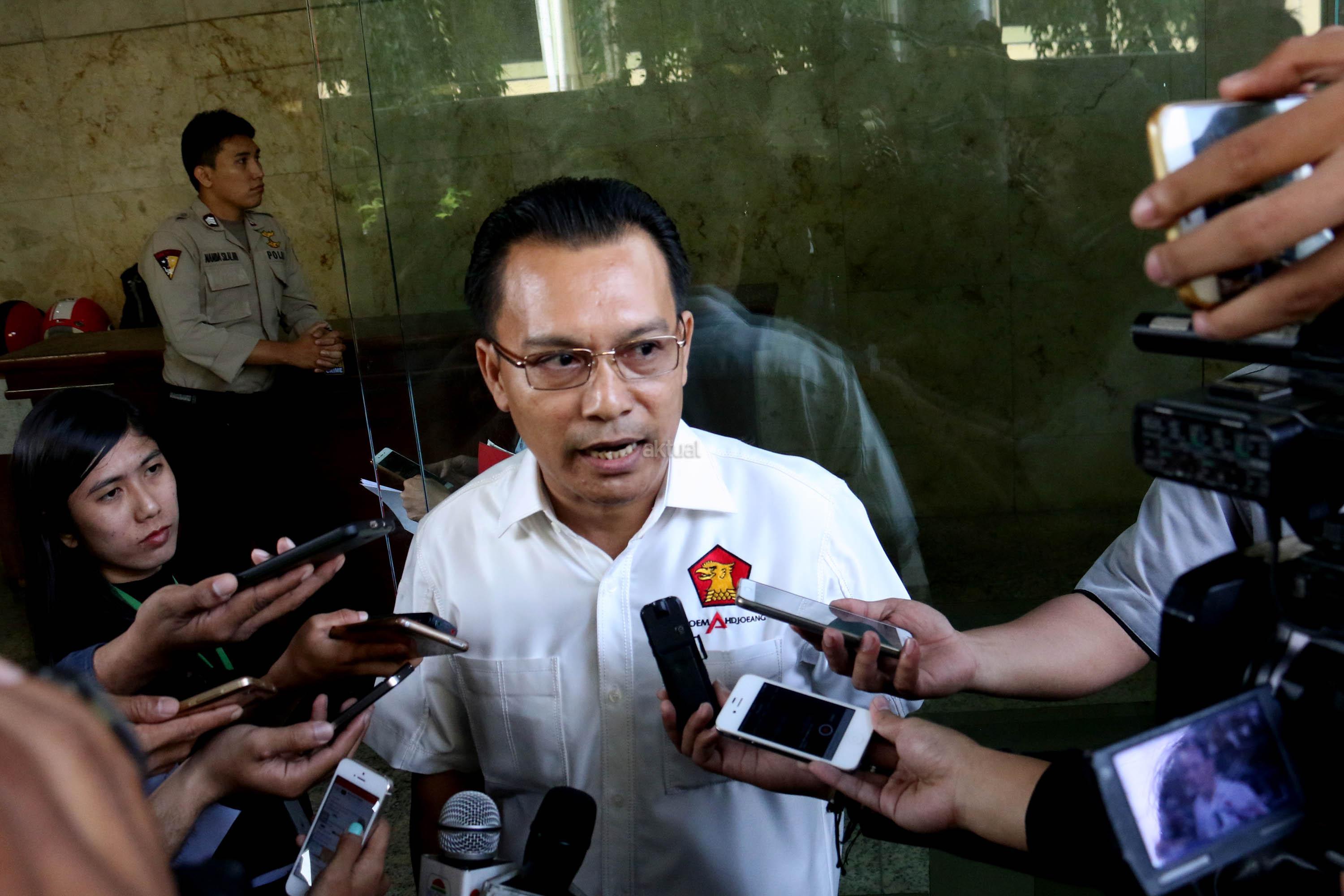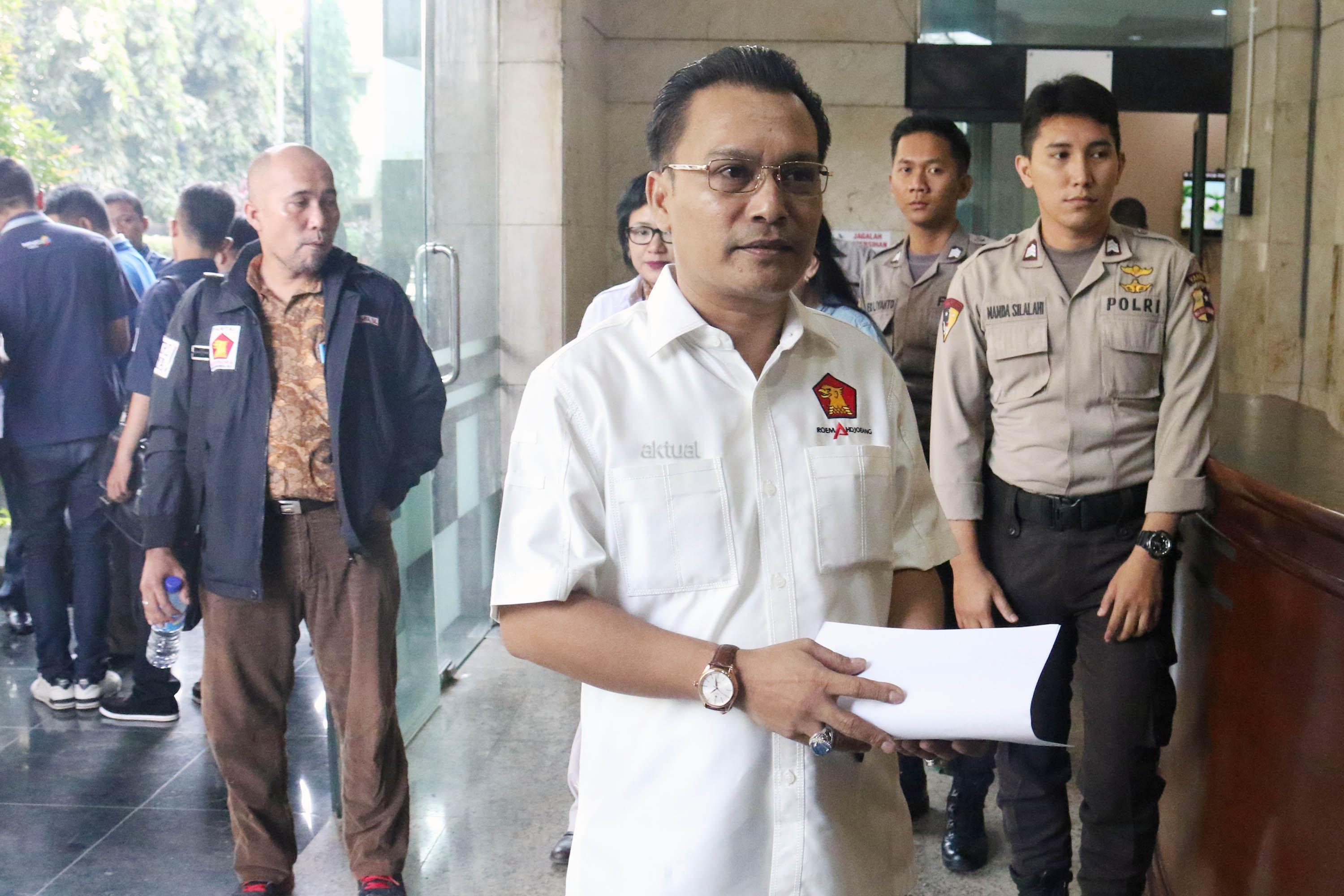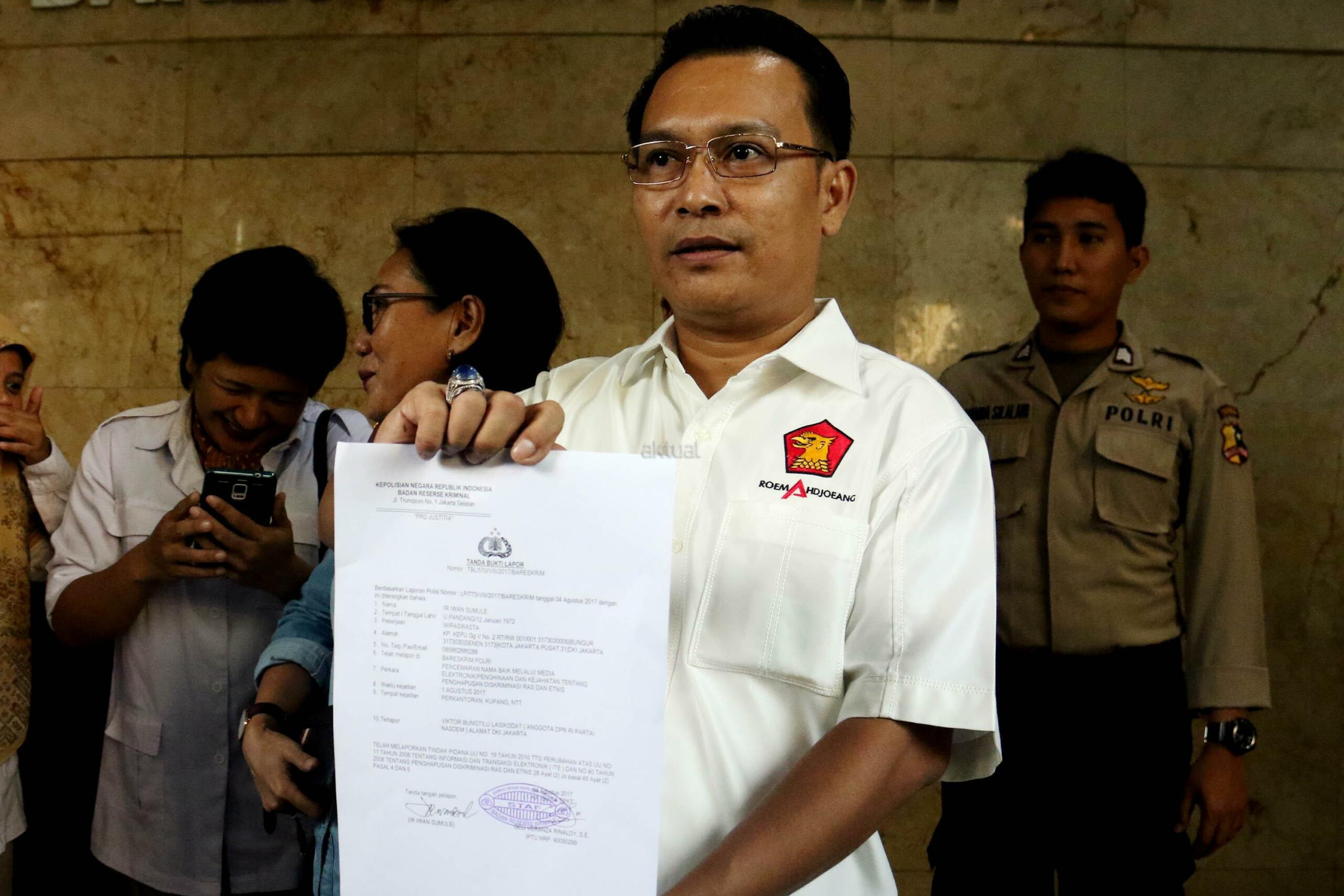 Ketua DPP Partai Gerindra Bidang Hubungan Industrial dan Jaminan Sosial Ketenagakerjaan Iwan Sumule menunjukan surat laporan terhadap Ketua Fraksi Partai Nasdem di DPR Viktor Bungtilu Laiskodat, di Badan Reserse Kriminal Polri, Jakarta, Jumat (4/8/2017). Viktor Laiskodat dilaporkan ke polisi dengan tuduhan telah melakukan tindak pidana pencemaran nama baik melalui media elektronik atau penghinaan dan kejahatan tentang penghapusan diskriminasi ras dan etnis. AKTUAL/Munzir