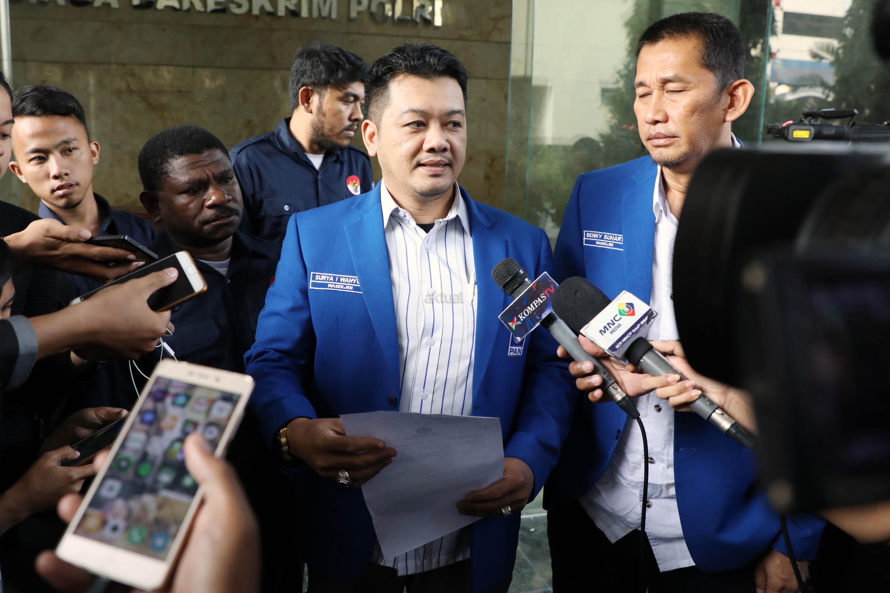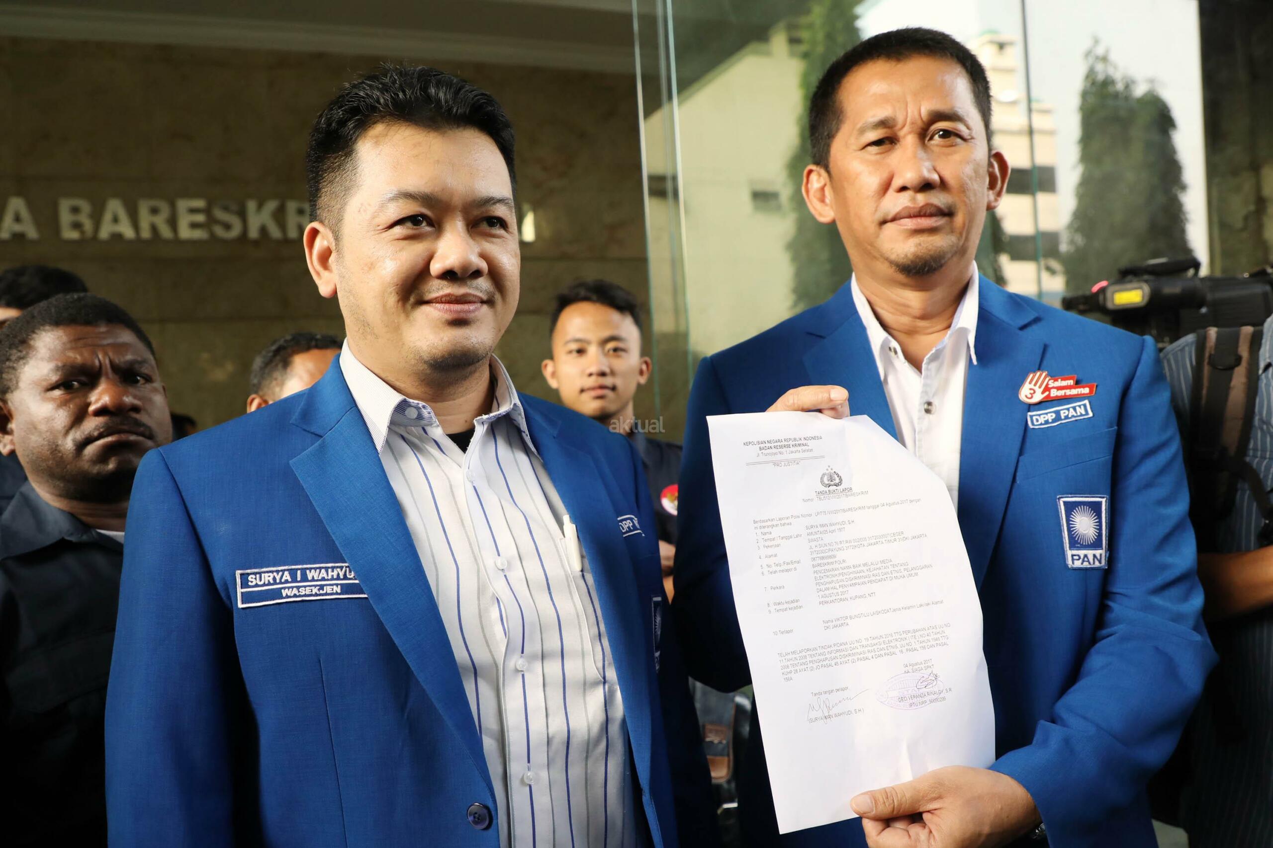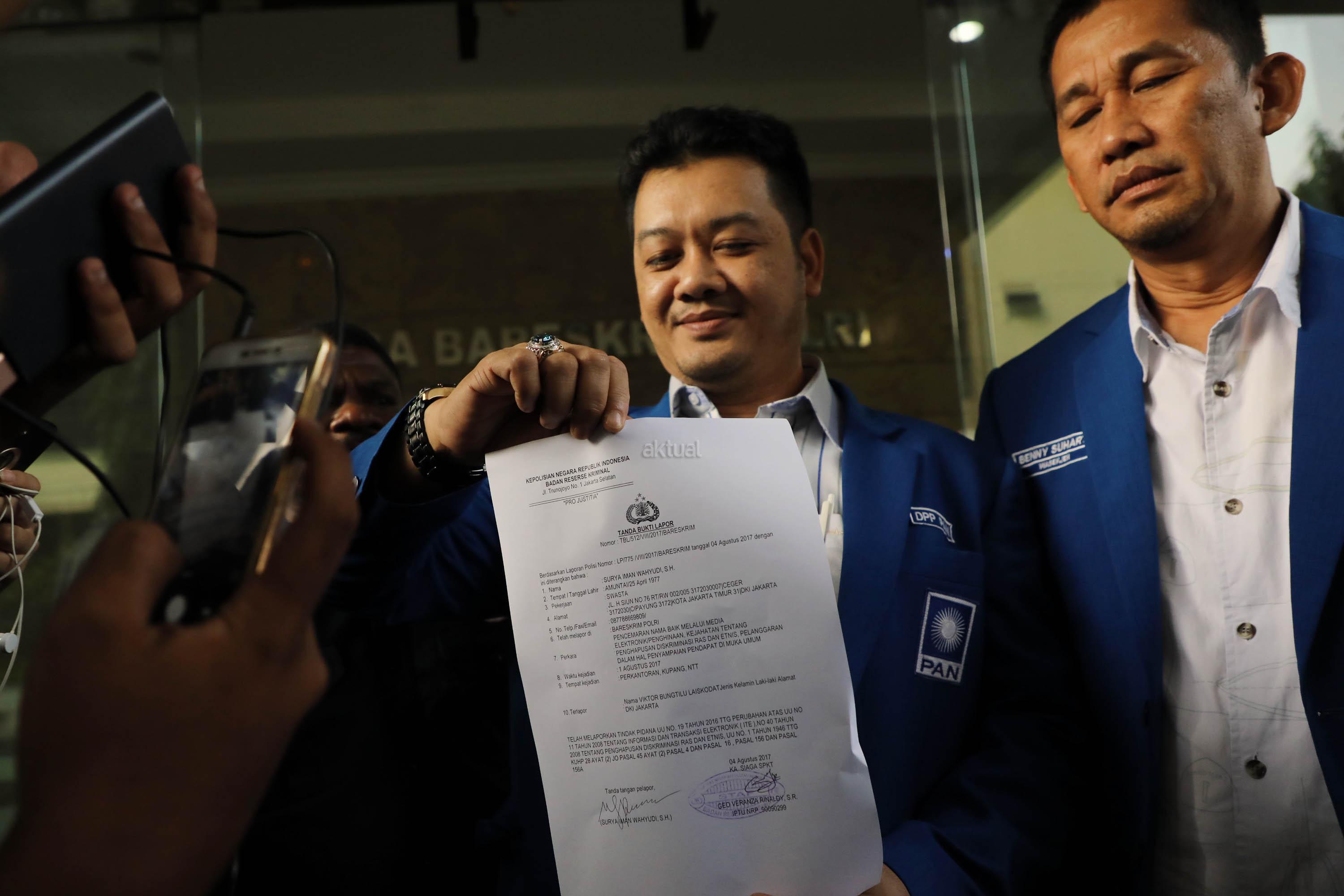 Wesekjen DPP PAN Surya Imam Wahyudi (kiri) saat menunjukan surat laporan atas nama Ketua Fraksi NasDem DPR RI,Viktor Bungtuli Laiskodat ke Bareskrim Polri di Gambir, Jakarta Pusat, Jumat (4/8/2017). Pelaporan ke bareskrim Polri ini setelah beredar video pidato Victor Bungtuli Laiskodat di Nusa Tenggara Timur (NTT) menyebutkan ada empat partai diantara Gerindra, Demokrat, PKS, dan PAN yang mendukung adanya khilafah. AKTUAL/Munzir