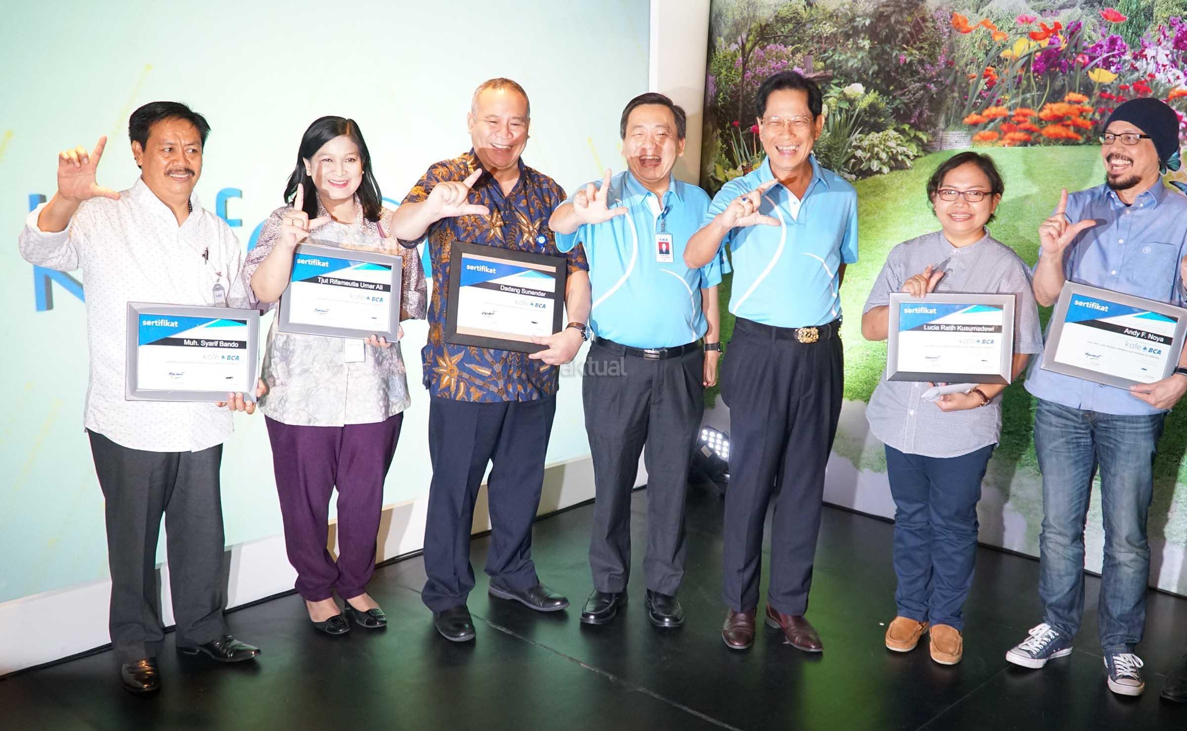 Dari kiri ke kanan, Presdir BCA Jahja Setiaatmadja, Presiden Direktur Blibli.com Kusumo Martanto, Kepala Perpustakaan Nasional RI Muh Syarif Bando, Kepala Badan Pengembangan dan Pembinaan Bahasa Dadang Sunendar, Direktur BCA Santoso, Host "Kick Andy" Andy F Noya memperlihatkan kaos kebaikan seusai acara forum Kafe BCA V yang mengupas bagaimana membaca perlu ditumbuhkan sedini mungkin serta peluncuran gerakan berbagi Buku untuk Indonesia di Jakarta, Rabu (15/3). Berdasarkan studi "Most Littered Nation In the World" yang dilakukan oleh Central Connecticut State University pada 2016 lalu, Indonesia dinyatakan menduduki peringkat ke 60 dari 61 negara soal minat membaca. Indonesia persis dibawah Thailand dan diatas Bostwana. Gerakan berbagi ini bertujuan untuk memberikan dan memperluas akses masyarakat terhadap buku sebagai sarana penunjang belajar. Sebagai bentuk apresiasi tersebut BCA menyediakan kaos kebaikan yang dipersembahkan kepada masyarakat yang ikut berpartisipasi dalam gerakan ini. AKTUAL/Eko S Hilman