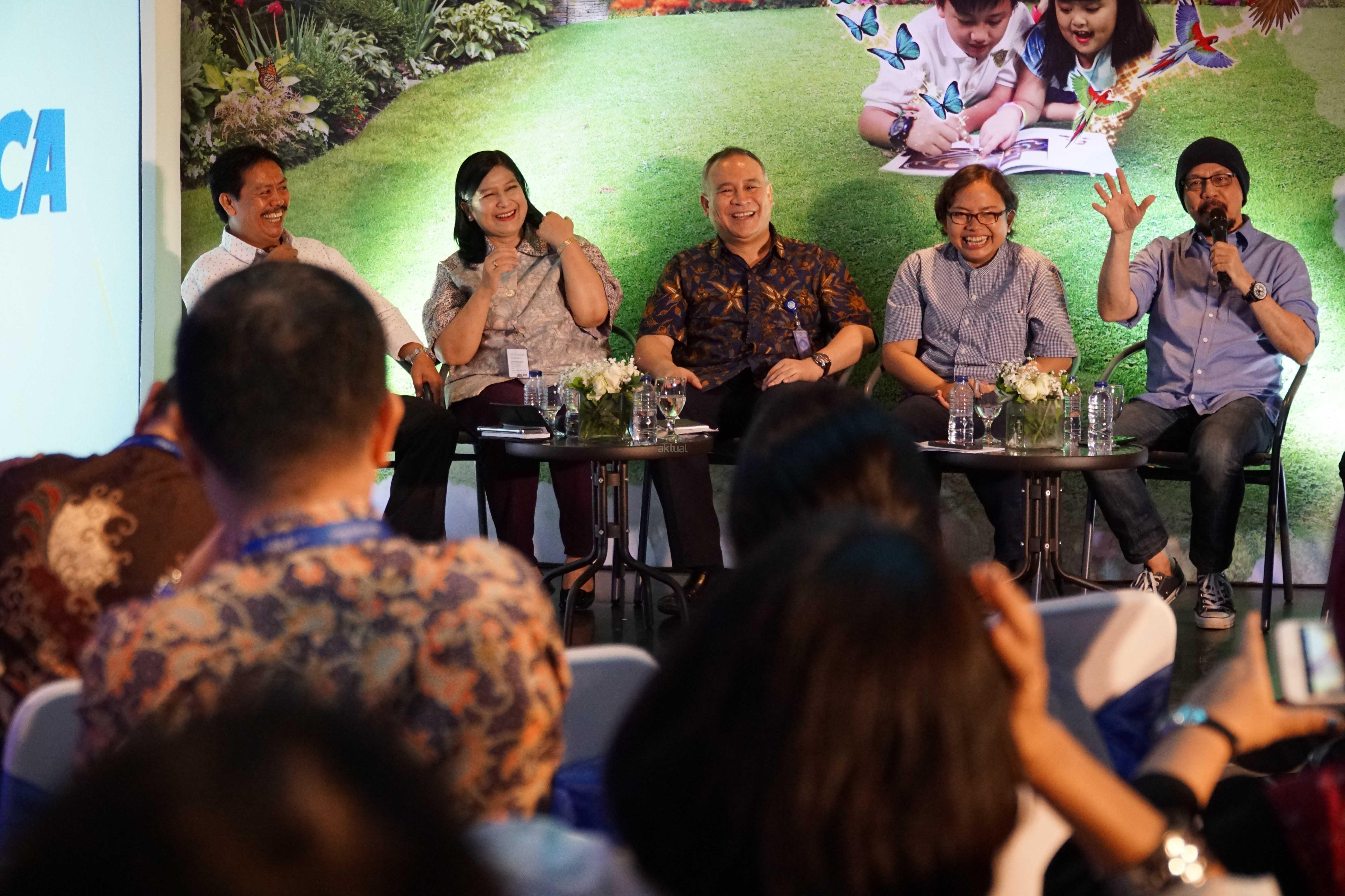 Dari kiri ke kanan, Kepala Perpustakaan Nasional RI Muh Syarif Bando, Dekan Fakultas Psikologi UI Tjut Rifameutia Umar, Kepala Badan Pengembangan dan Pembinaan Bahasa Dadang Sunendar, Dosen Sosiologi UI Lucia Ratih Kusumadewiserta Host “Kick Andy” Andy F Noya saat acara forum Kafe BCA V yang mengupas bagaimana membaca perlu ditumbuhkan sedini mungkin serta peluncuran gerakan berbagi Buku untuk Indonesia di Jakarta, Rabu (15/3). Berdasarkan studi “Most Littered Nation In the World” yang dilakukan oleh Central Connecticut State University pada 2016 lalu, Indonesia dinyatakan menduduki peringkat ke 60 dari 61 negara soal minat membaca. Indonesia persis dibawah Thailand dan diatas Bostwana. Gerakan berbagi ini bertujuan untuk memberikan dan memperluas akses masyarakat terhadap buku sebagai sarana penunjang belajar. Sebagai bentuk apresiasi tersebut BCA menyediakan kaos kebaikan yang dipersembahkan kepada masyarakat yang ikut berpartisipasi dalam gerakan ini. AKTUAL/Eko S Hilman