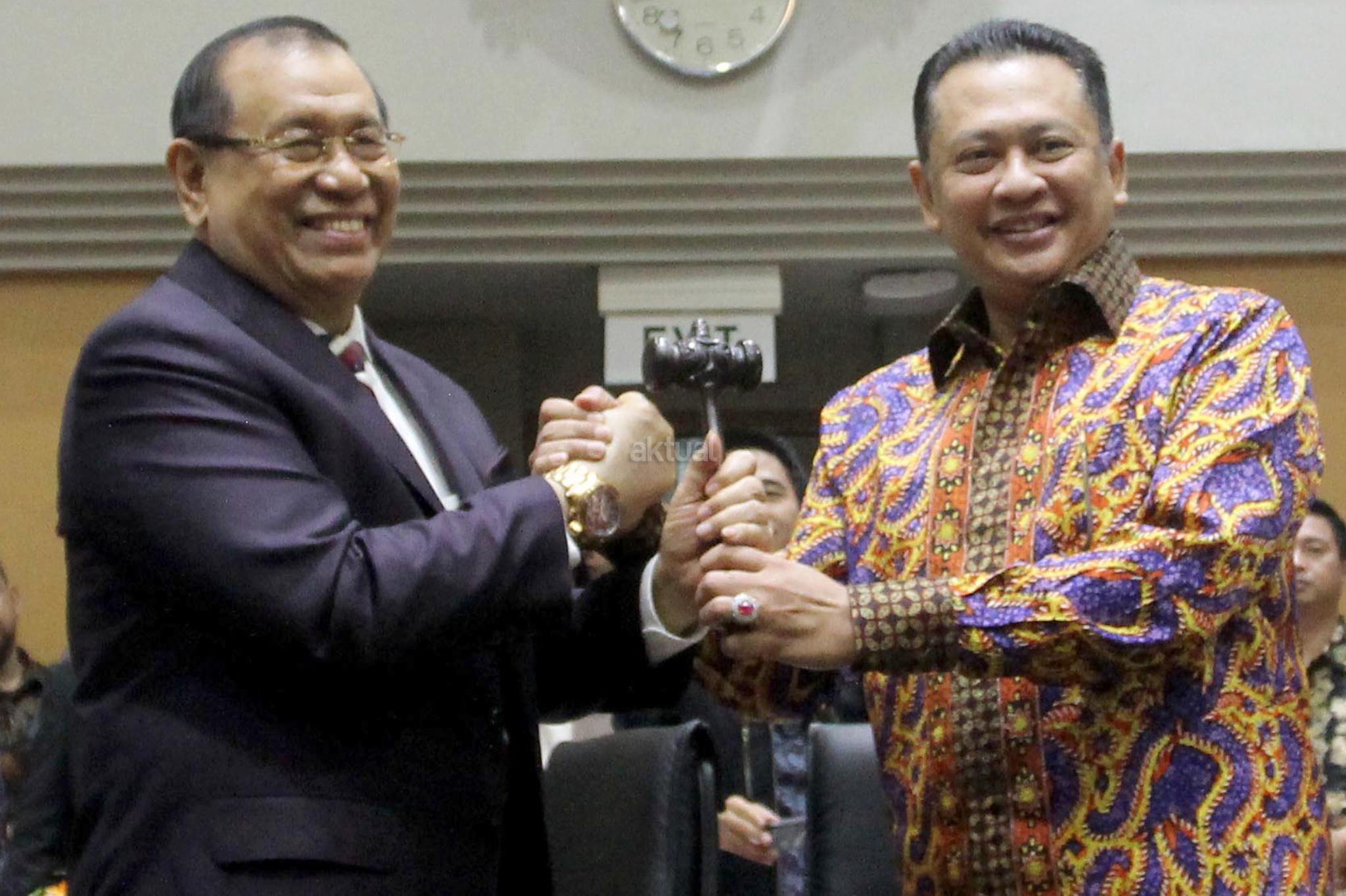 Ketua DPR Bambang Soesatyo (kedua dari kanan) didampingi Wakil Ketua Komisi III Fraksi PDIP Trimedya Panjaitan (kiri), Fraksi Demokrat Benny K Harman (kedua dari kiri), dan Fraksi PAN Mulfachri Harahap (kanan), menyerahkan palu pimpinan Ketua KomisI III DPR Fraksi Golkar kepada Kahar Muzakir (tengah) saat pelatikan, di ruang rapat Komisi III DPR, Gedung Nusantara II, Kompleks Parlemen Senayan, Jakarta, Rabu (24/1). Kahar Muzakir ditunjuk Fraksi Partai Golkar untuk menggantikan Bambang Soesatyo yang kini menjadi Ketua DPR. AKTUAL/Tino Oktaviano