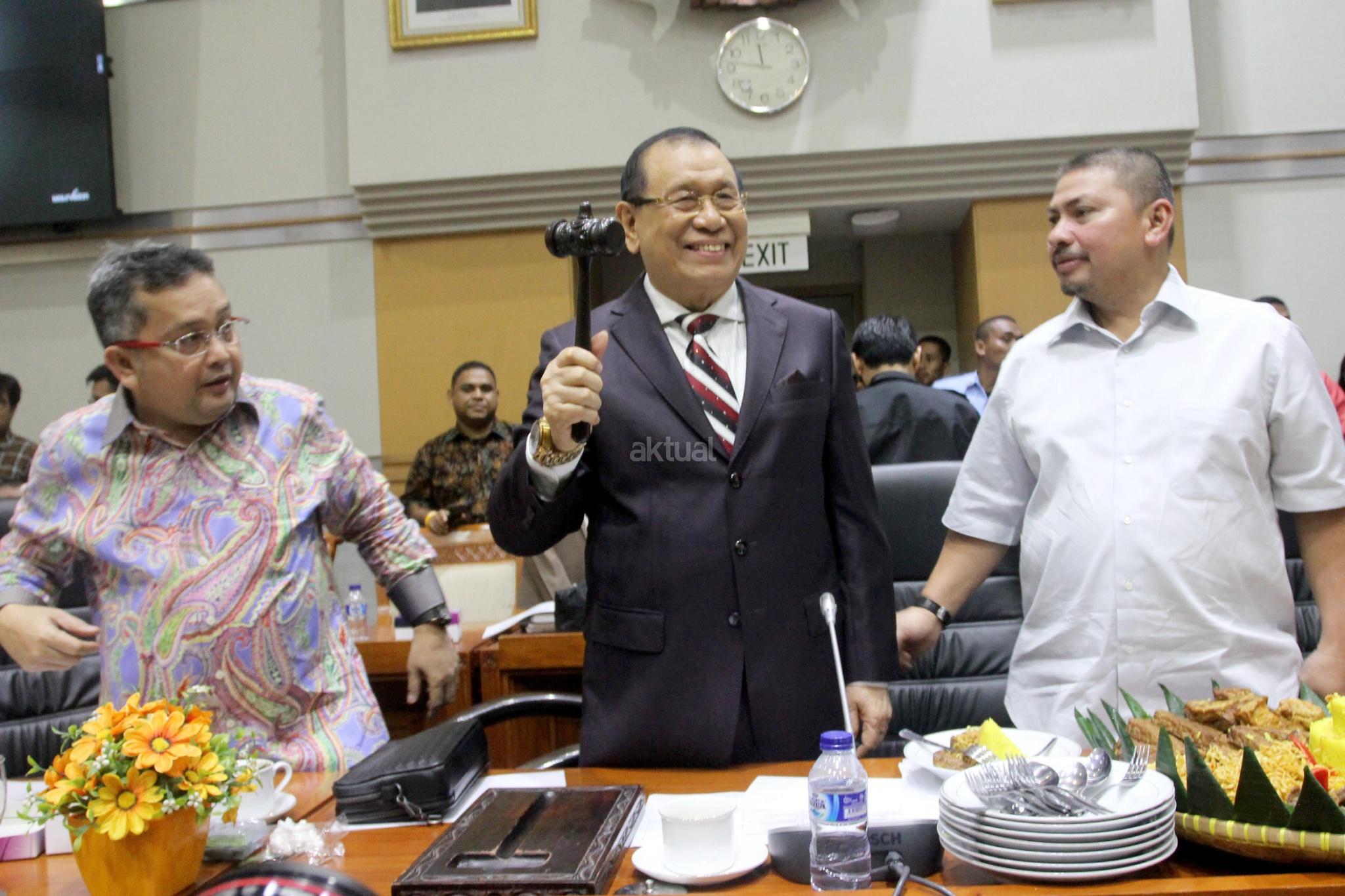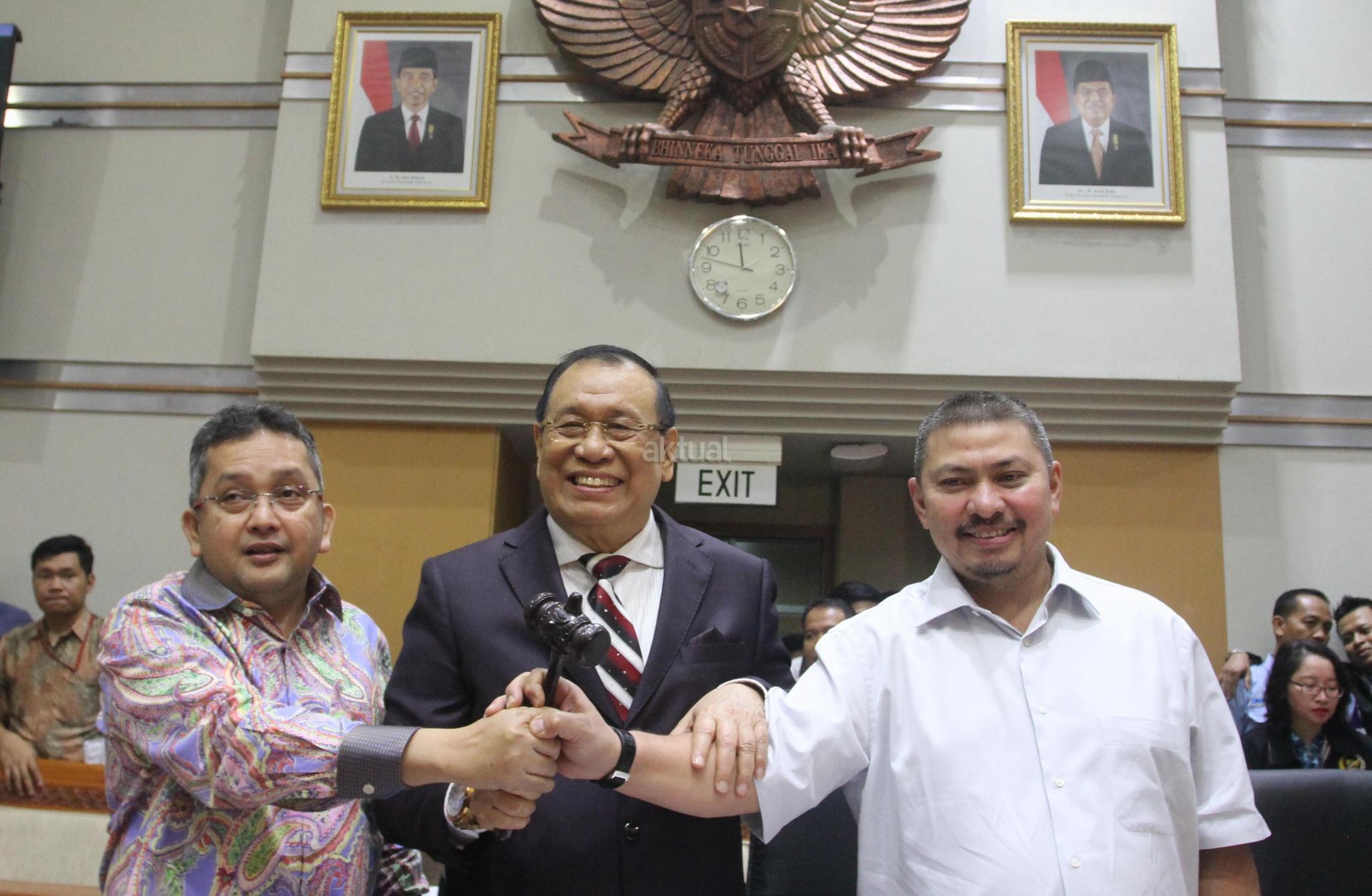 Ketua KomisI III DPR dari Fraksi Golkar yang baru Kahar Muzakir, didampingi Wakil Ketua Komisi III Fraksi PDIP Trimedya Panjaitan (kiri) dan Wakil Ketua Komisi III Fraksi PAN Mulfachri Harahap (kanan), memegang palu pimpinan usai dilantik, di ruang rapat Komisi III DPR, Gedung Nusantara II, Kompleks Parlemen Senayan, Jakarta, Rabu (24/1). Kahar Muzakir ditunjuk Fraksi Partai Golkar untuk menggantikan Bambang Soesatyo yang kini menjadi Ketua DPR. AKTUAL/Tino Oktaviano