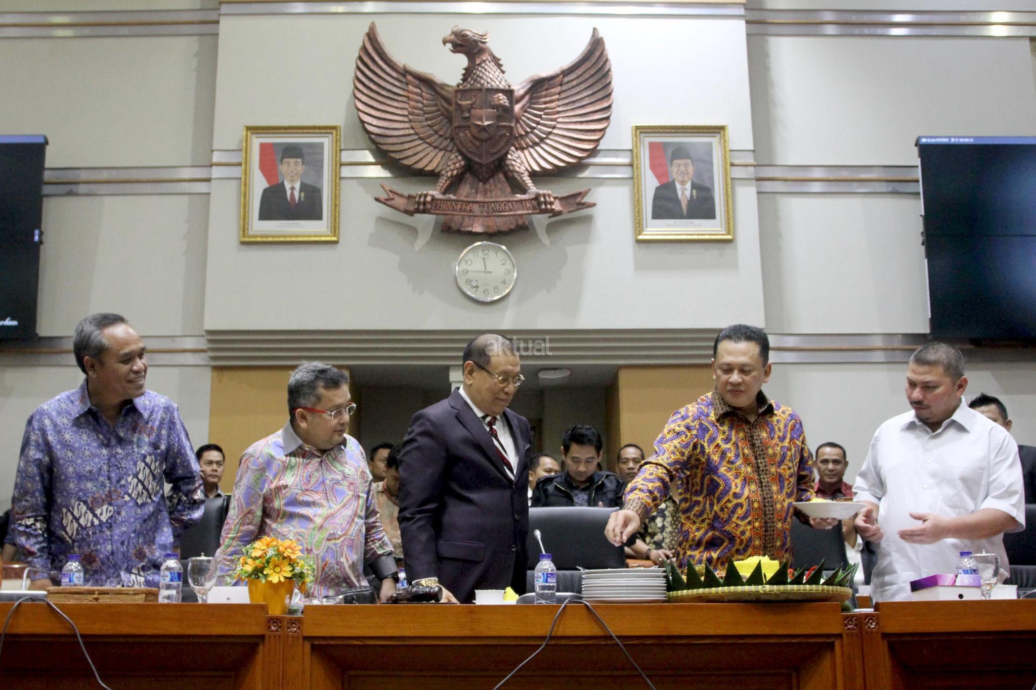 Ketua DPR Bambang Soesatyo (kedua dari kanan) didampingi Wakil Ketua Komisi III Fraksi Demokrat Benny K Harman (kiri), Fraksi PDIP Trimedya Panjaitan (kedua dari kiri) dan Fraksi PAN Mulfachri Harahap (kanan), memotong tumpeng usai pelatikan dan serah terima jabatan Ketua KomisI III DPR Fraksi Golkar kepada Kahar Muzakir (tengah), di ruang rapat Komisi III DPR, Gedung Nusantara II, Kompleks Parlemen Senayan, Jakarta, Rabu (24/1). Kahar Muzakir ditunjuk Fraksi Partai Golkar untuk menggantikan Bambang Soesatyo yang kini menjadi Ketua DPR. AKTUAL/Tino Oktaviano