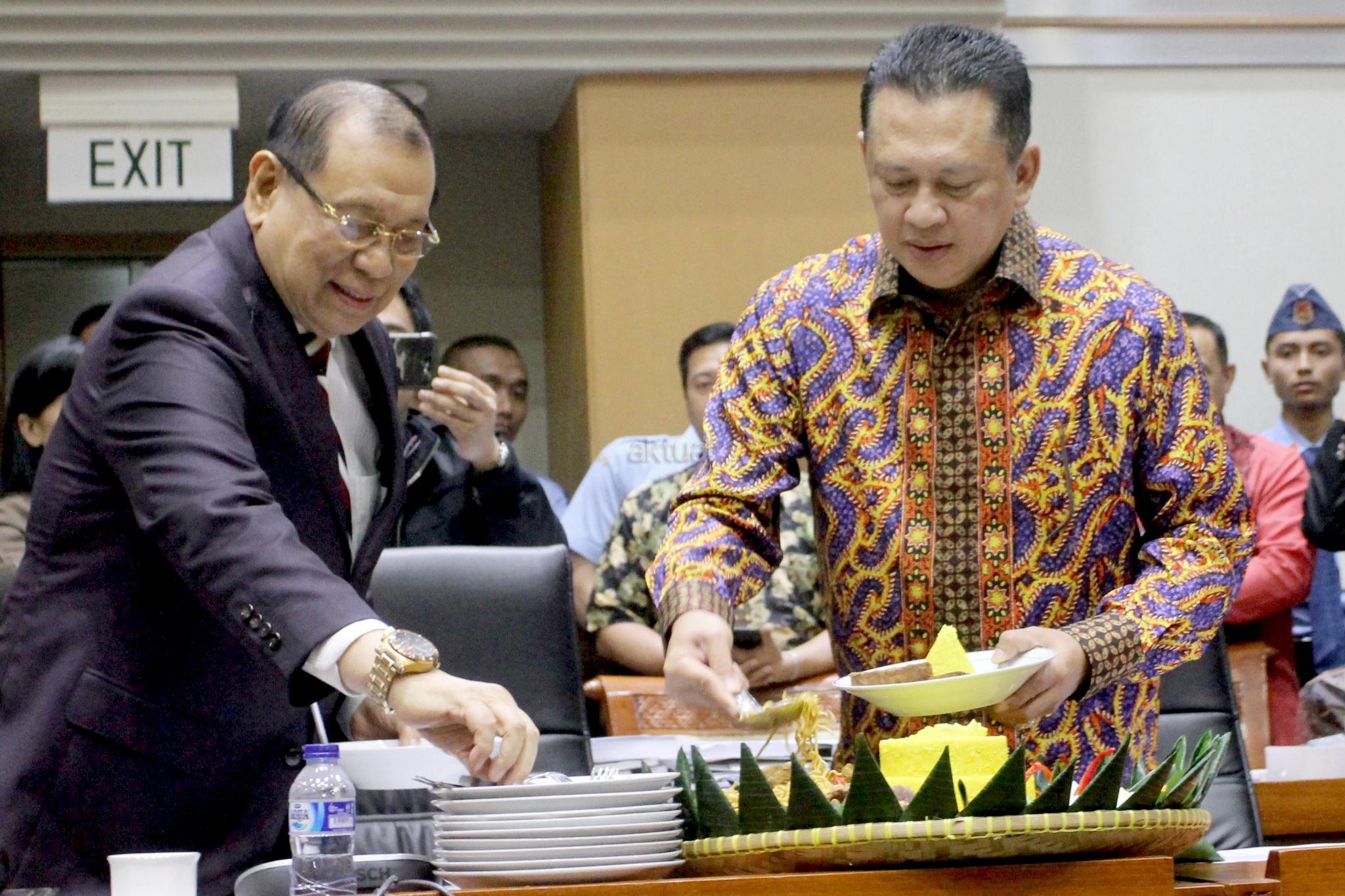 Ketua DPR Bambang Soesatyo (kanan), memotong tumpeng usai pelatikan dan serah terima jabatan Ketua KomisI III DPR Fraksi Golkar kepada Kahar Muzakir (kiri), di ruang rapat Komisi III DPR, Gedung Nusantara II, Kompleks Parlemen Senayan, Jakarta, Rabu (24/1). Kahar Muzakir ditunjuk Fraksi Partai Golkar untuk menggantikan Bambang Soesatyo yang kini menjadi Ketua DPR. AKTUAL/Tino Oktaviano