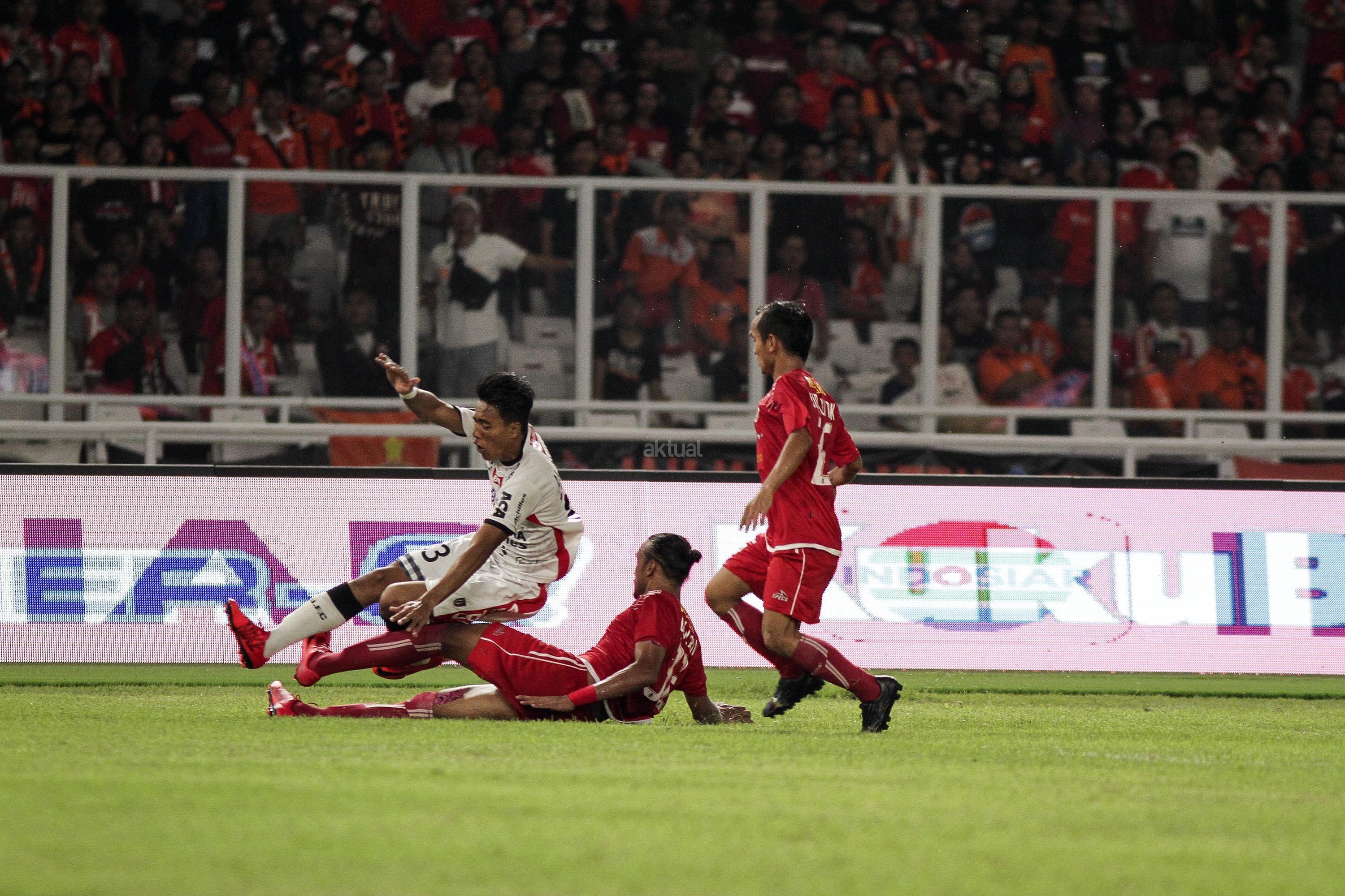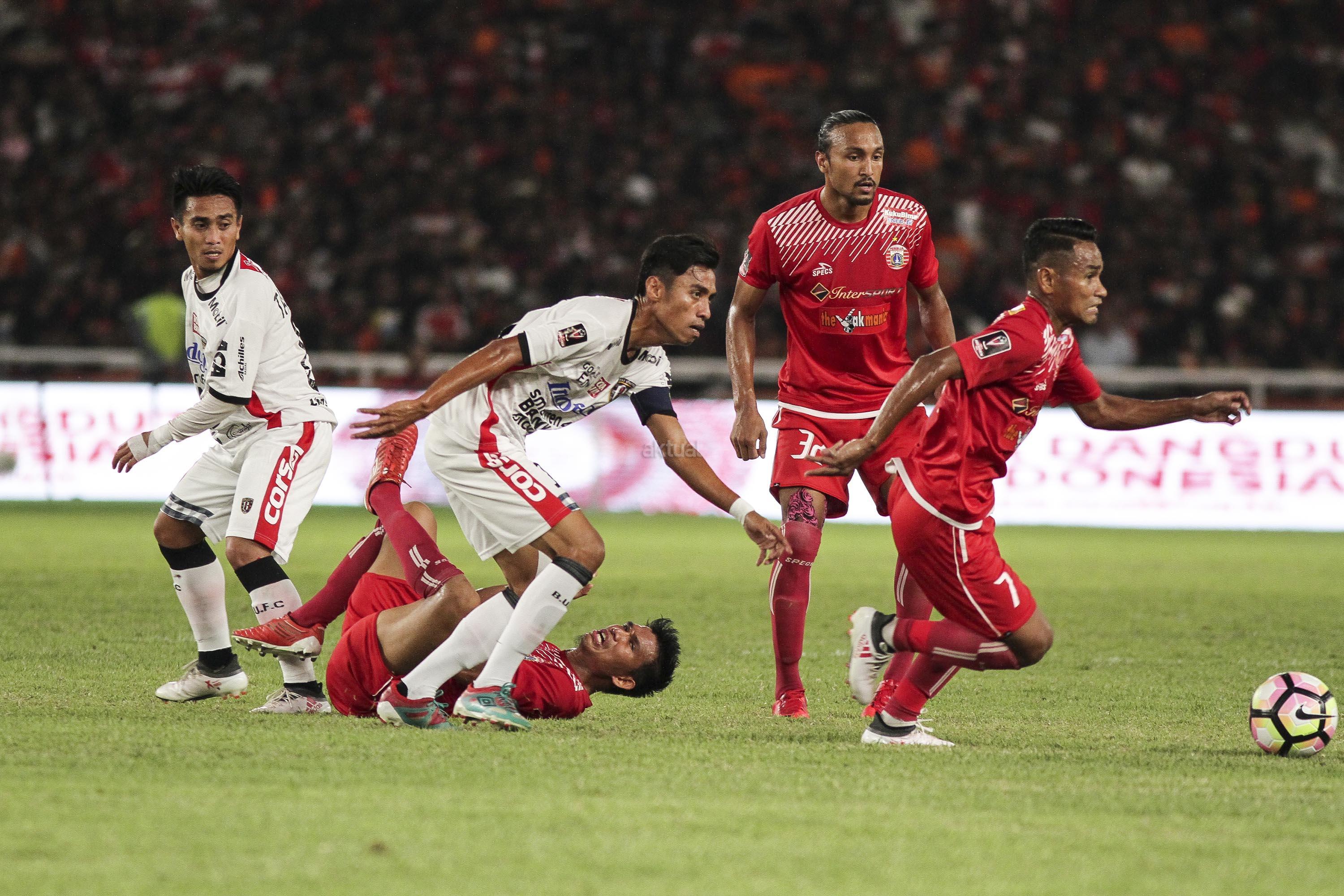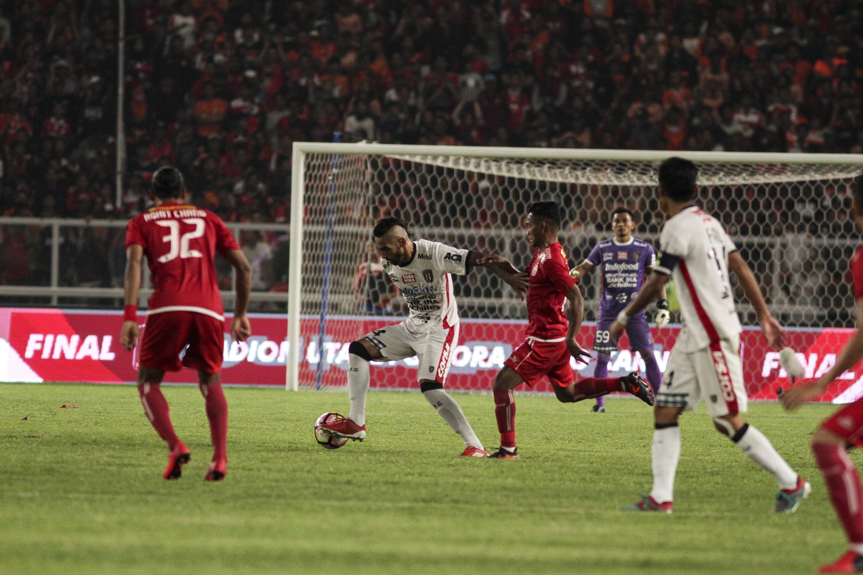 Pesepak bola Persija Jakarta berebut bola dengan pesepak bola Bali United pada pertandingan final Piala Presiden 2018 di Stadion Utama Gelora Bung Karno, Senayan, Jakarta, Sabtu (17/2). Persija menjadi juara Piala Presiden 2018 setelah mengalahkan Bali United dengan skor 3-0. AKTUAL/Str
