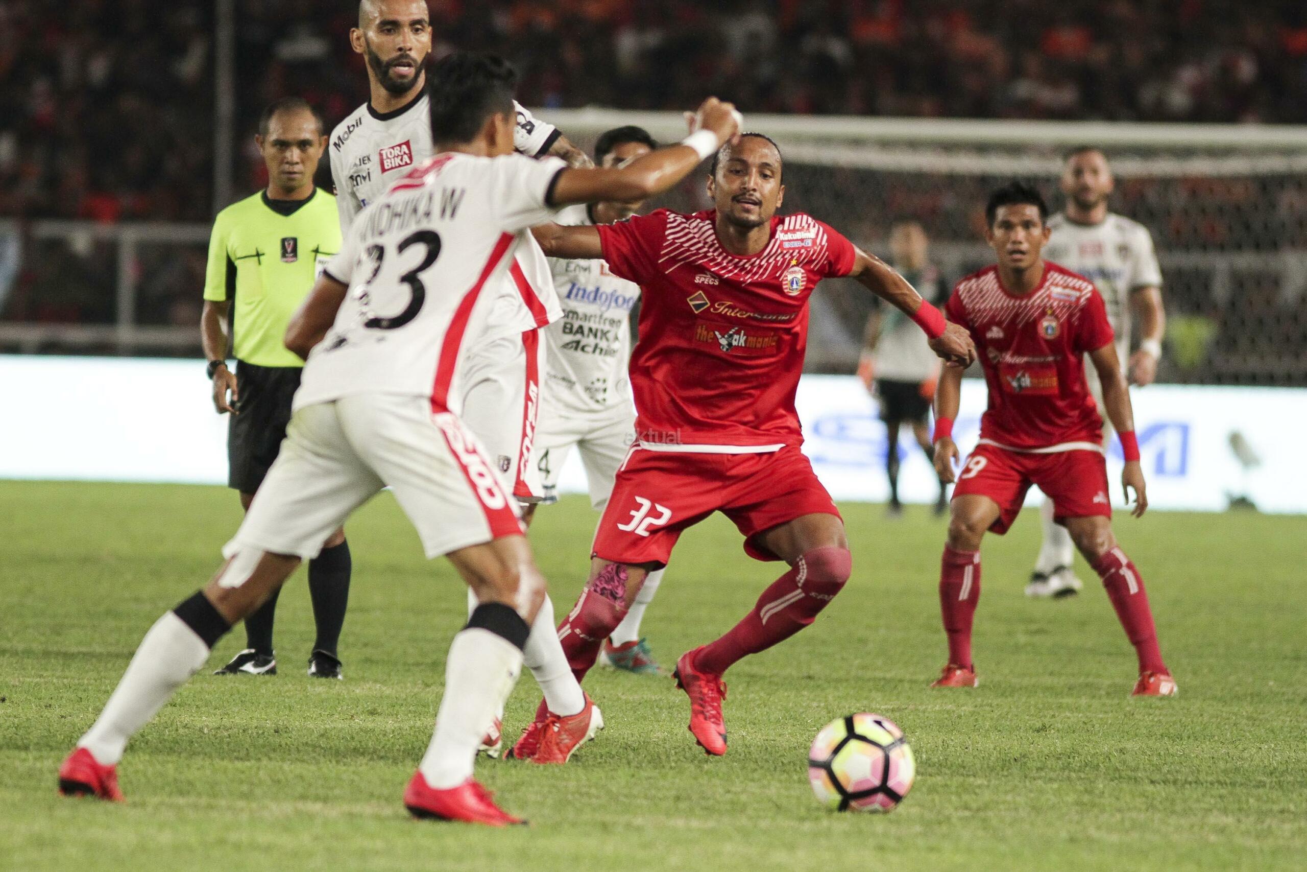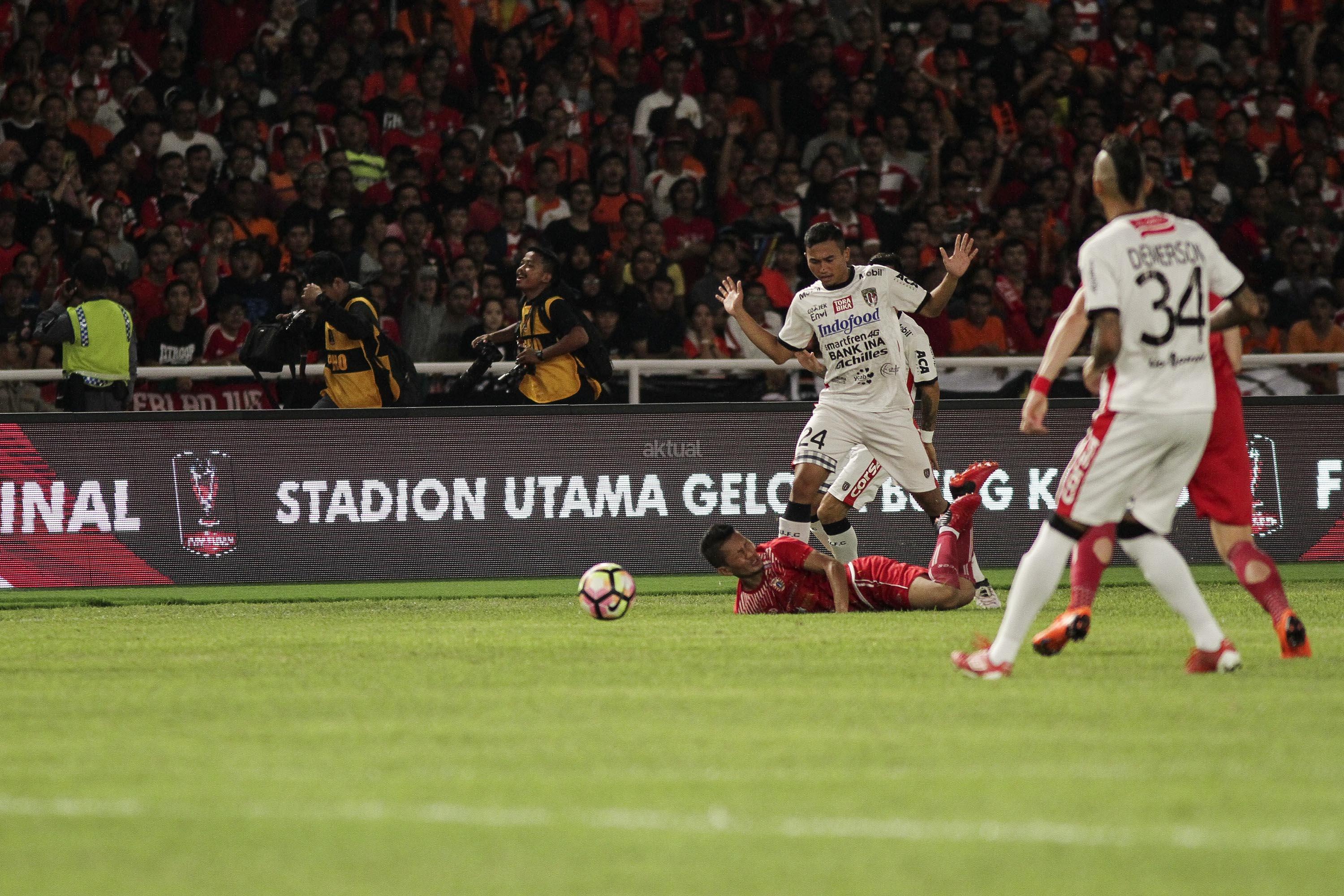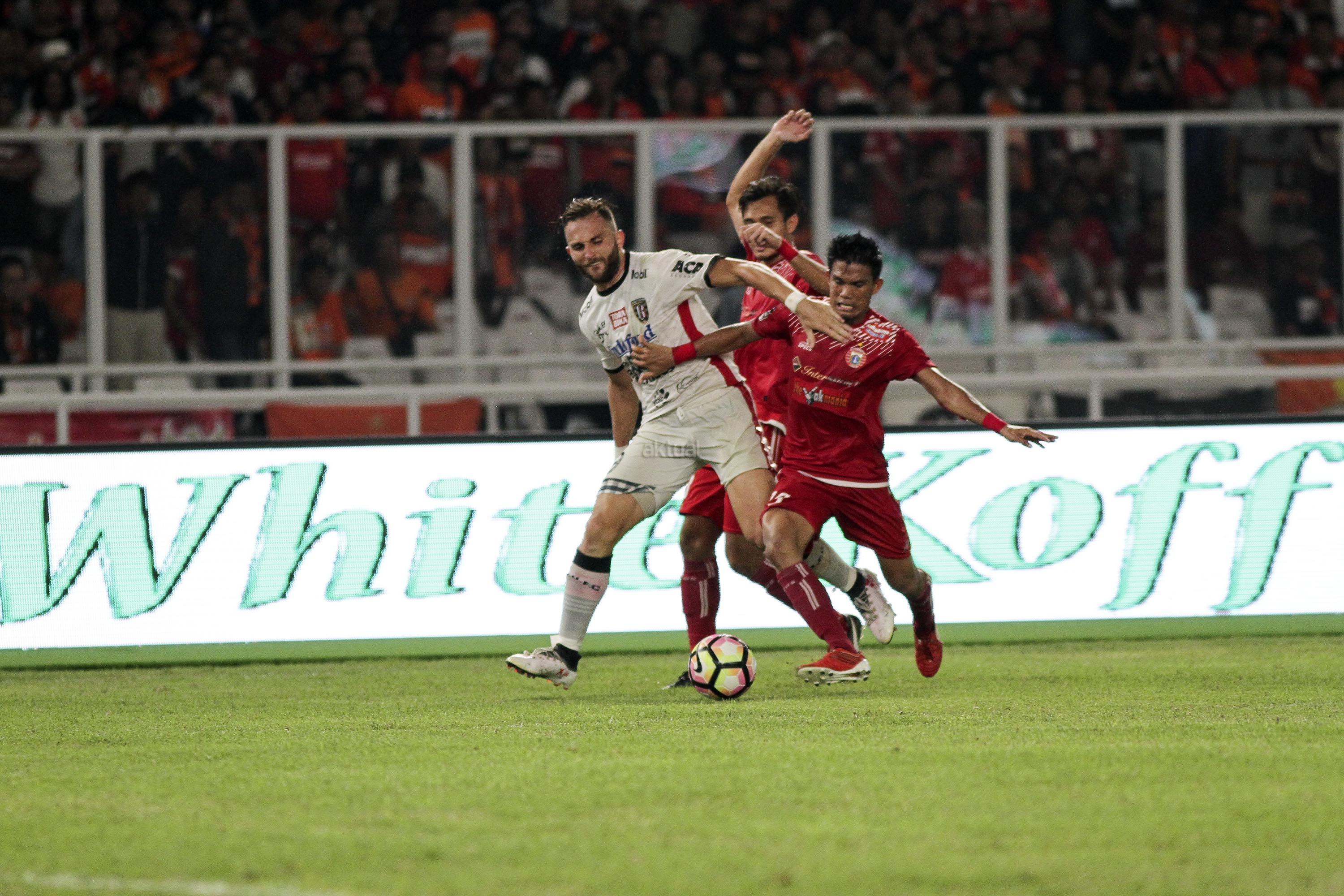 Pesepak bola Persija Jakarta berebut bola dengan pesepak bola Bali United pada pertandingan final Piala Presiden 2018 di Stadion Utama Gelora Bung Karno, Senayan, Jakarta, Sabtu (17/2). Persija menjadi juara Piala Presiden 2018 setelah mengalahkan Bali United dengan skor 3-0. AKTUAL/Str