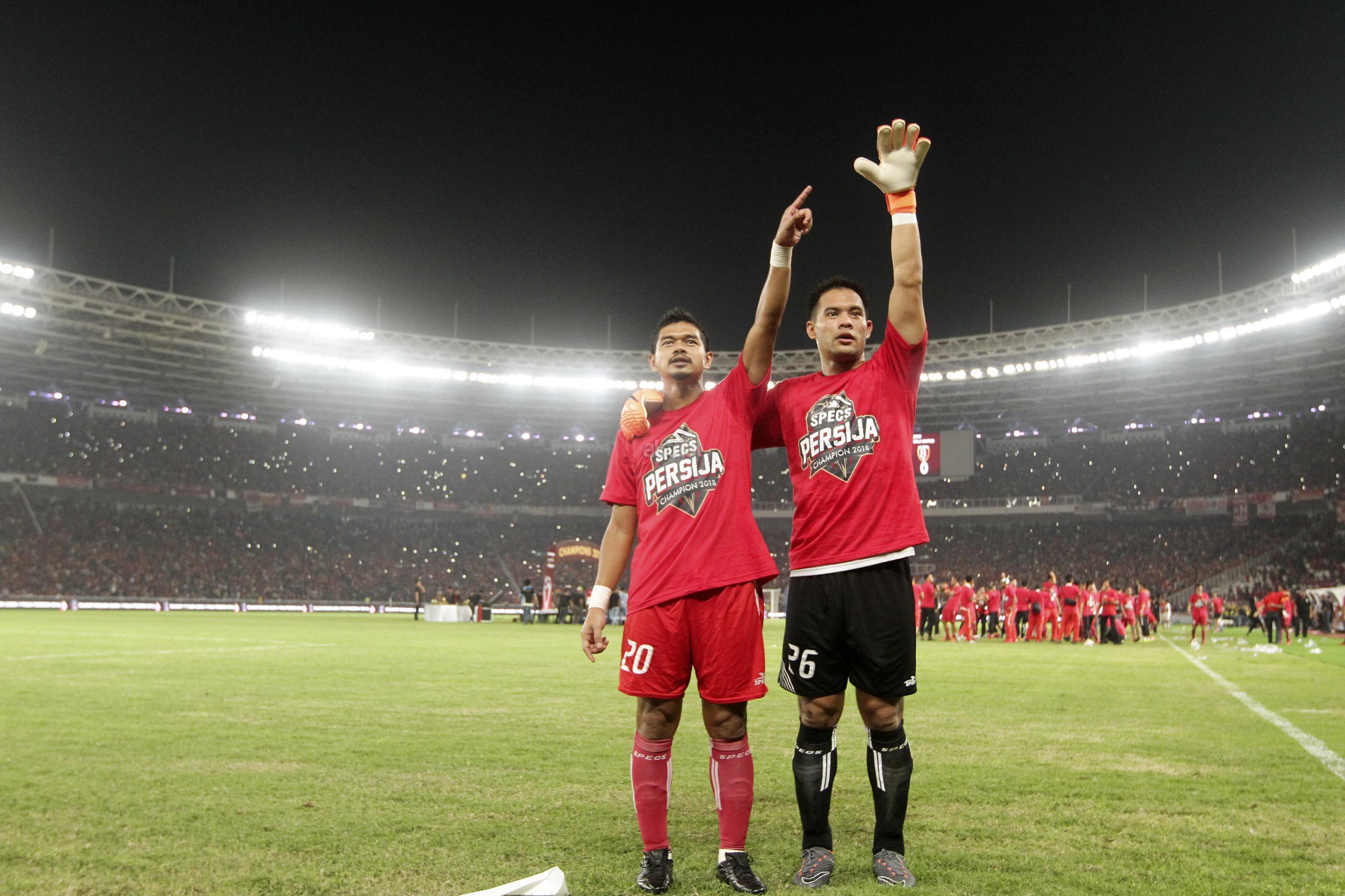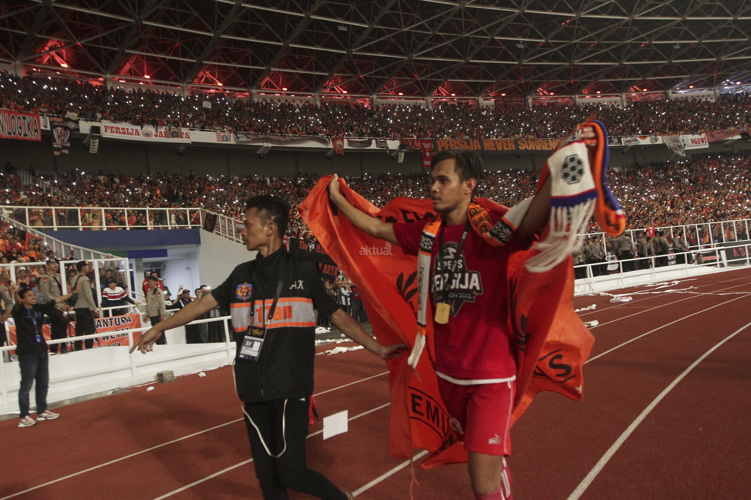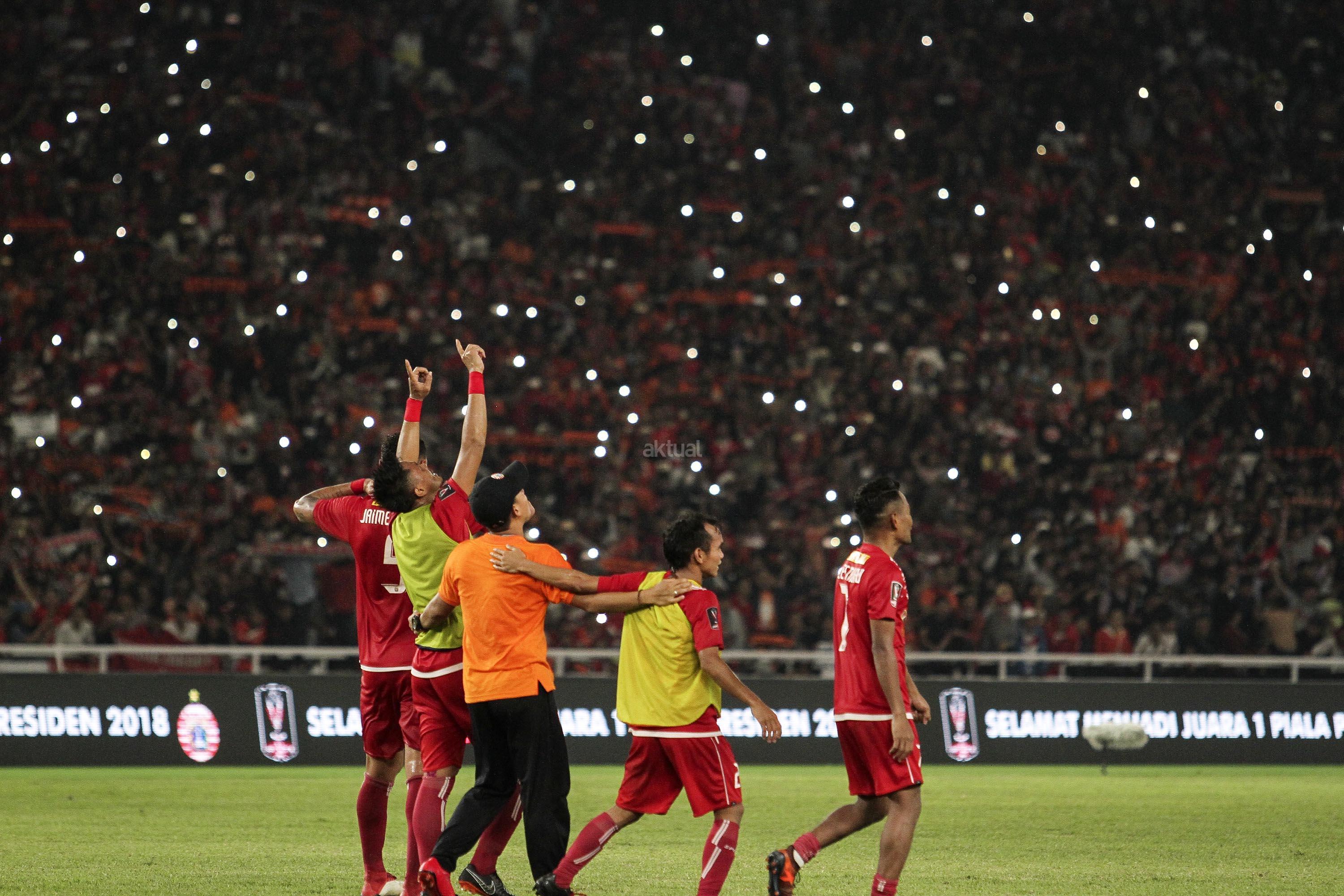 Pesepak bola Persija Jakarta melakukan selebrasi saat saat menang melawan Bali United pada pertandingan final Piala Presiden 2018 di Stadion Utama Gelora Bung Karno, Senayan, Jakarta, Sabtu (17/2). Persija menjadi juara Piala Presiden 2018 setelah mengalahkan Bali United dengan skor 3-0. AKTUAL/Str