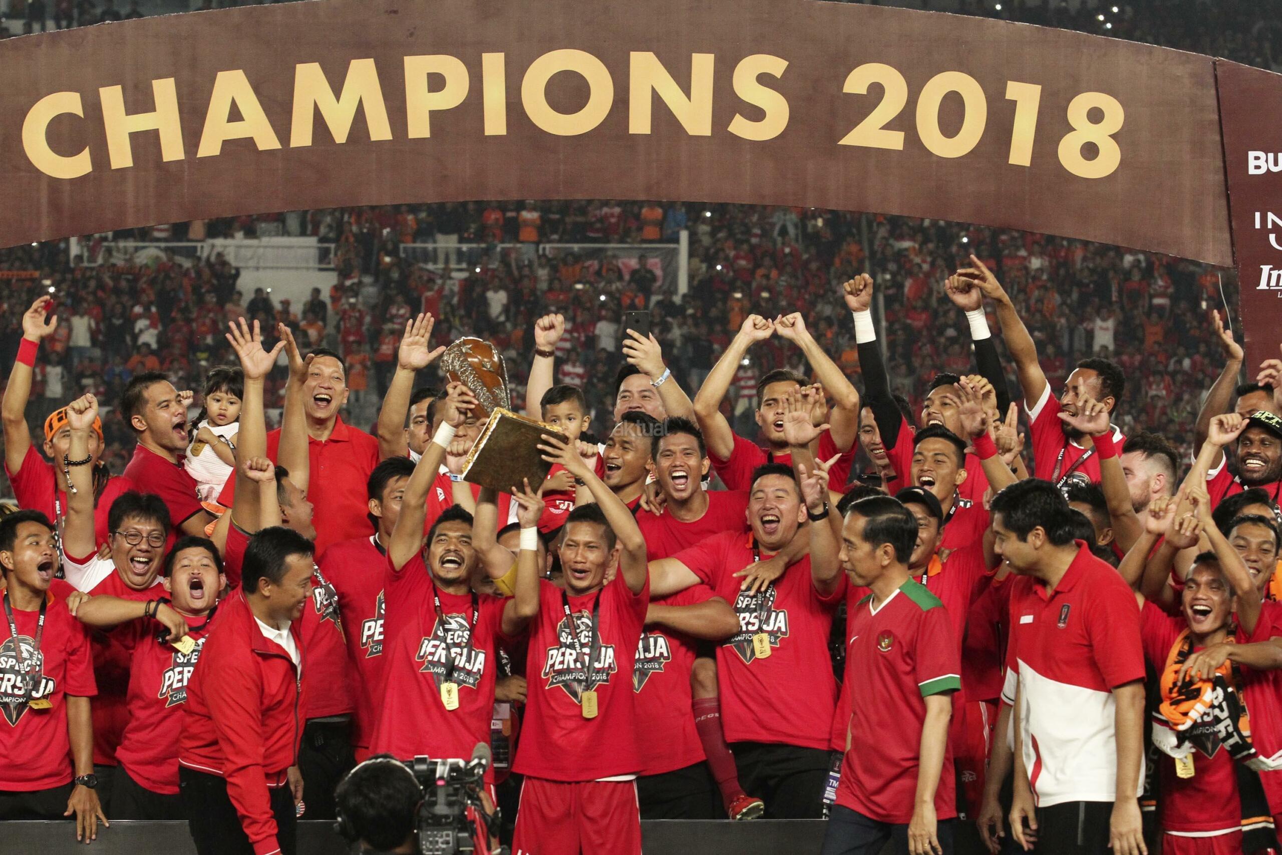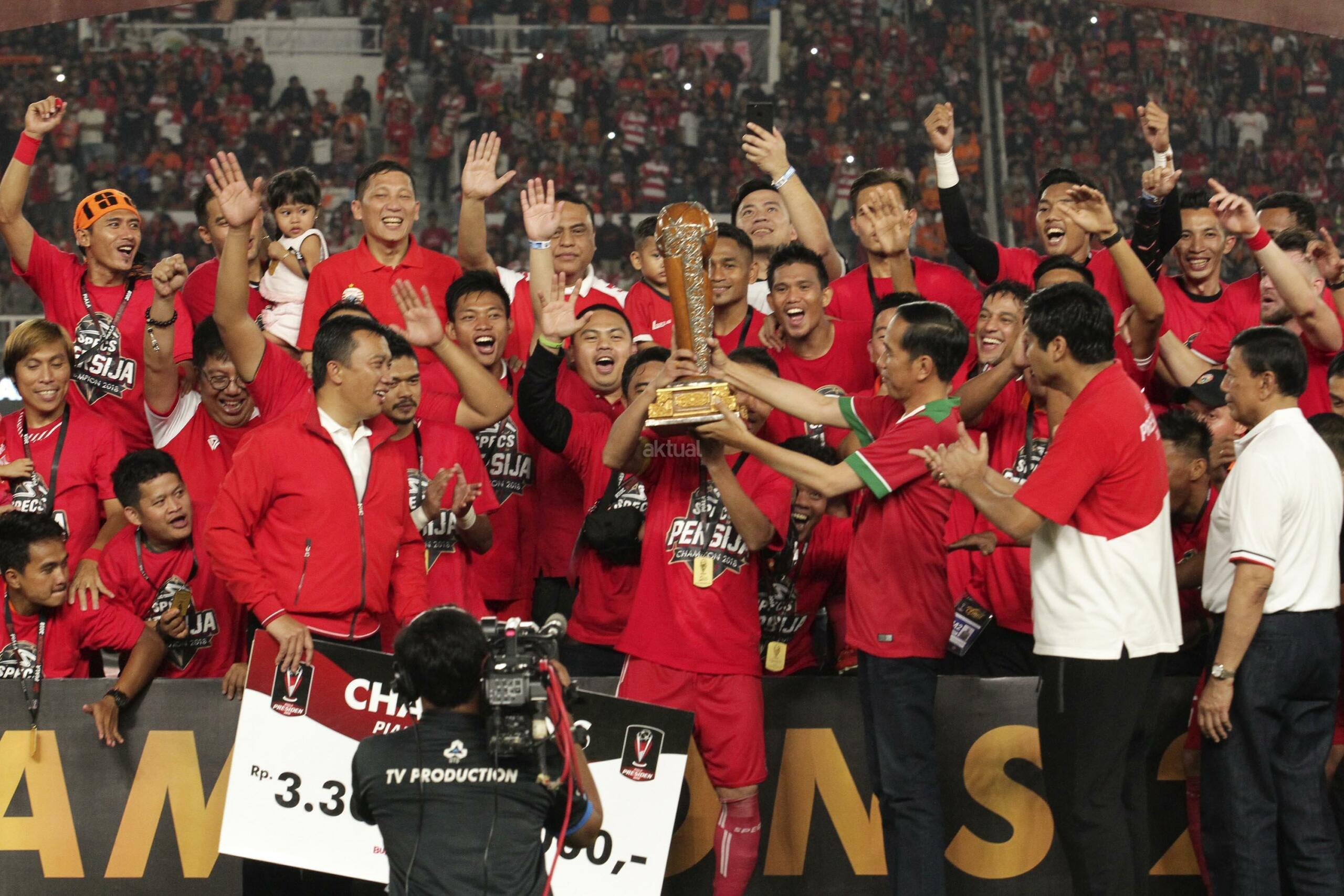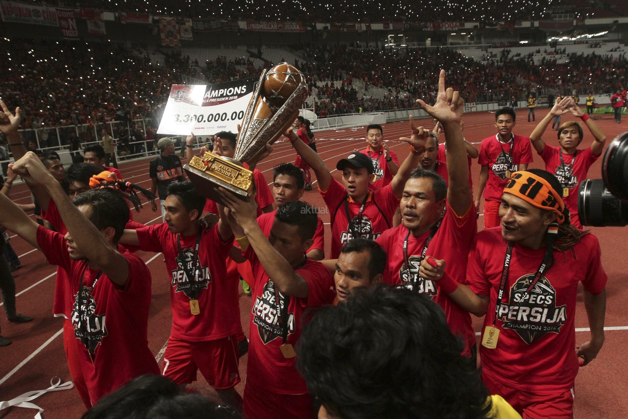 Pesepak bola Persija Jakarta mengangkat piala mengelilingi stadion seusai menang melawan Bali United pada final Piala Presiden 2018 di Stadion Utama Gelora Bung Karno, Senayan, Jakarta, Sabtu (17/2). Persija menjadi juara Piala Presiden 2018 setelah mengalahkan Bali United dengan skor 3-0. AKTUAL/Str