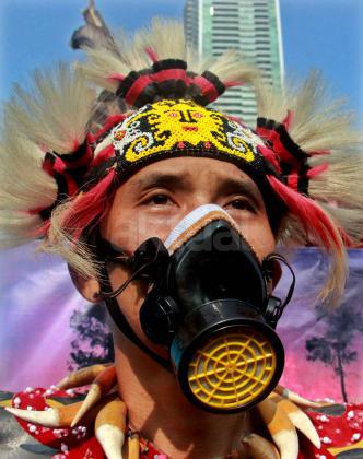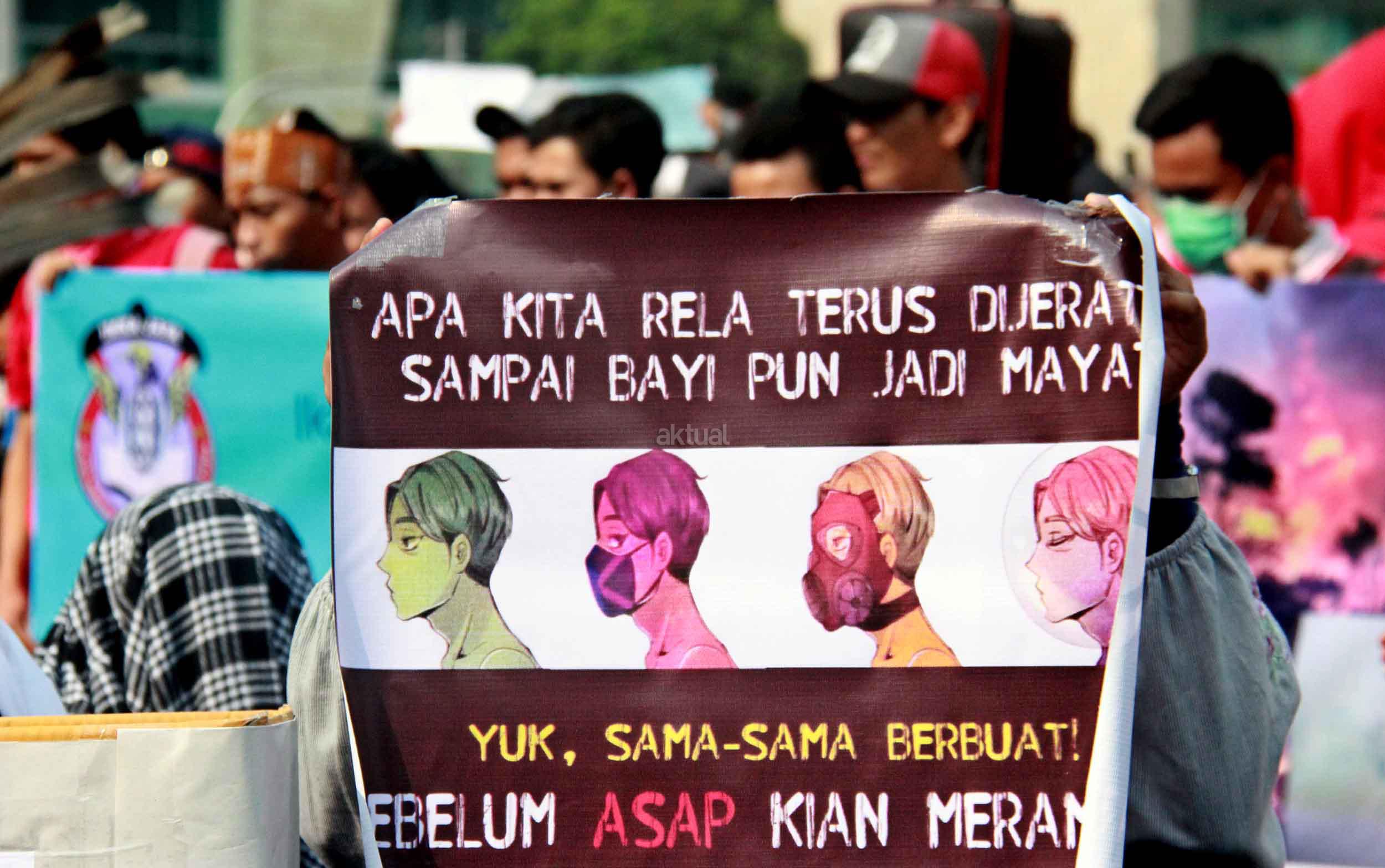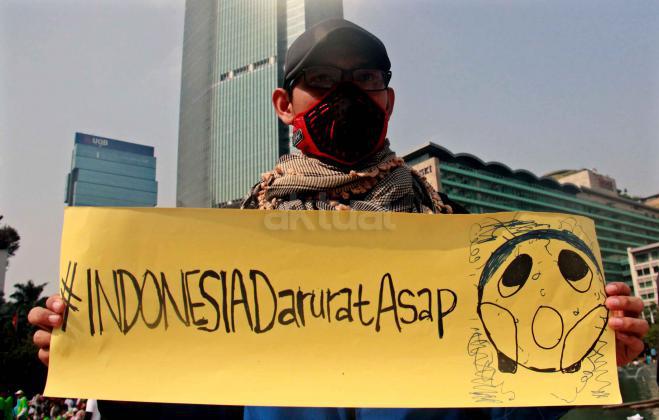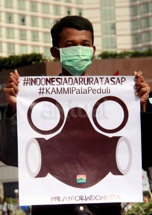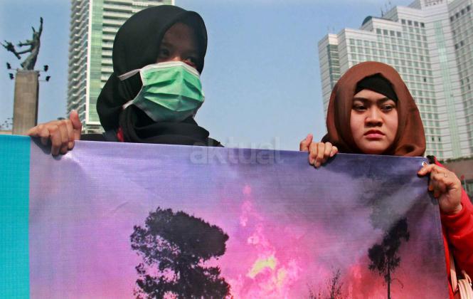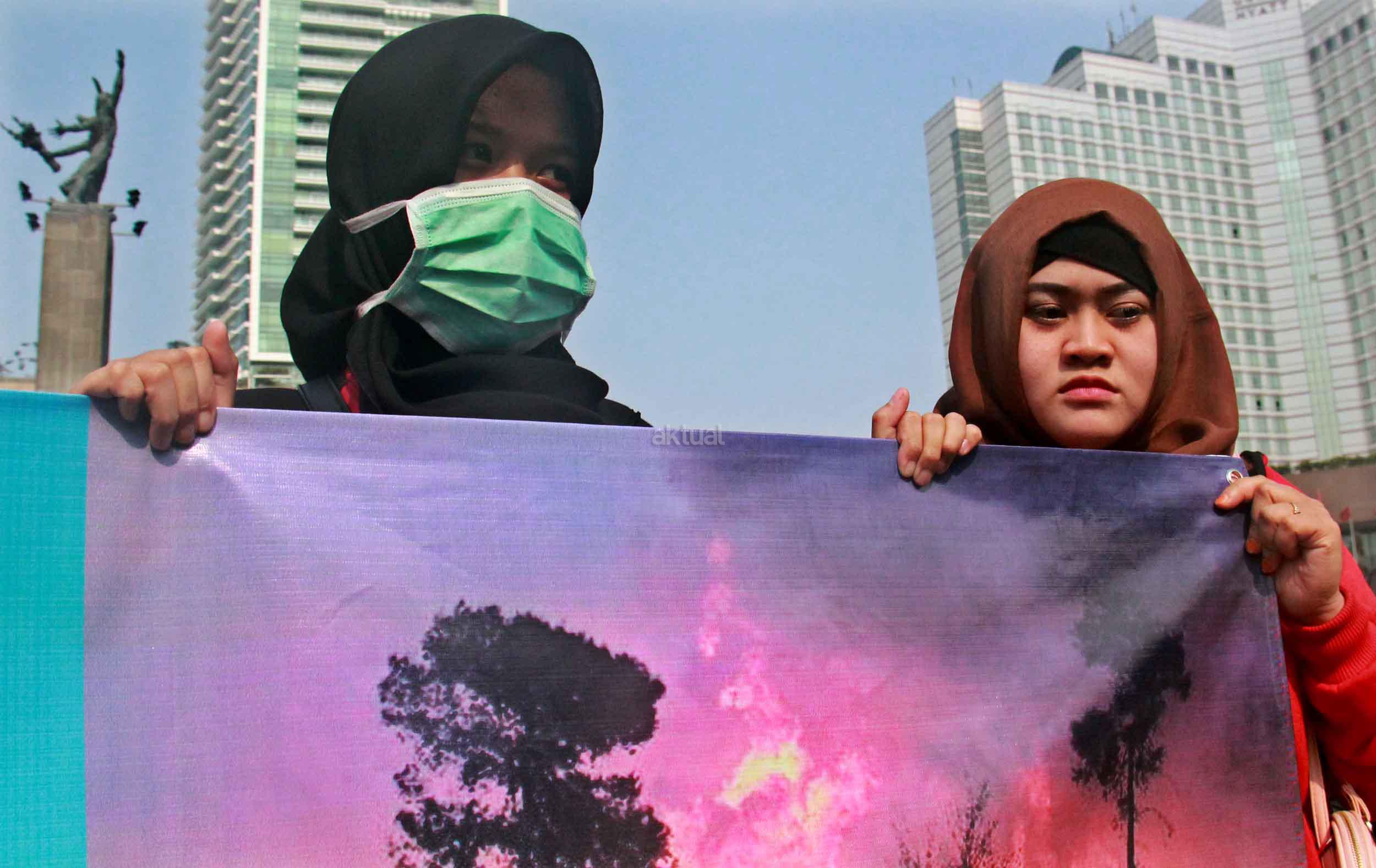 Puluhan mahasiswa yang tergabung Ikatan Mahasiswa Kalimantan Tengah Jakarta Raya (IMKA JAYA) di Bunderan HI, Jakarta, Minggu (11/10/2015). Dalam aksinya IMKA JAYA mempertanyakan kinerja pemerintah dalam menangani dampak asap di wilayah Kalimantan, bencana tahunan tersebut seharusnya dapat dicegah.