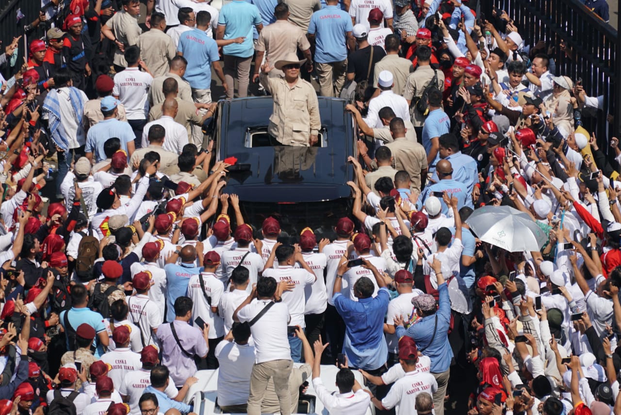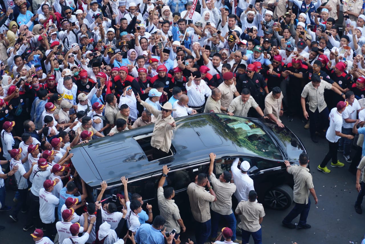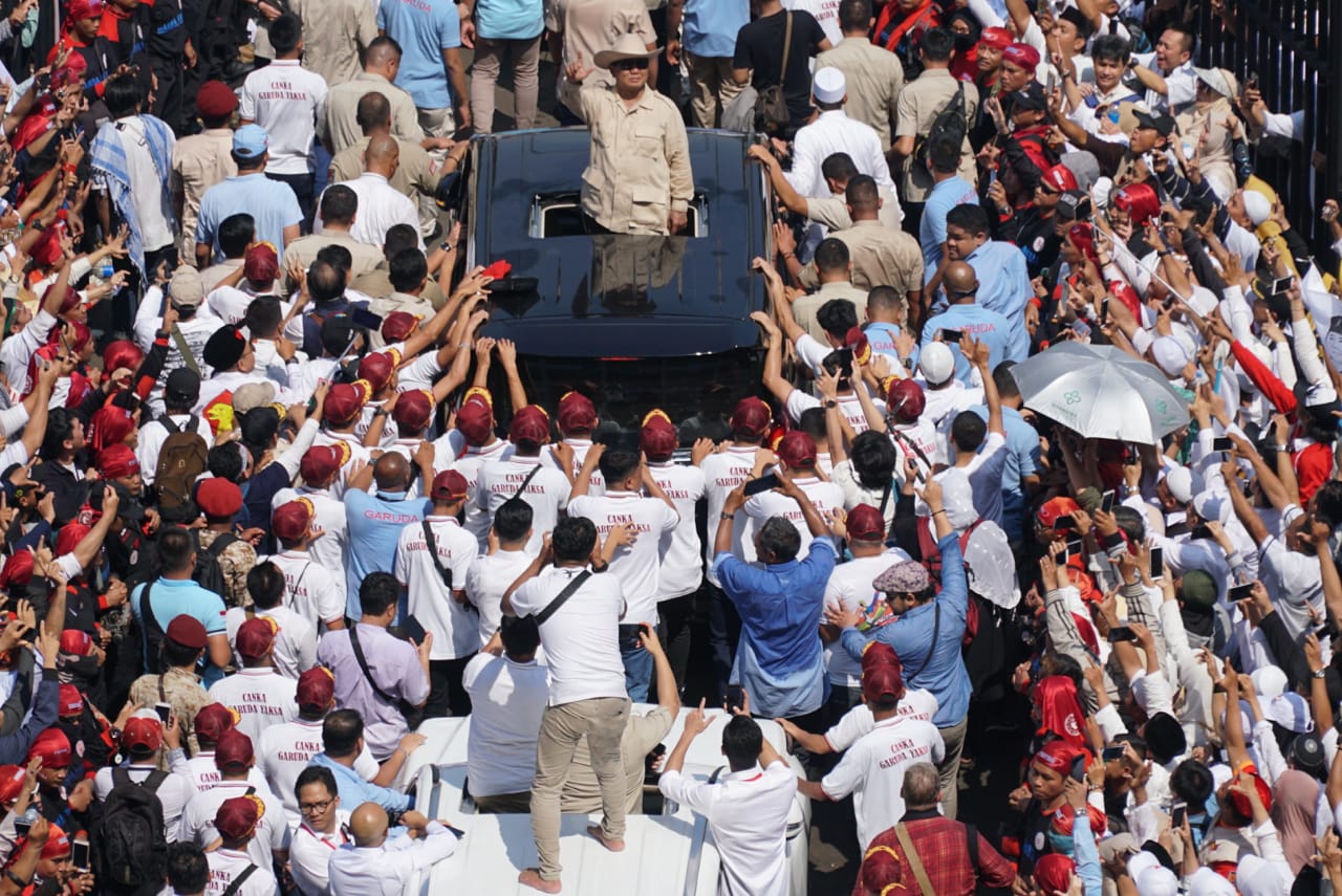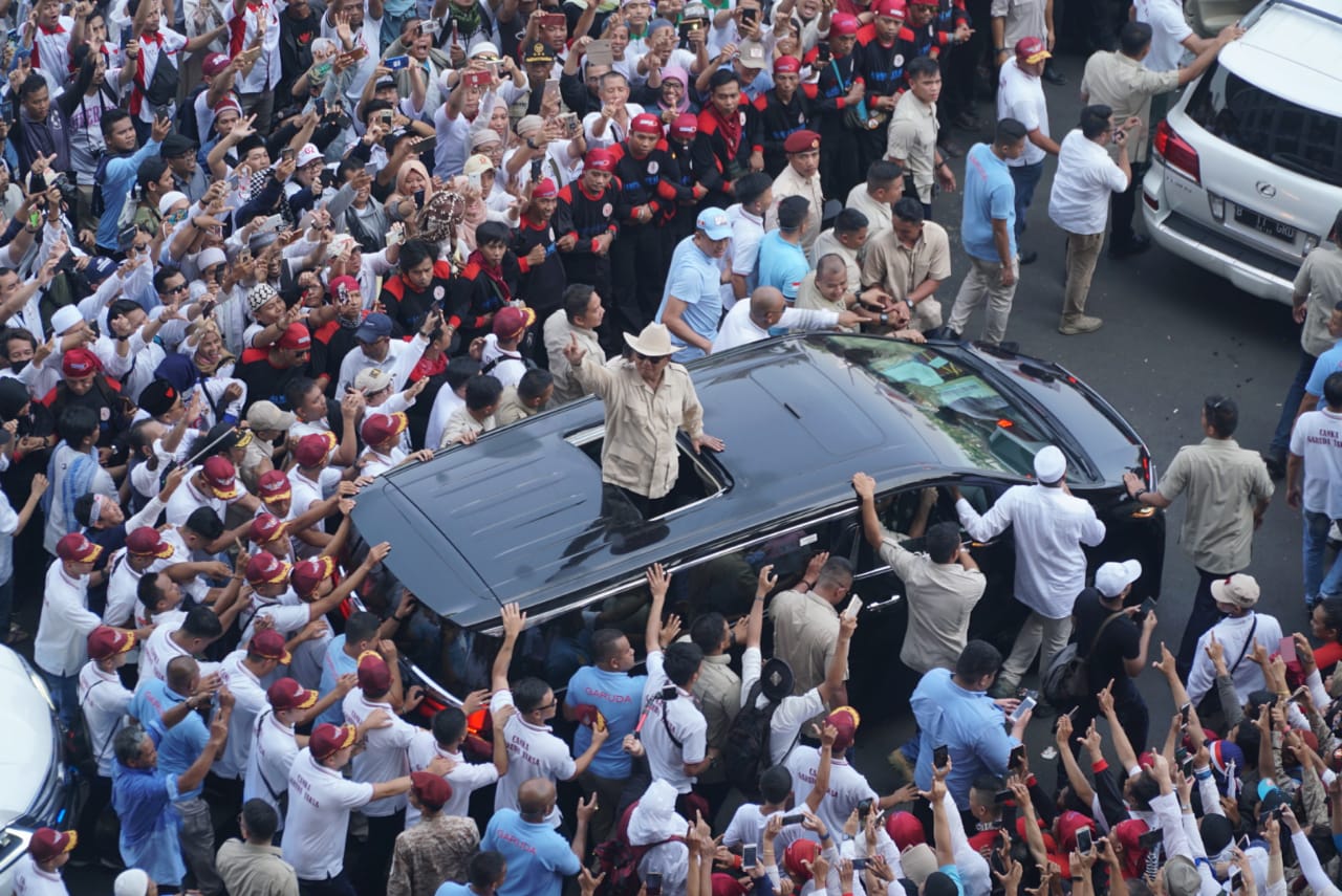 Capres nomor urut 02 Prabowo menyapa pendukungnya saat akan berpidato dalam rangka kampanye akbar di Stadion Utama Gelora Bung Karno, Jakarta, Minggu (7/4/2019). Kampanye akbar yang diawali dengan Solat Subuh berjemaah itu untuk menyampaikan visi-misi Prabowo-Sandiaga untuk Pemilu 2019. AKTUAL/STR-Eko S Hilman