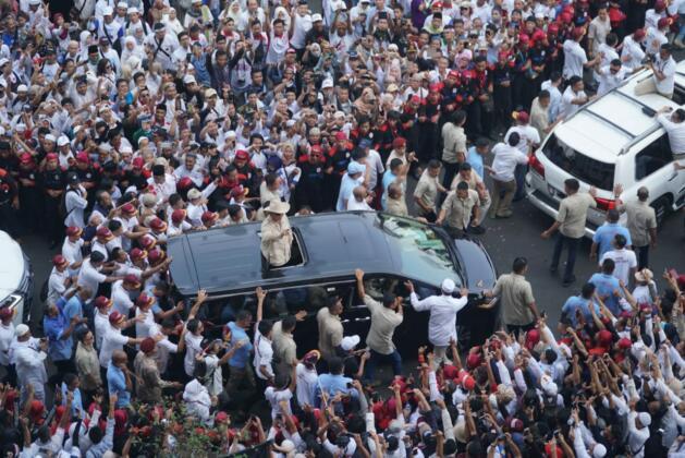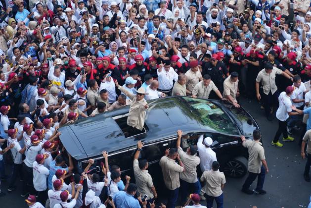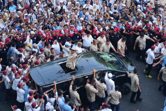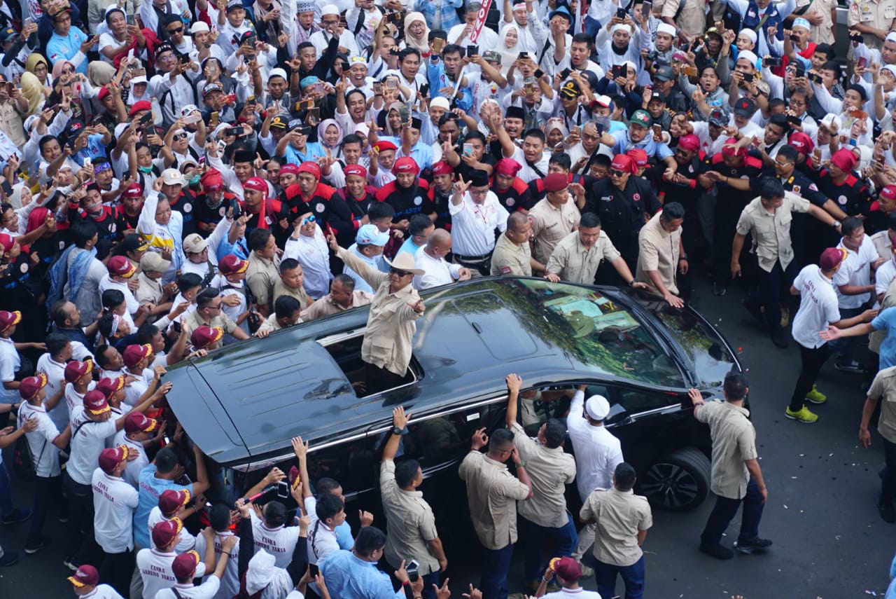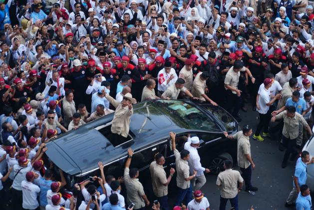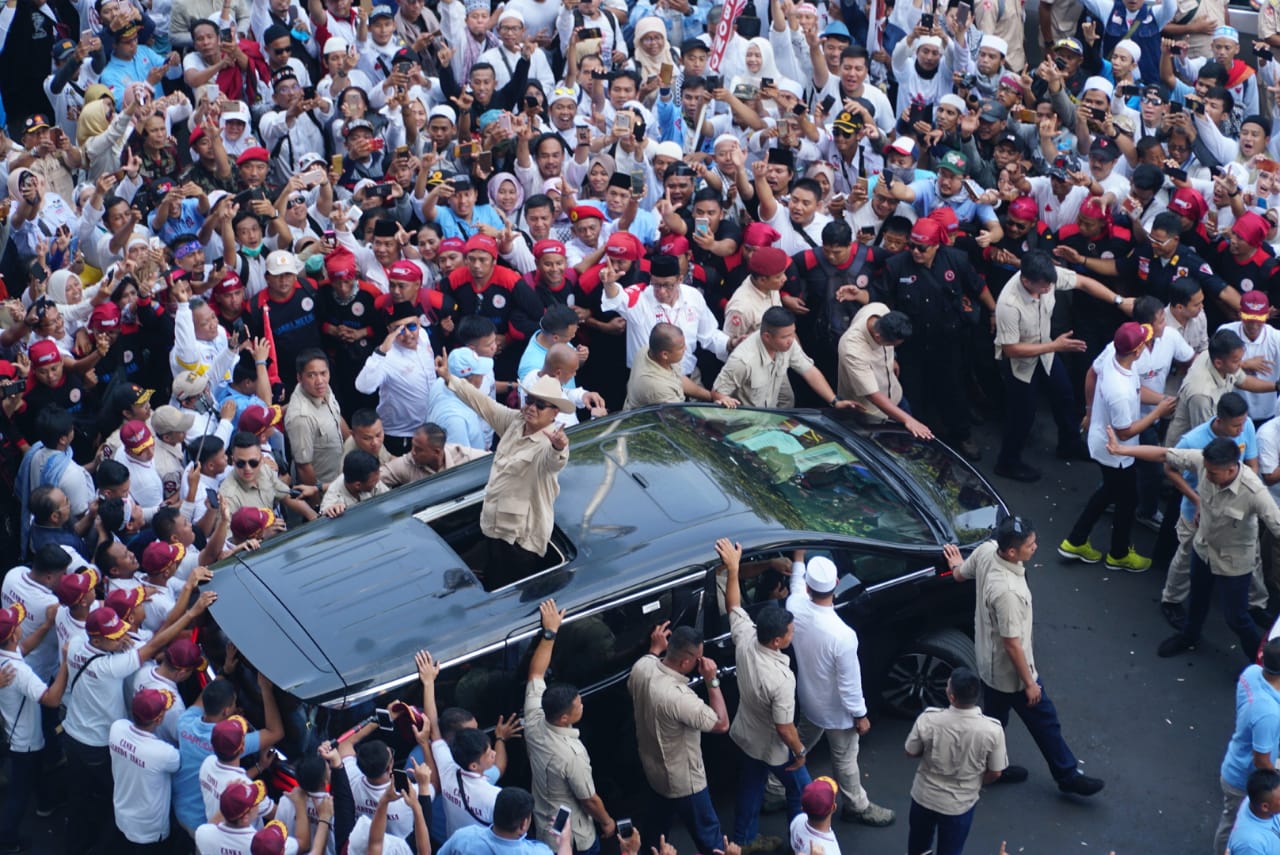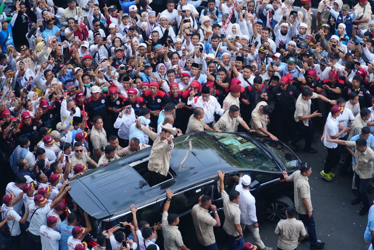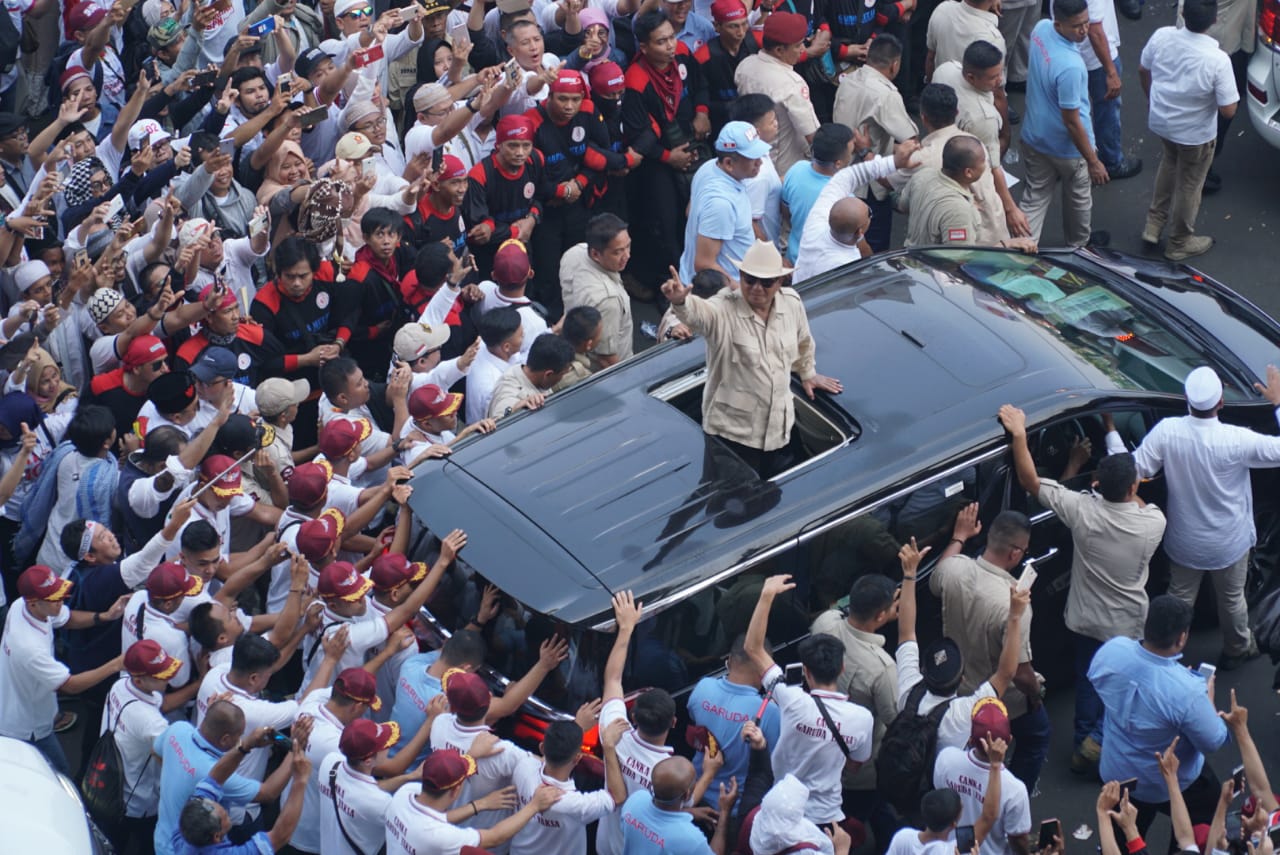Capres nomor urut 02 Prabowo menyapa pendukungnya saat akan berpidato dalam rangka kampanye akbar di Stadion Utama Gelora Bung Karno, Jakarta, Minggu (7/4/2019). Kampanye akbar yang diawali dengan Solat Subuh berjemaah itu untuk menyampaikan visi-misi Prabowo-Sandiaga untuk Pemilu 2019. AKTUAL/STR-Eko S Hilman