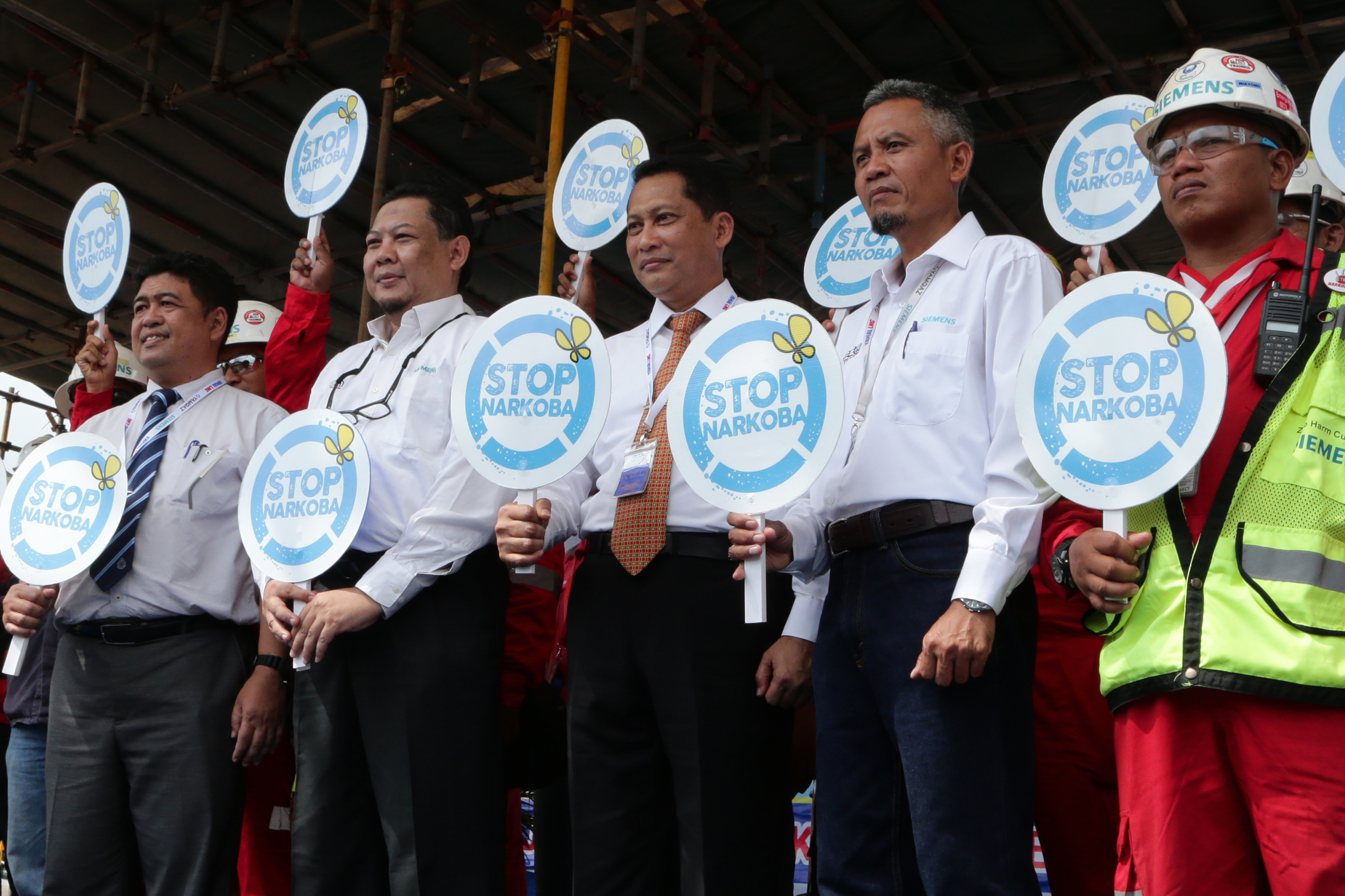 Kepala Badan Narkotika Nasional (BNN) Komjen Pol Budi Waseso (tengah) didampingi Kepala BNN Provinsi Kepri Kombes Pol Benny Setiawan (kiri) melakukan kampanye “Anti Narkoba” di Siemens Project Site PT Catur Eka Mandiri, Batam, Kepulauan Riau, Rabu (20/7). Selain kampanye “Anti Narkoba” Budi Waseso juga membuka Meeting Asean Seaport Intredection Task Force (ASITF) atau gugus tugas interdiksi pelabuhan Asean yang digagas Badan Narkotika Nasional (BNN). ANTARA FOTO/M N Kanwa/ama/16.