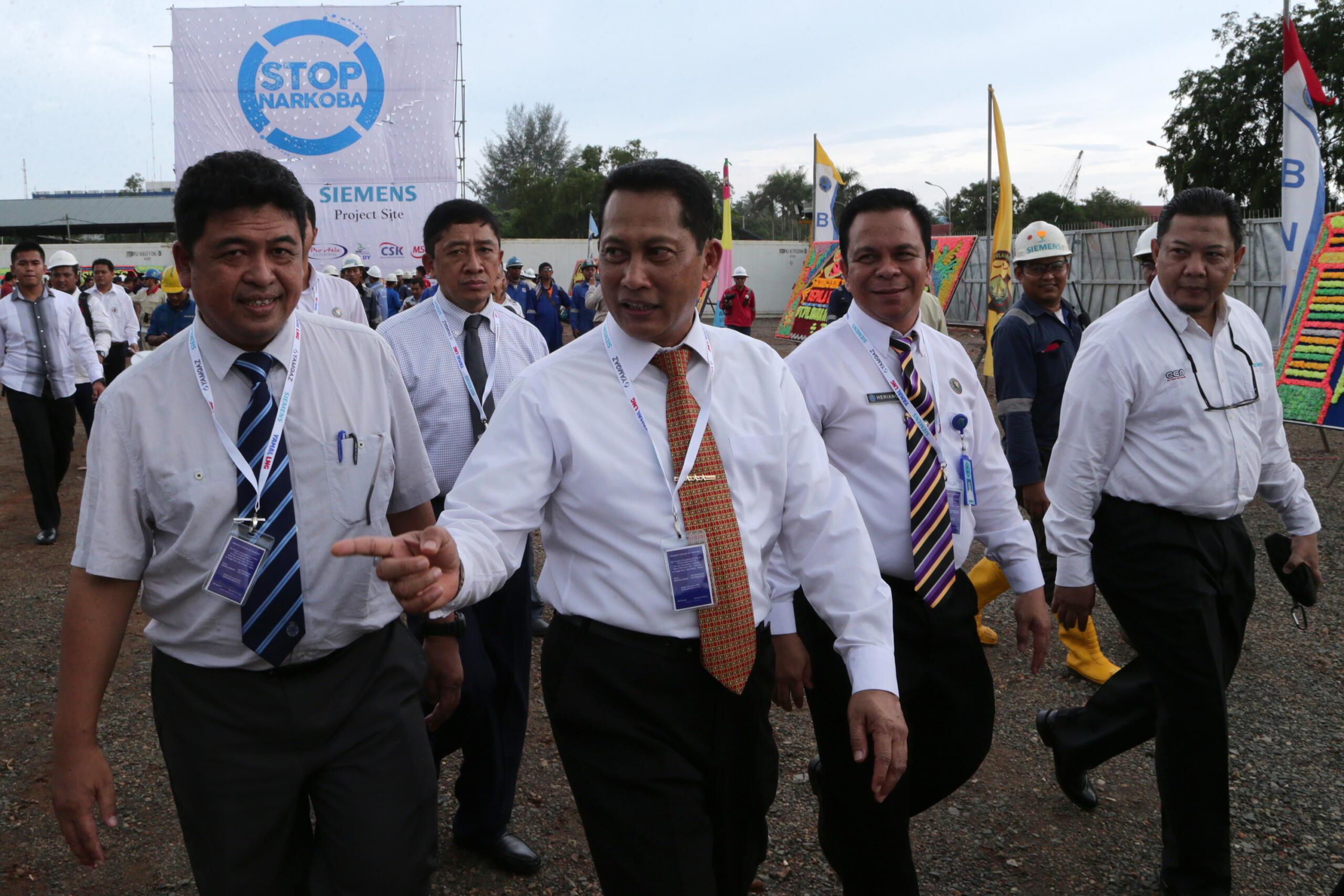 Kepala Badan Narkotika Nasional (BNN) Komjen Pol Budi Waseso (kedua kiri) didampingi Kepala BNN Provinsi Kepri Kombes Pol Benny Setiawan (kiri) berjalan bersama saat melakukan kampanye “Anti Narkoba” di Siemens Project Site PT Catur Eka Mandiri, Batam, Kepulauan Riau, Rabu (20/7). Selain kampanye “Anti Narkoba” Budi Waseso juga membuka Meeting Asean Seaport Intredection Task Force (ASITF) atau gugus tugas interdiksi pelabuhan Asean yang digagas Badan Narkotika Nasional (BNN). ANTARA FOTO/M N Kanwa/ama/16.