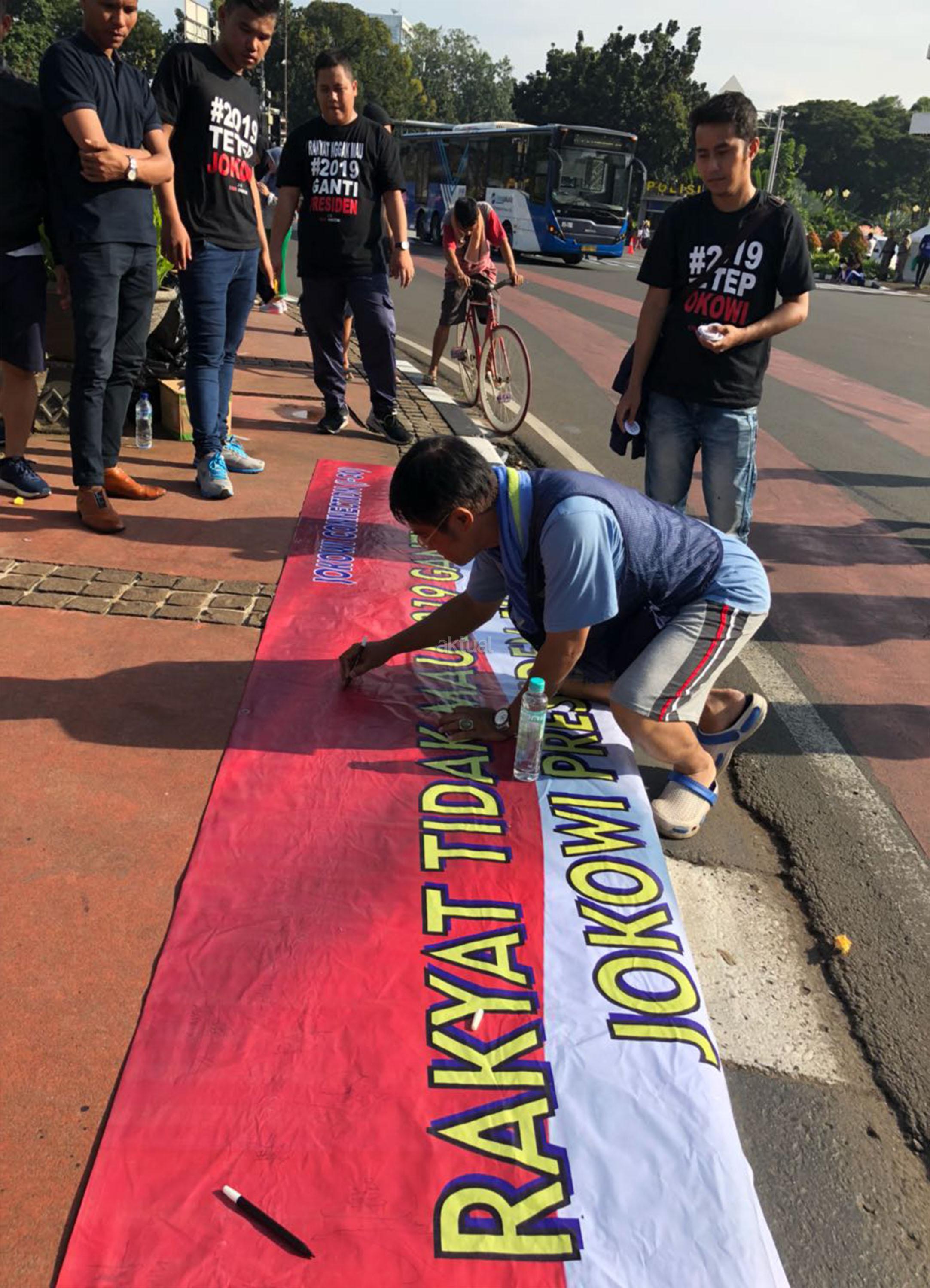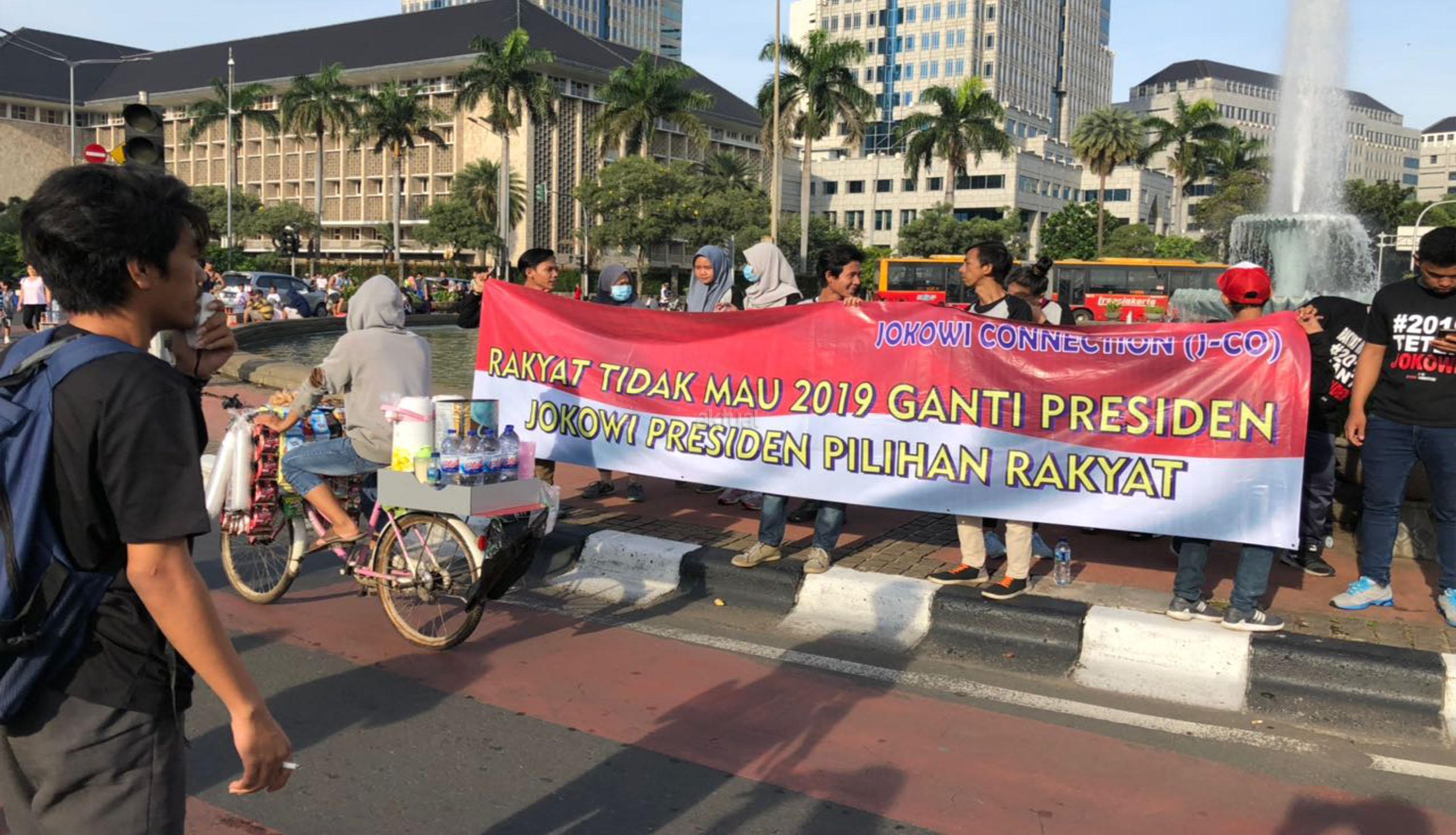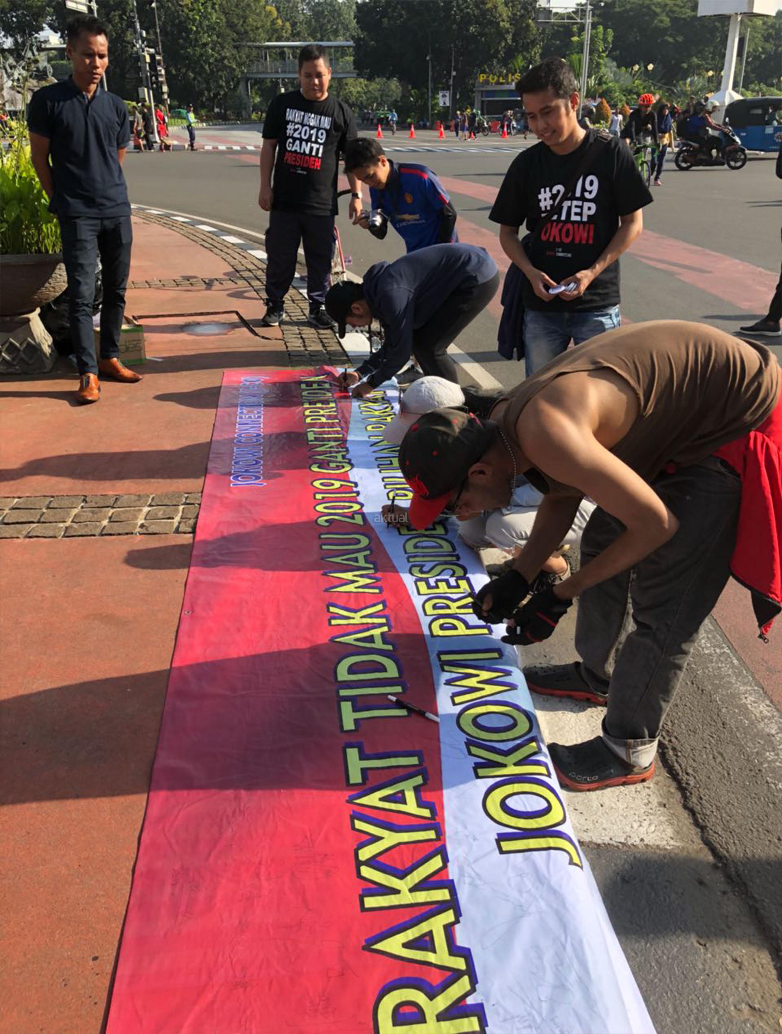 Massa dari Gerakan Jokowi Connection (J.co) melakukan aksi petisi tandatangan masyarakat car free day di kawasan Bundaran Patung Kuda, Jakarta, Minggu (8/4/18). Gerakan untuk melanjutkan memimpin dua periode bentuk dukungan moral kepada Presiden Jokowi untuk terus melakukan pembangunan agar NKRI menjadi negera bermartabat dan mensejahterahkan rakyat. AKTUAL/Tino Oktaviano