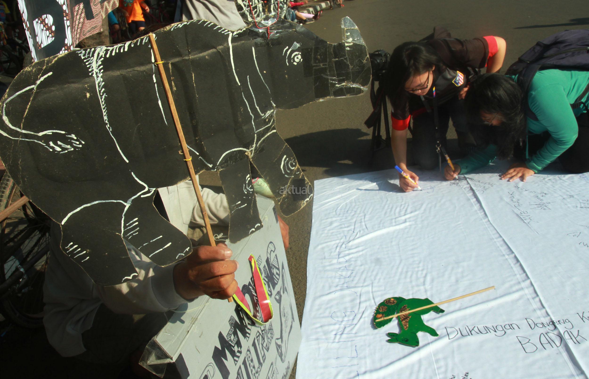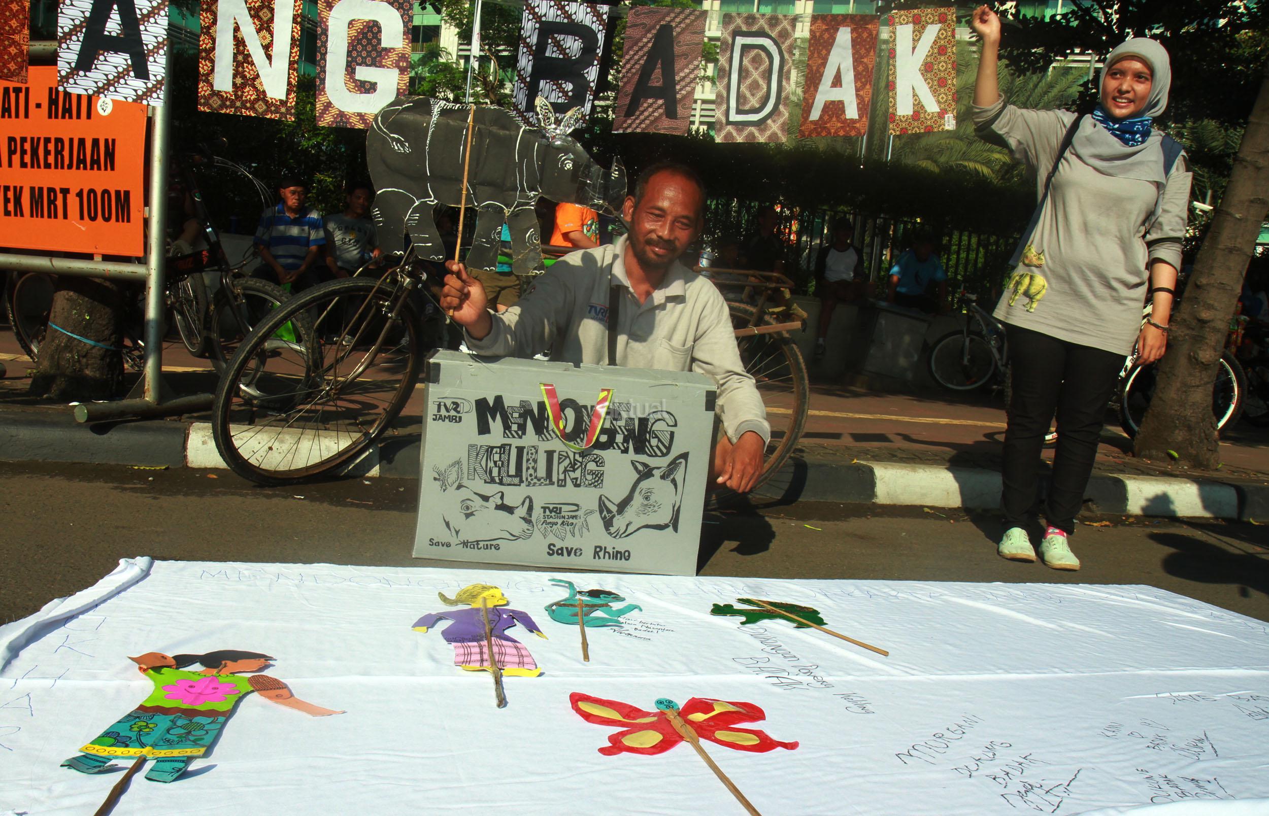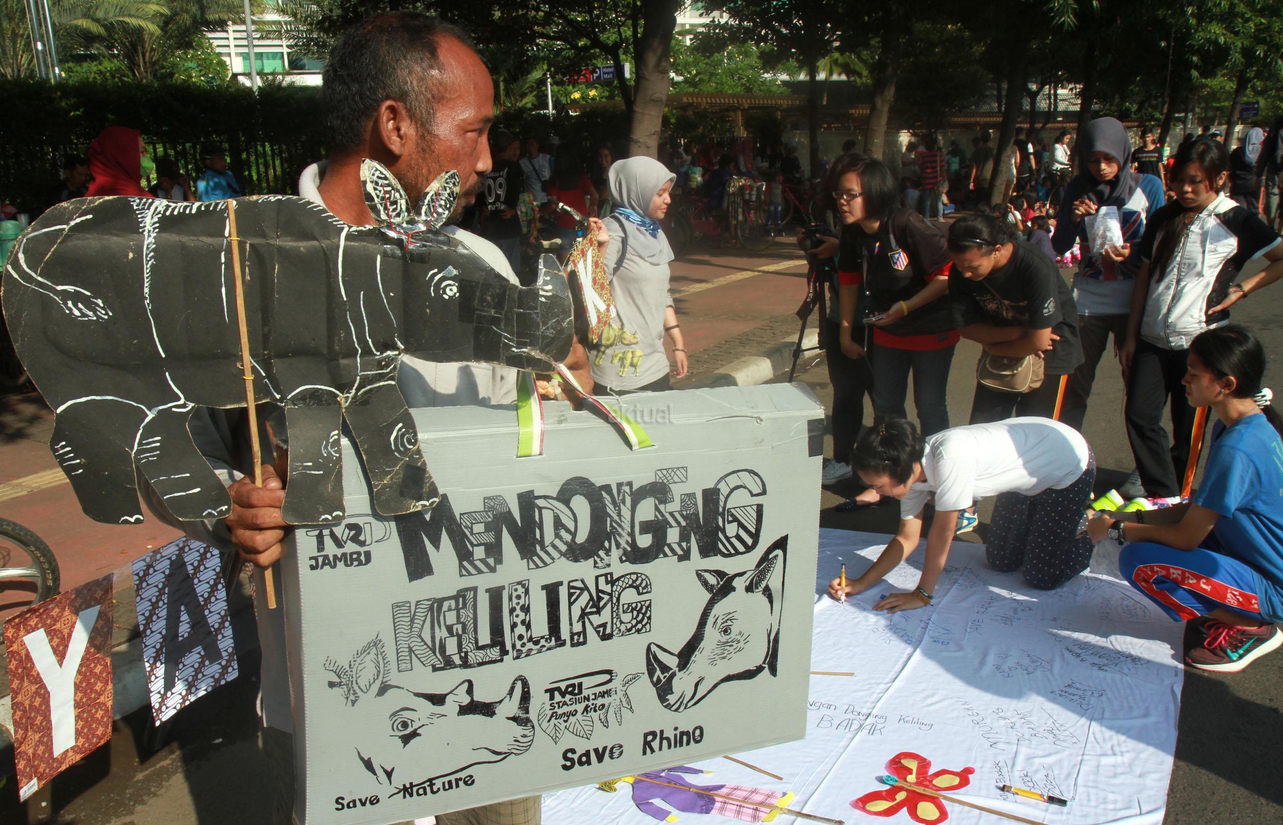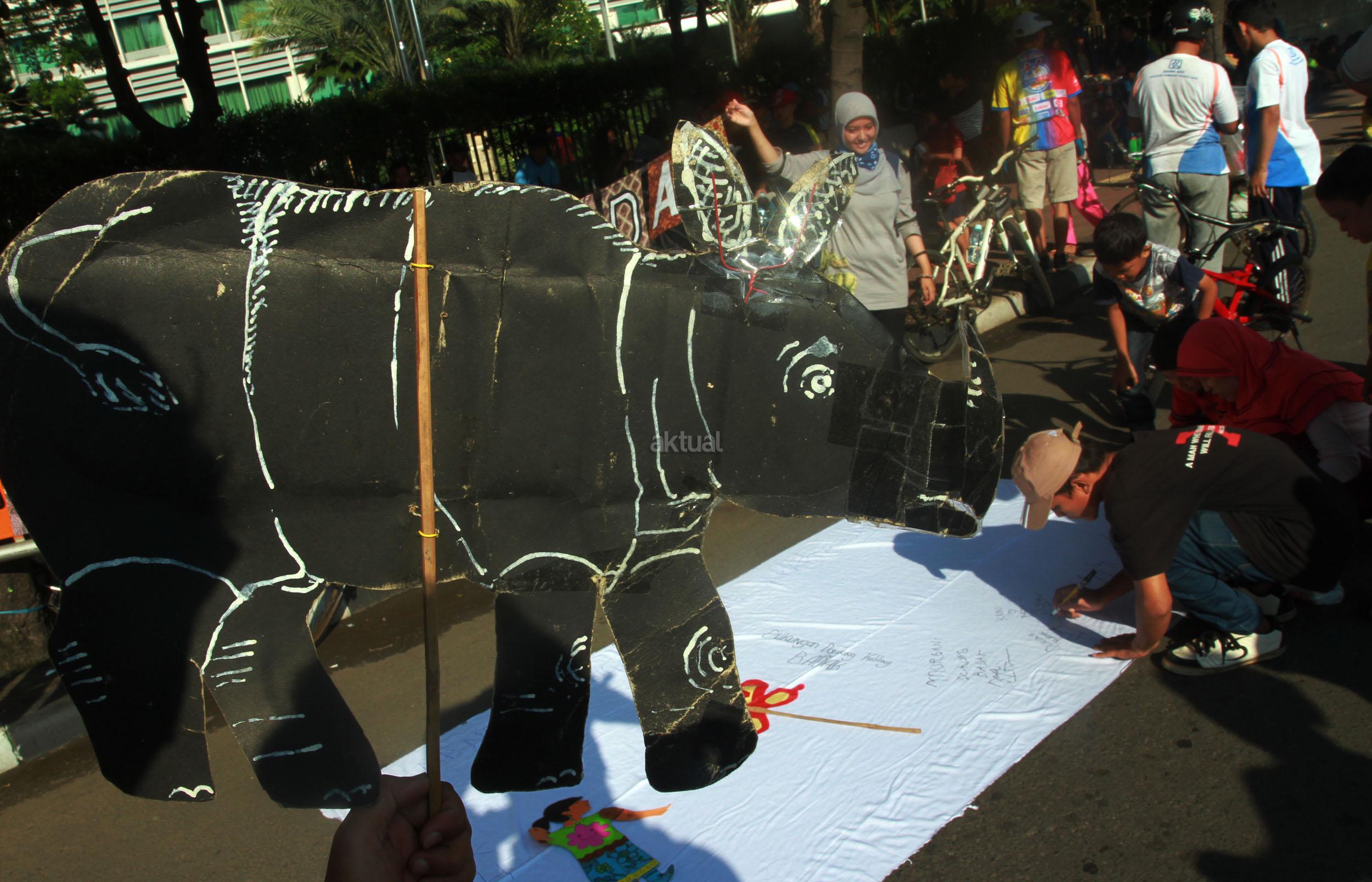 Sejumlah orang yang tergabung dari beberapa LSM menggelar aksi 'Kami Sayang Badak' saat Car Free Day di kawasan Bunderan HI, Jakarta, Minggu (27/3/2016). Aksi tersebut guna Memperingati hari bumi, serta mengkampanyekan binatang Badak yang hampir punah.