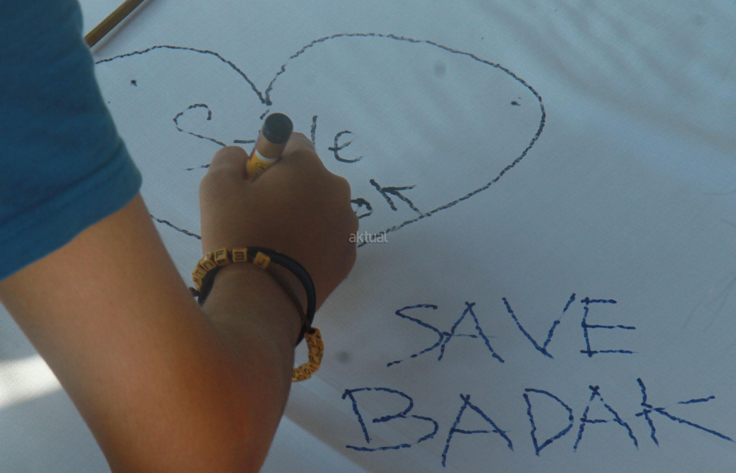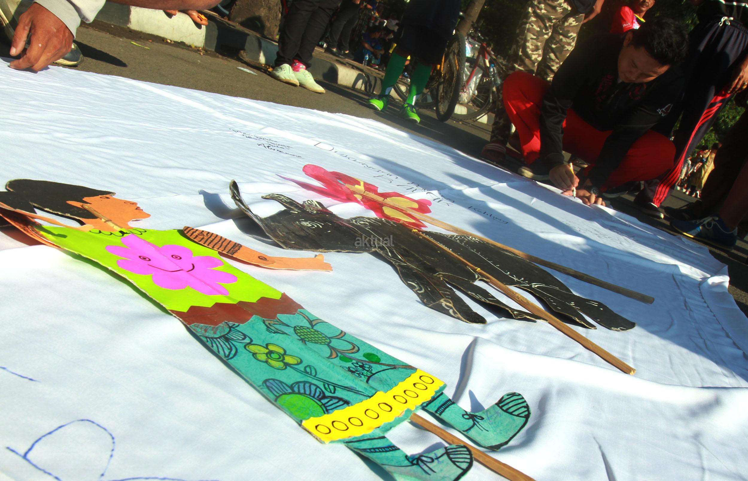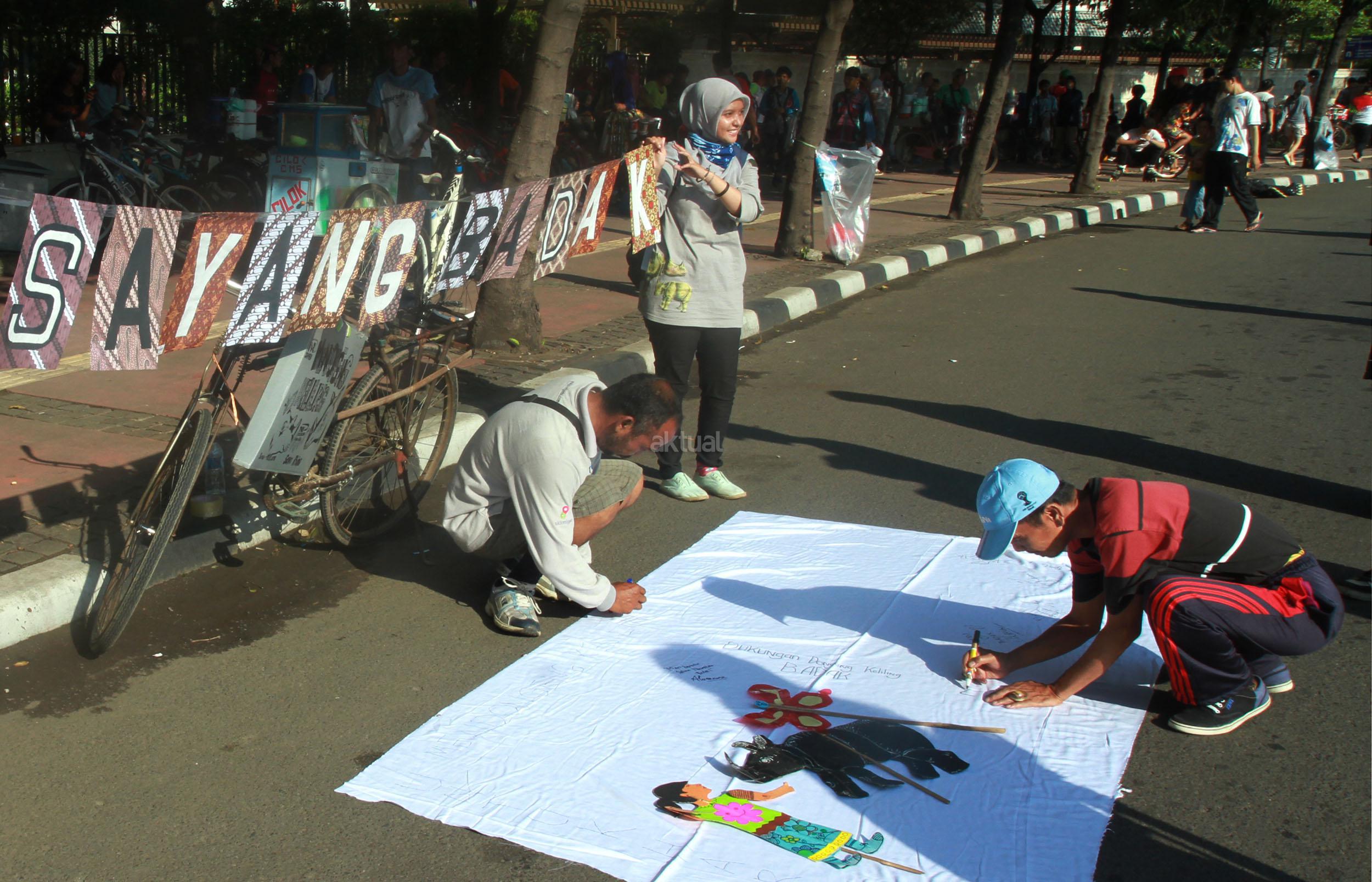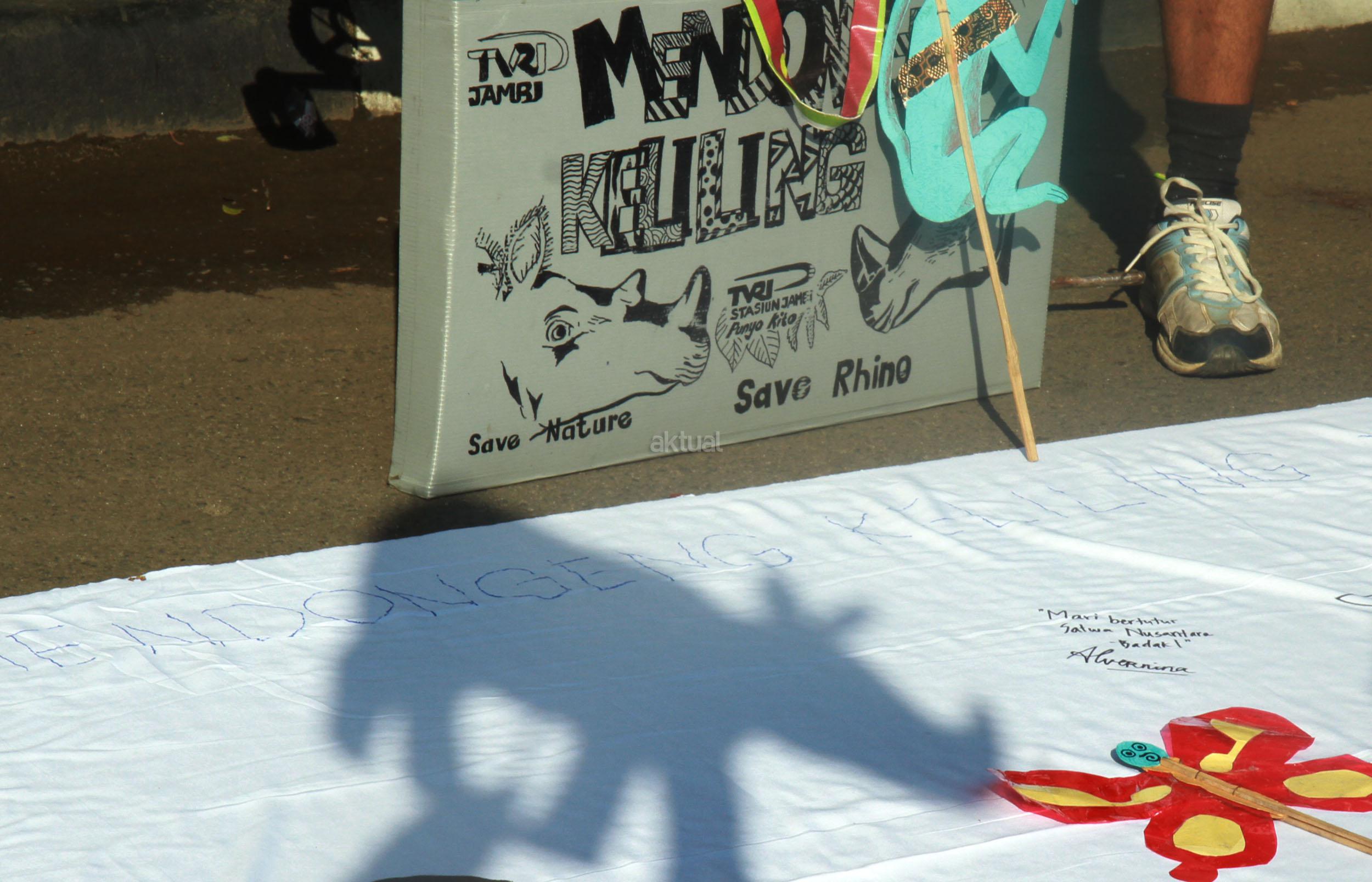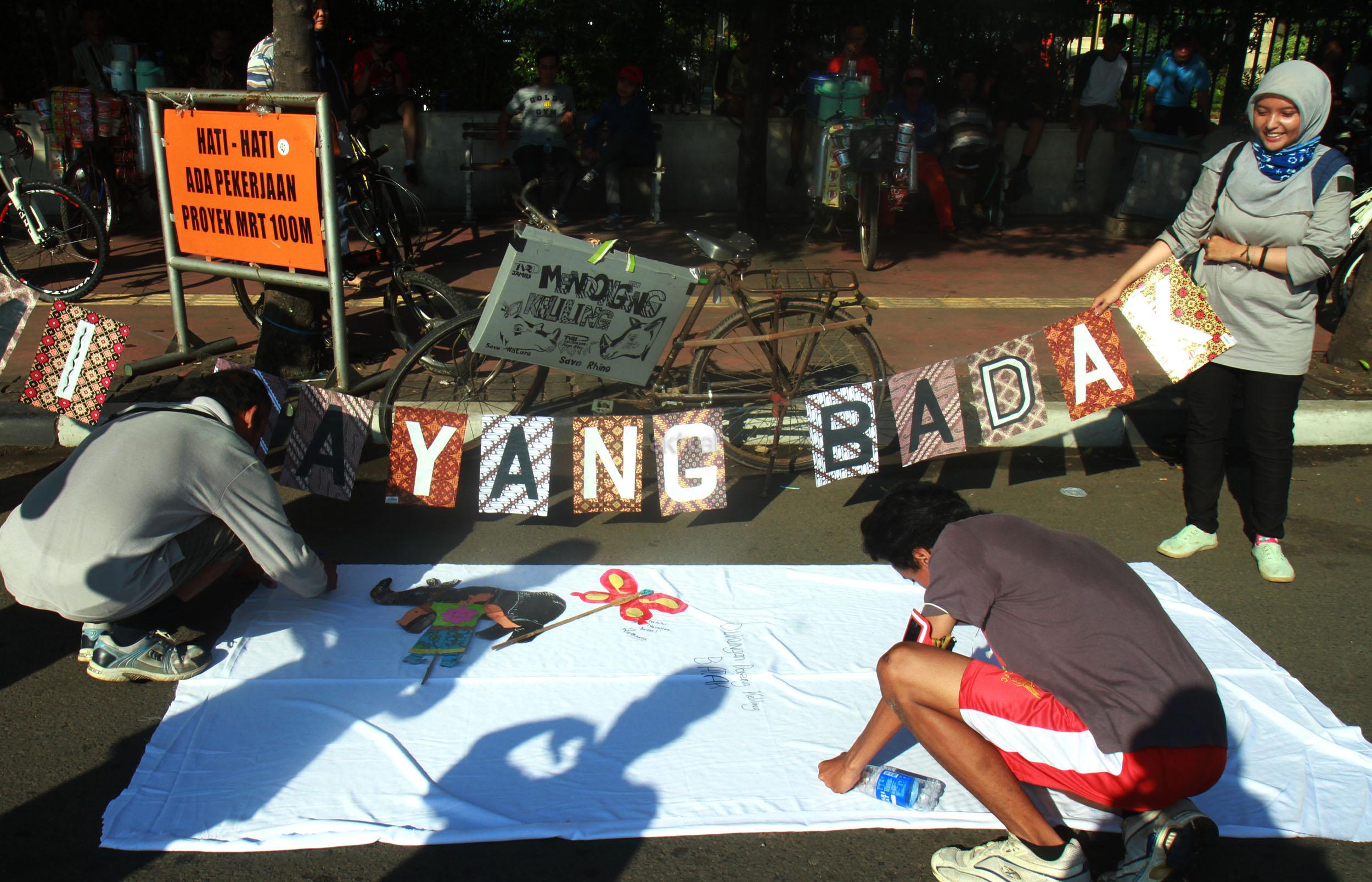 Sejumlah orang yang tergabung dari beberapa LSM menggelar aksi 'Kami Sayang Badak' saat Car Free Day di kawasan Bunderan HI, Jakarta, Minggu (27/3/2016). Aksi tersebut guna Memperingati hari bumi, serta mengkampanyekan binatang Badak yang hampir punah.