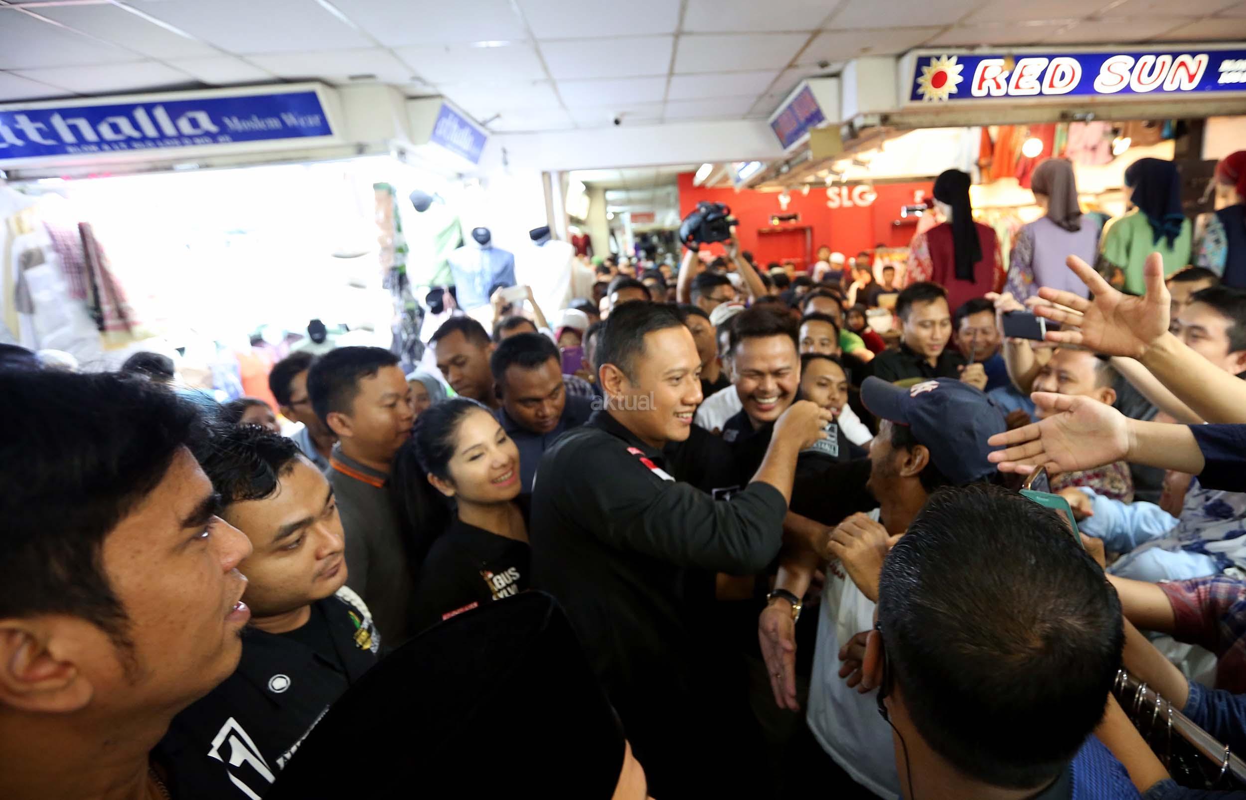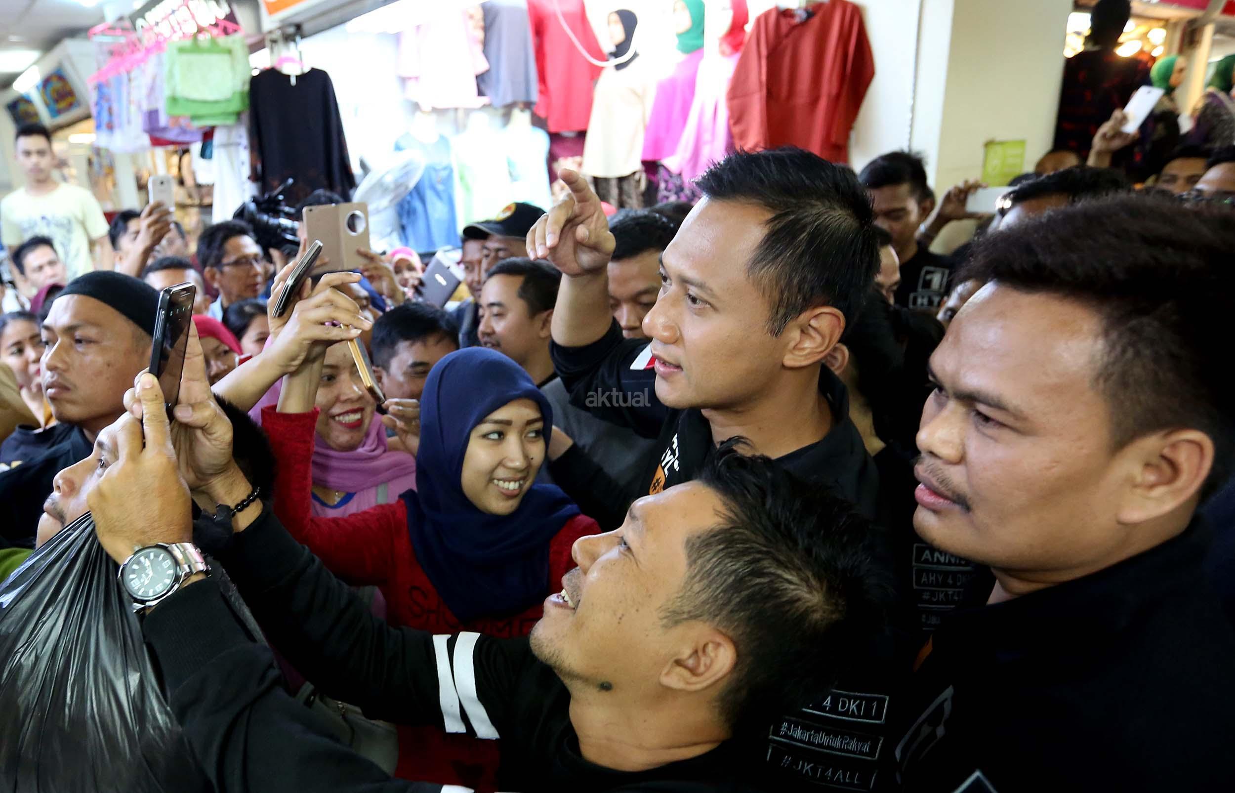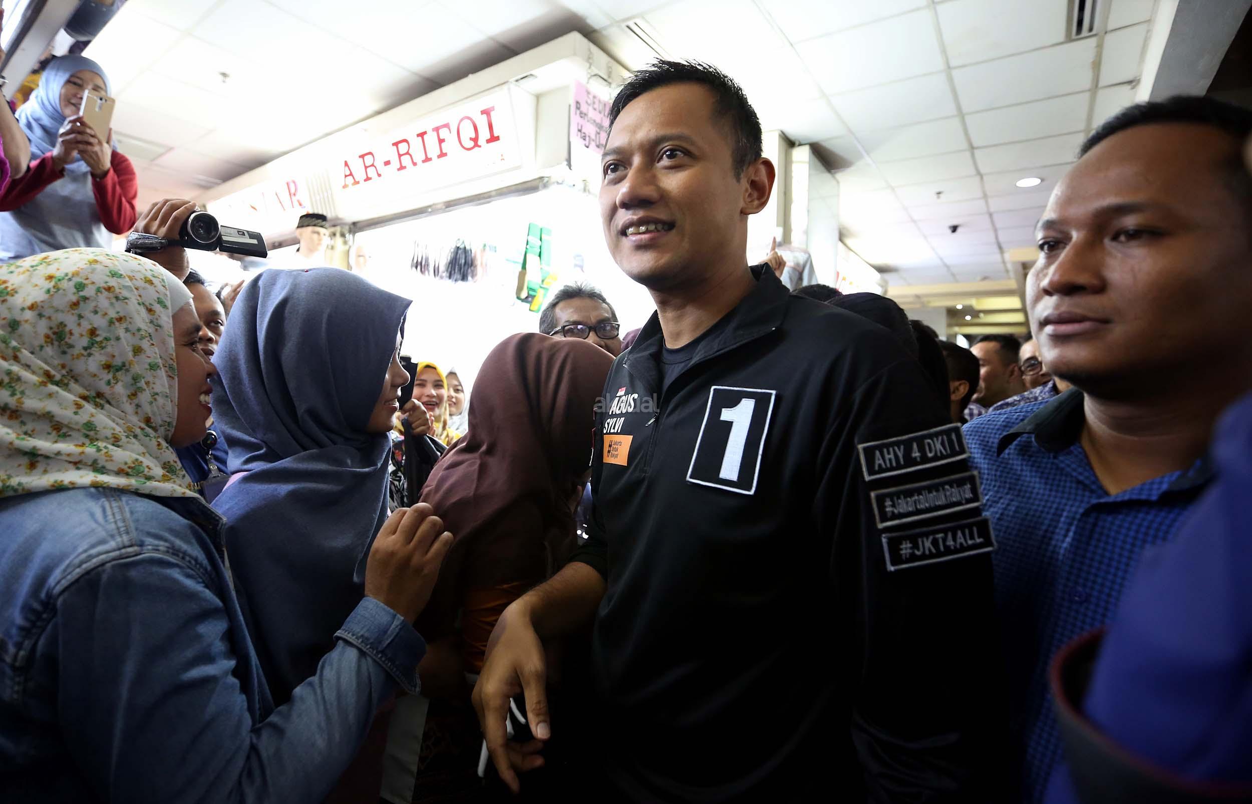 Calon Gubernur Jakarta Nomer Urut 1 Agus Harimurti Yudhoyono saat melakukan kampanye di Pasar Tanah Abang, Jakarta, Kamis (1/12/2016). Dalam kampanyenya Agus mendengarkan keluhan pedagang mengenai biaya sewa kios yang mahal. AKTUAL/Munzir