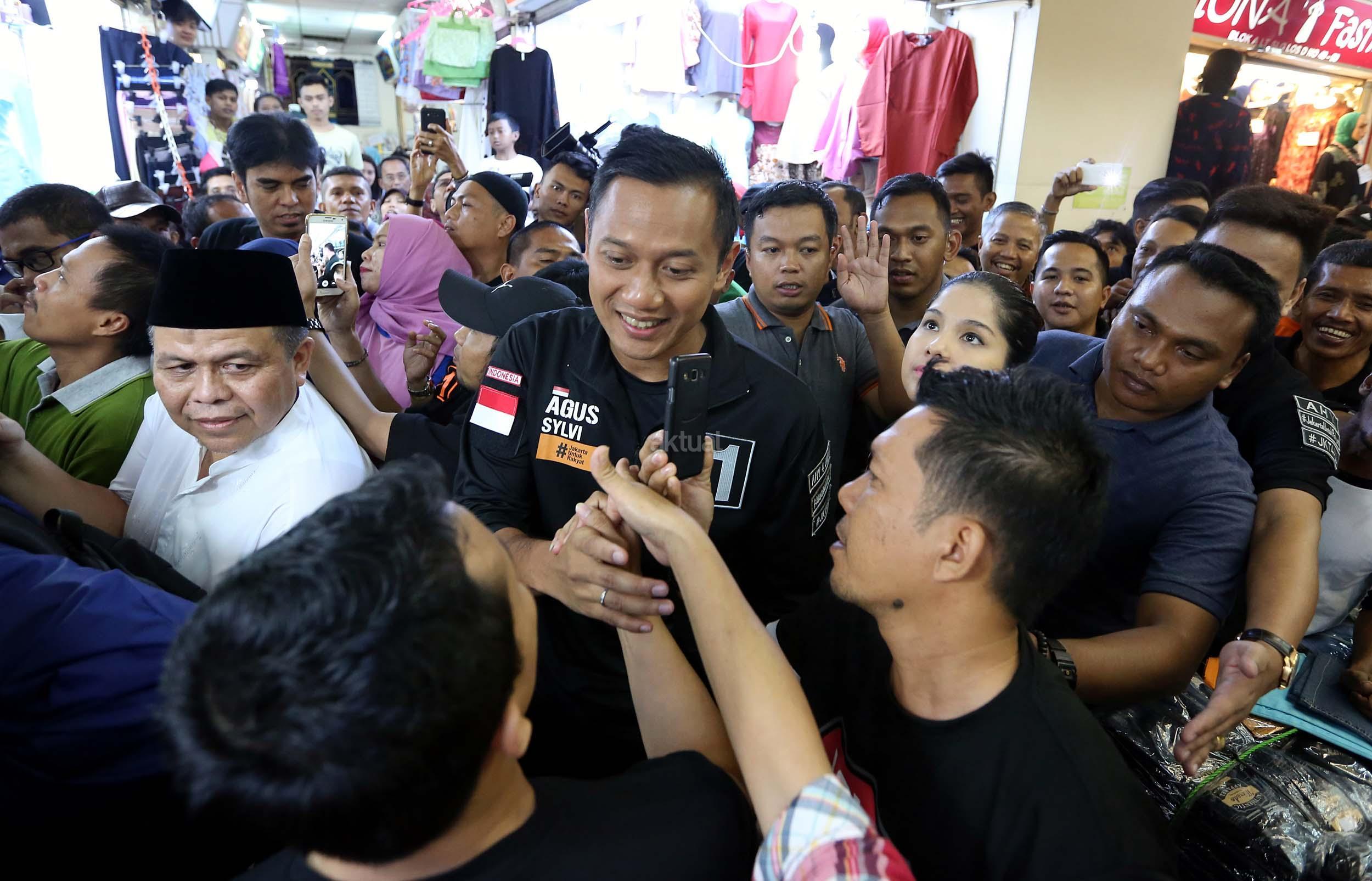 Agus Harimurti Yudhoyono bersalaman dengan para pedagang saat kampanye di Pasar Tanah Abang, Jakarta, Kamis (1/12/2016). Agus berjanji bila terpilih akan memikirkan solusinya dan meningkatkan fasilitas yang kurang di tanah abang. AKTUAL/Munzir