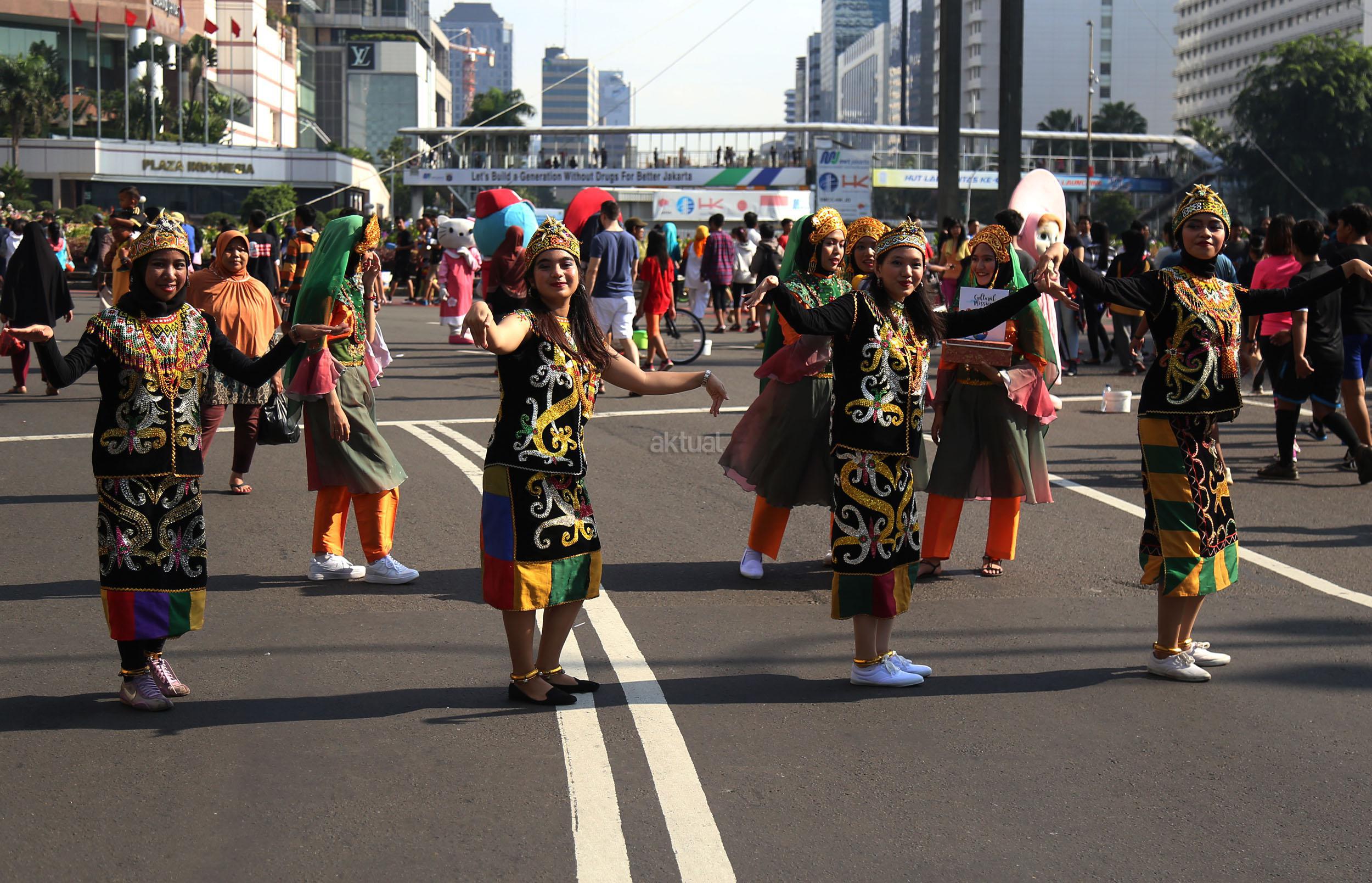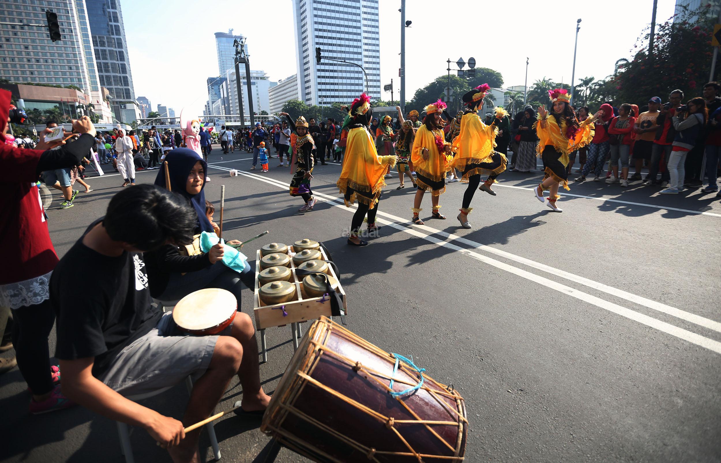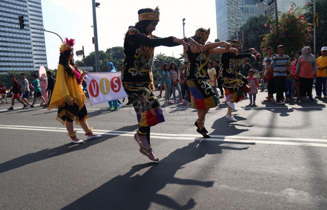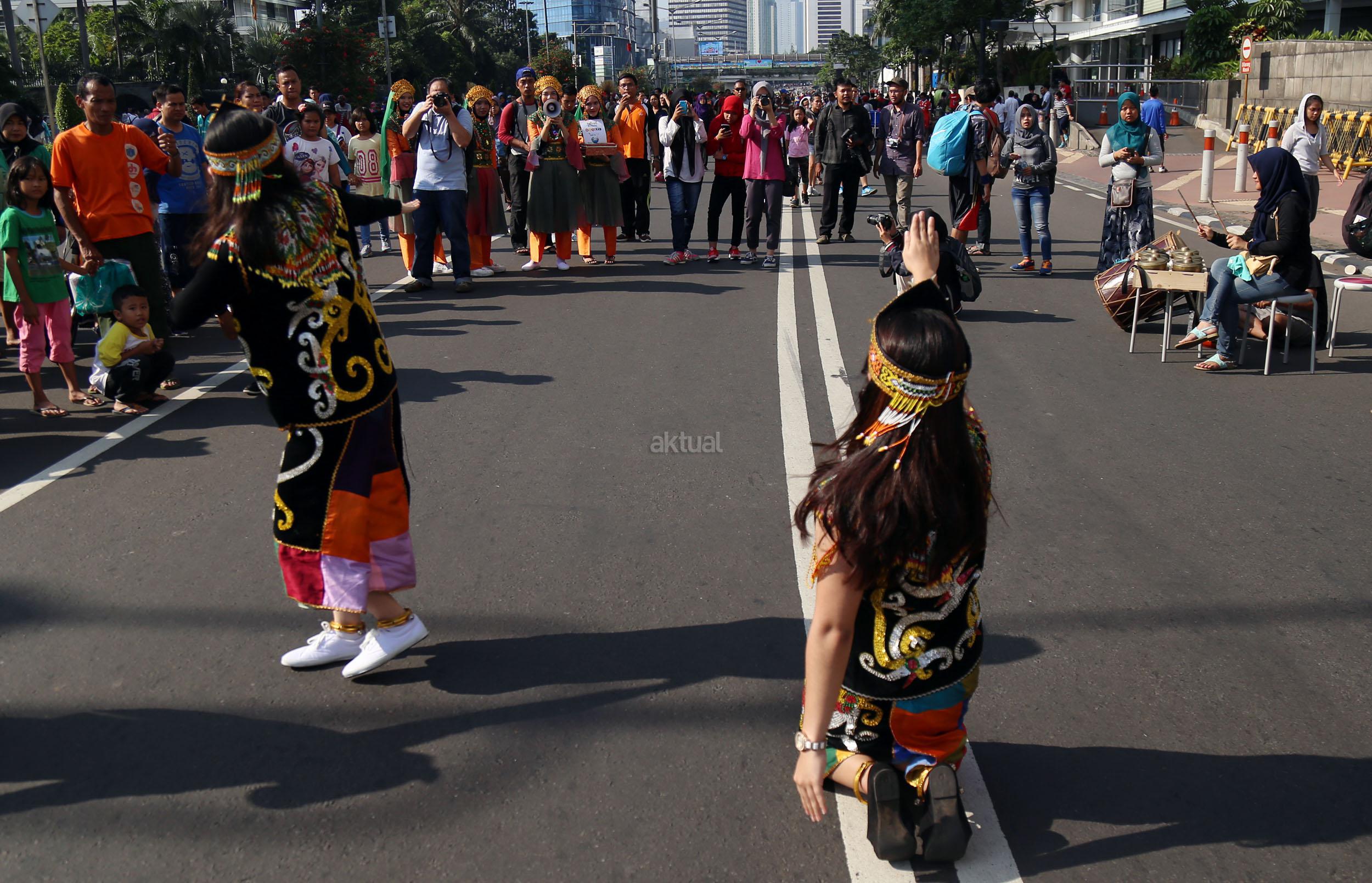 Puluhan mahasiswa Universitas Indonesia tergabung dalam Vokasi in anction traditional (Vistrad ) UI melakukan penggalangan dana di Car Free Day, Bunderan HI, Jakarta, Minggu (27/3/2016). Penggalangan dana untuk memperkenalkan budaya Indonesia dalam acara festival Prancis 2016.