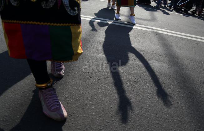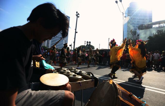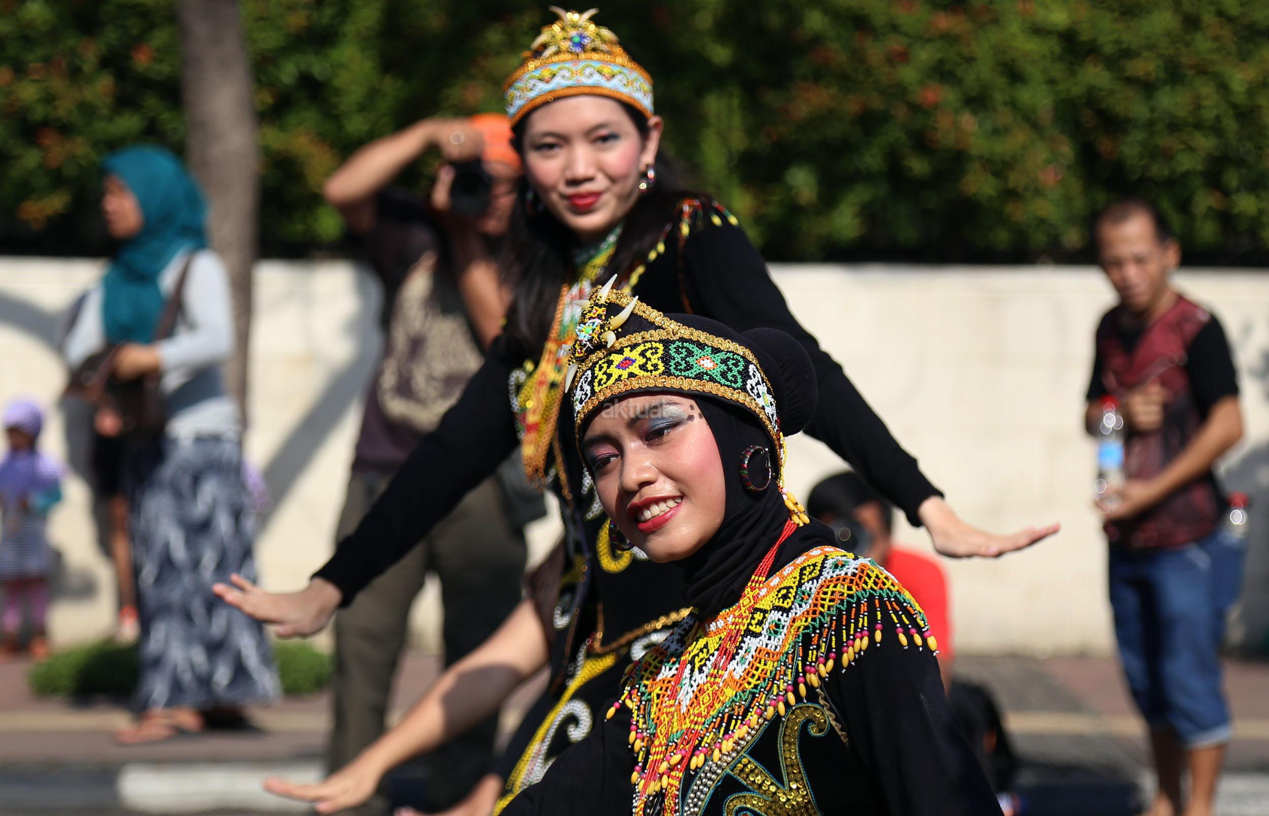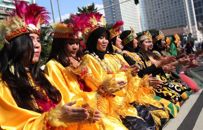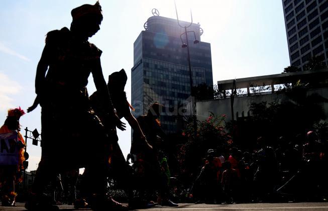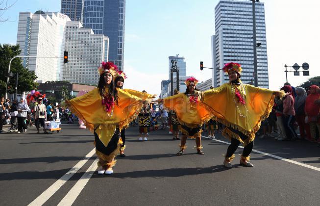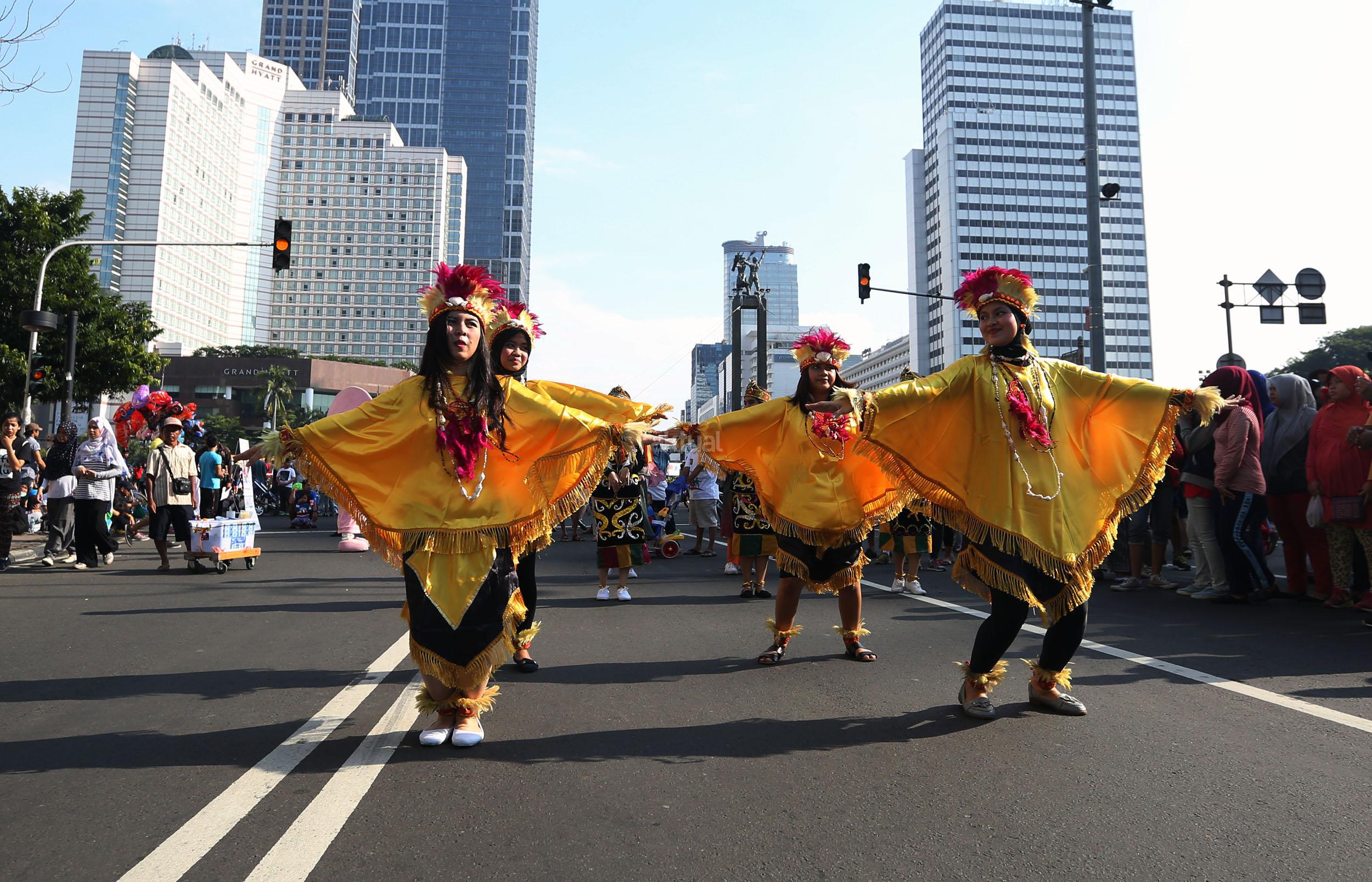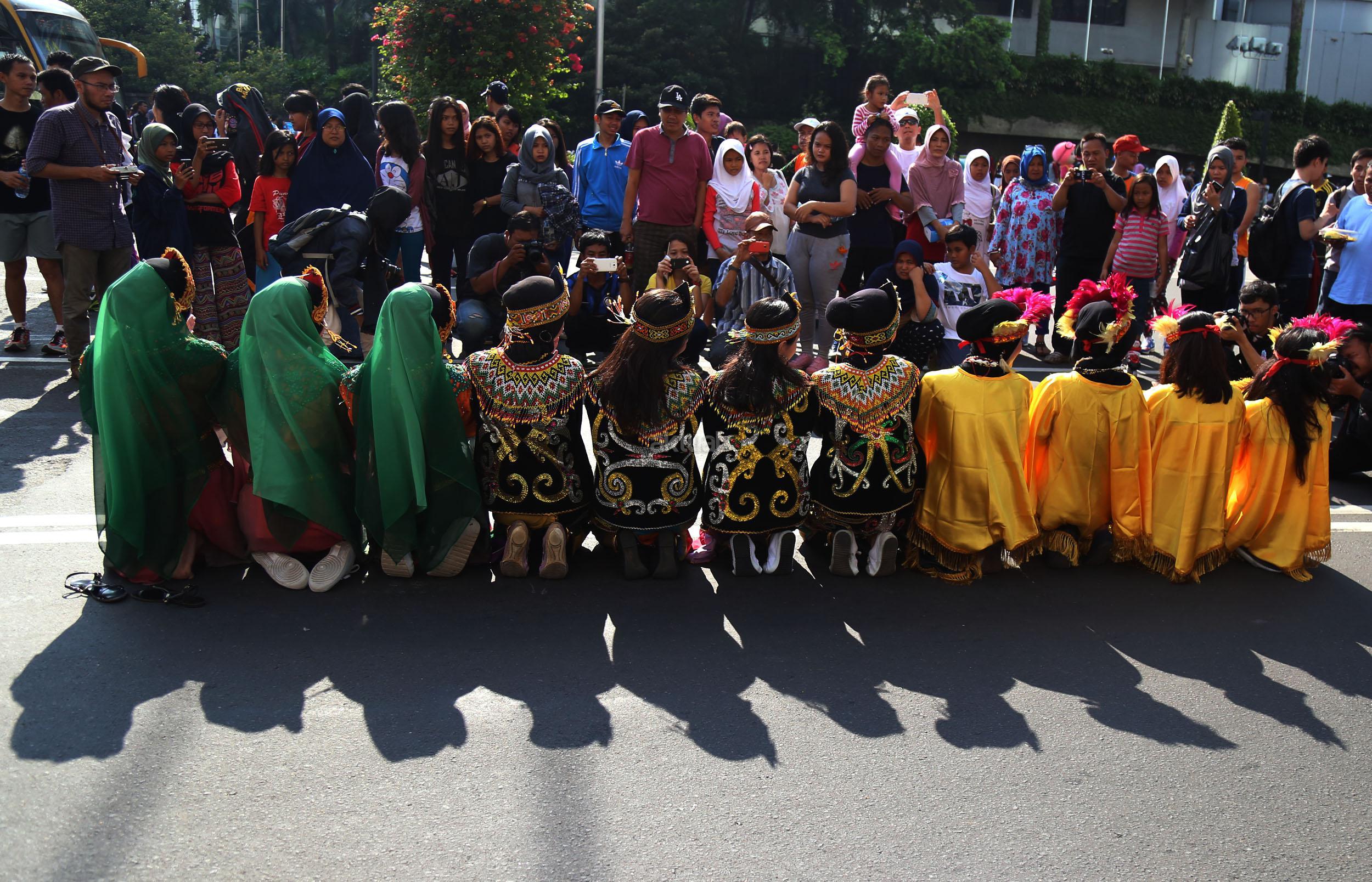 Puluhan mahasiswa Universitas Indonesia tergabung dalam Vokasi in anction traditional (Vistrad ) UI melakukan penggalangan dana di Car Free Day, Bunderan HI, Jakarta, Minggu (27/3/2016). Penggalangan dana untuk memperkenalkan budaya Indonesia dalam acara festival Prancis 2016.