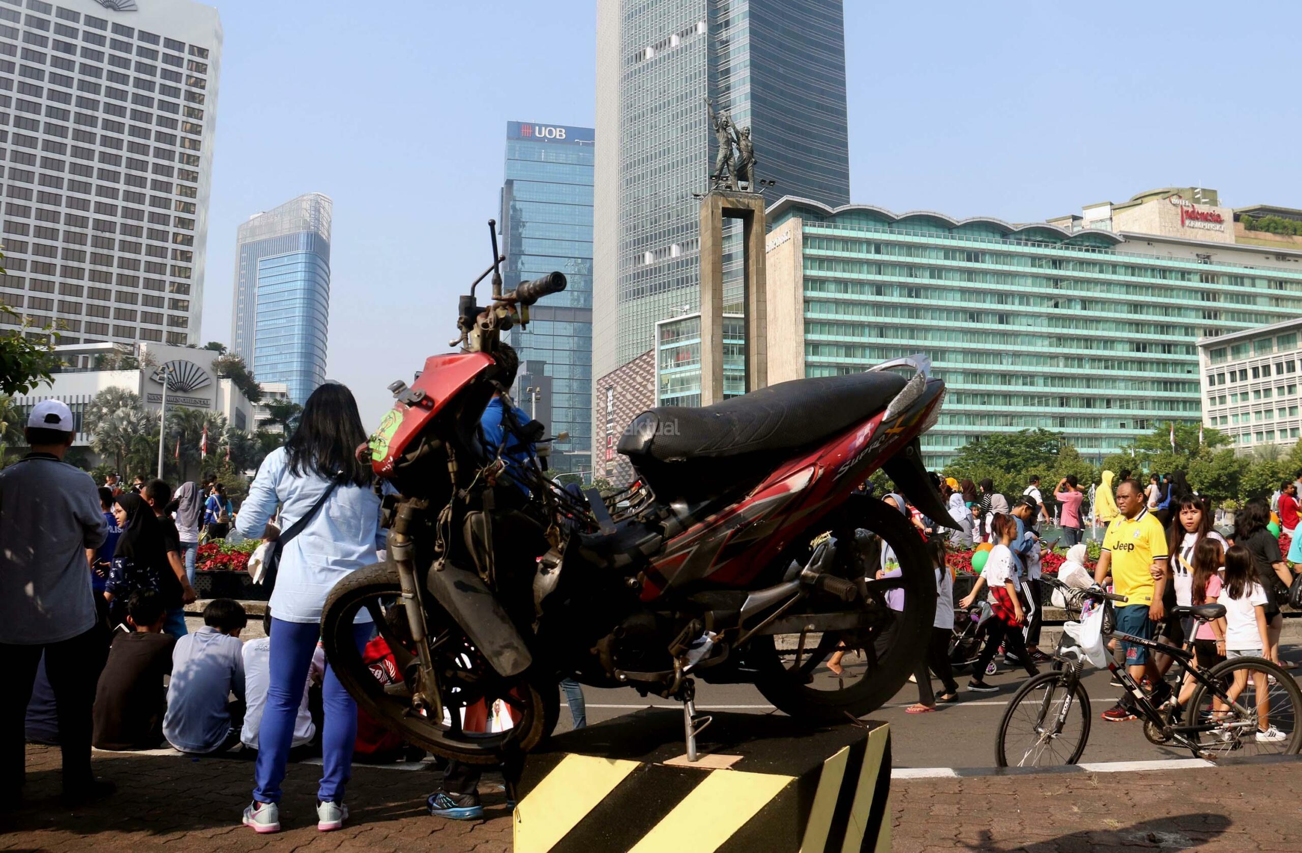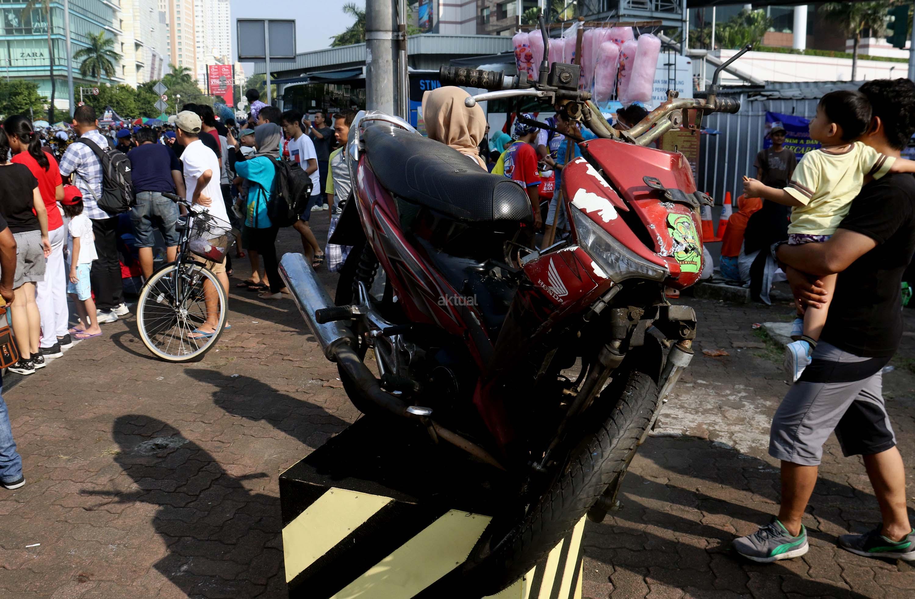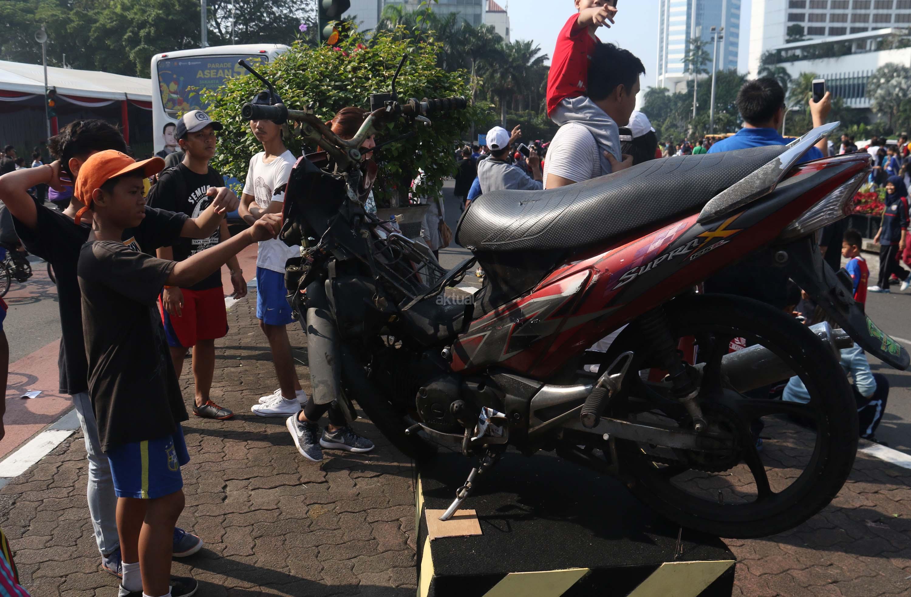 Seorang pengunjung melihat sepeda motor ringsek saat acara Tahun Keselamatan 2017-2018 di Bundaran HI, Jakarta, Minggu (30/7/2017). Kampanye ini untuk mengajak masyarakat untuk tidak melakukan pelanggaran lalu lintas, berkendara dengan baik dan tertib berlalu linta dan menghentikan tingginya angka kecelakaan. AKTUAL/Munzir