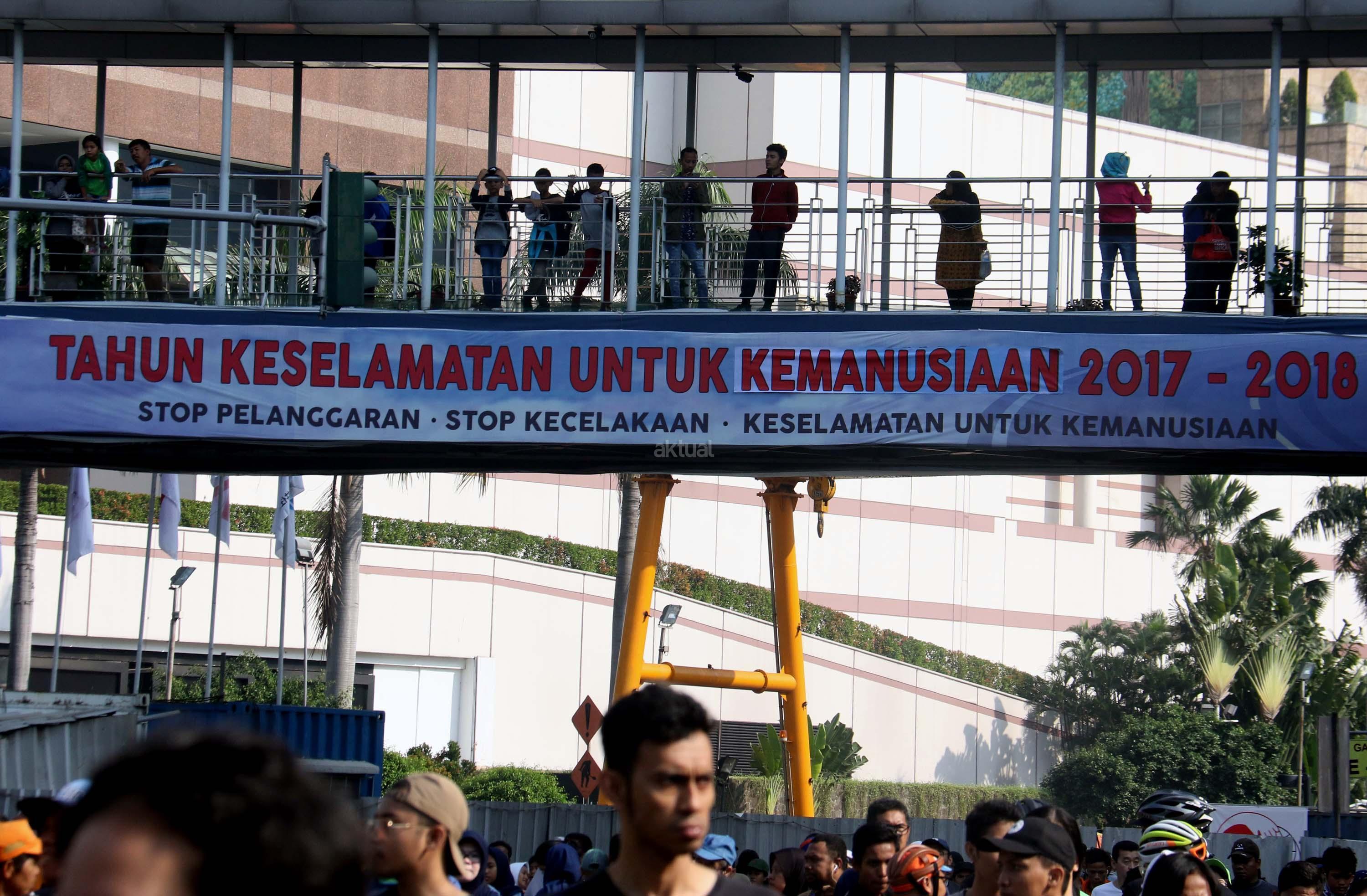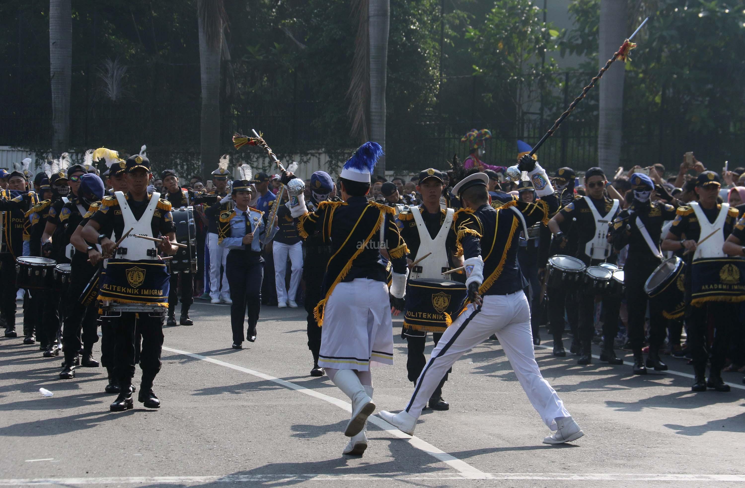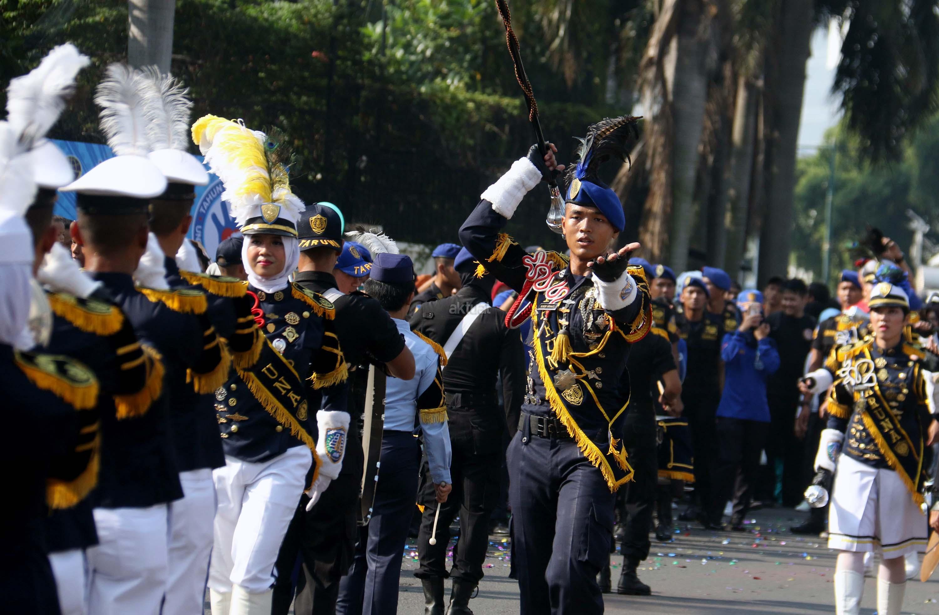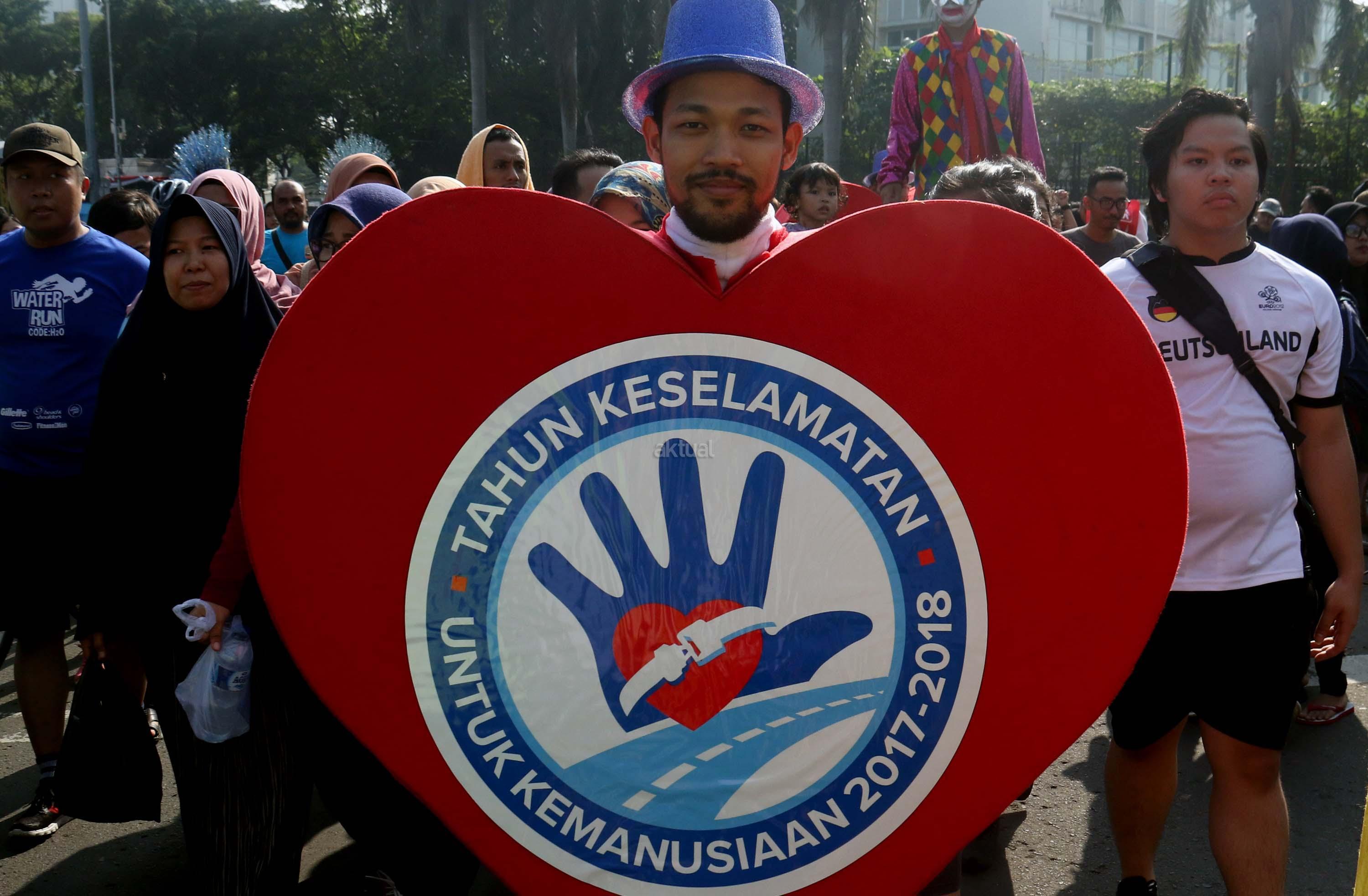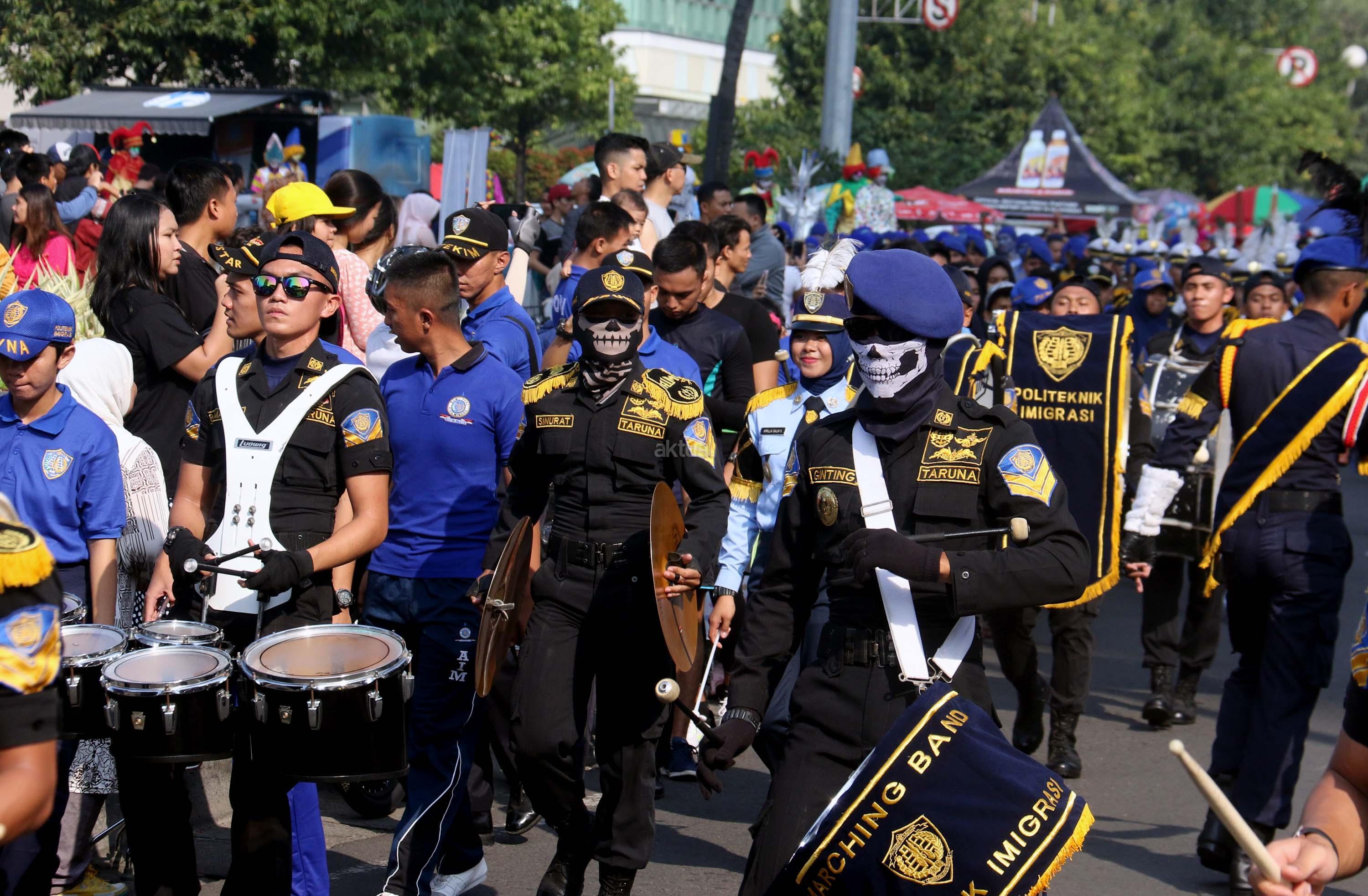 Aksi marching band saat memeriahkan acara Tahun Keselamatan 2017-2018 di Bundaran HI, Jakarta, Minggu (30/7/2017). Kampanye ini untuk mengajak masyarakat untuk tidak melakukan pelanggaran lalu lintas, berkendara dengan baik dan tertib berlalu linta dan menghentikan tingginya angka kecelakaan. AKTUAL/Munzir